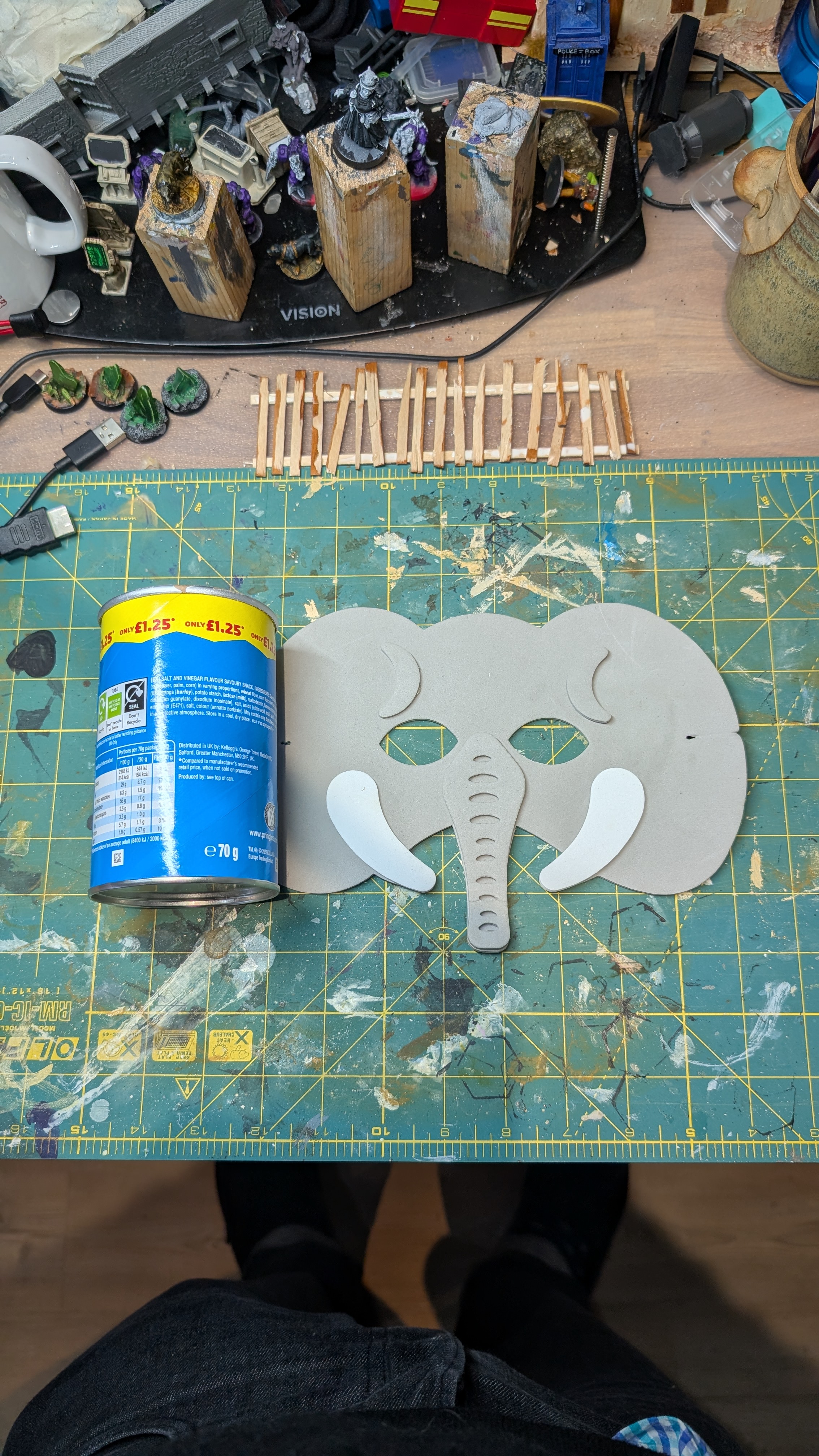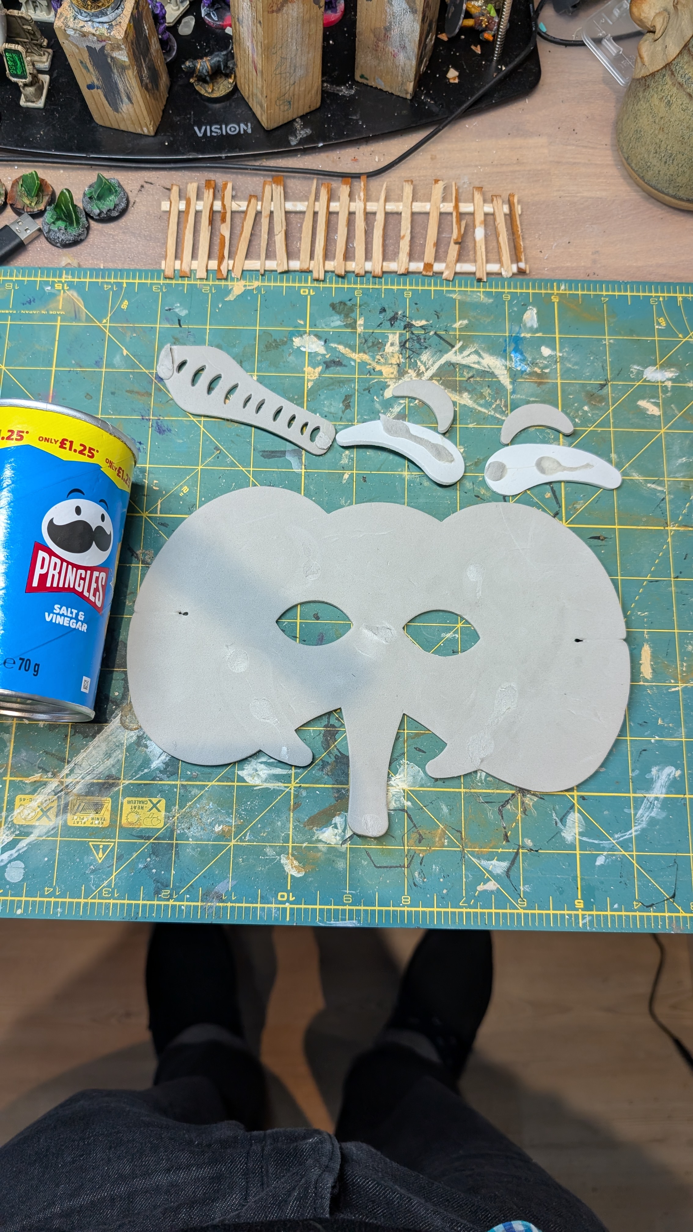 I thought I’d adapt the ‘texture on the playmat’ technique to an EVA mask that came in a party bag at one time. I stripped off the tusks and trunk, to make a single layer of EVA, then I hacked at a small pringles tube to make a shape that could be covered by most of the elephant mask.