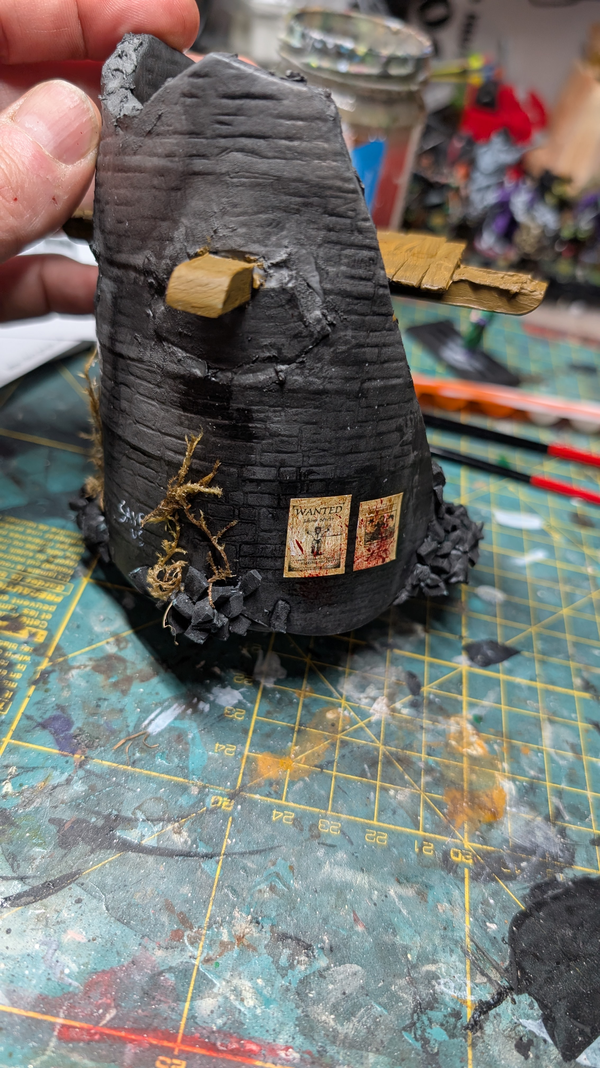 Craft paints were used to paint the tower, then I added come Mordheim graffiti, posters, moss vines and blood splats. I think it looks pretty good.
