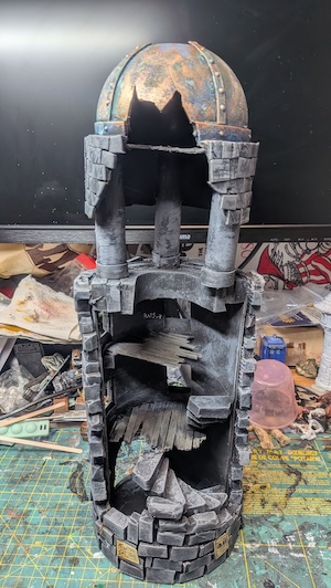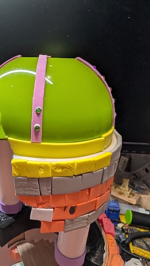 A band of thin EVA hid the join, and I used old plastic pipe knocking around in the garage to make pillars to join this roof to the main body of the tower.