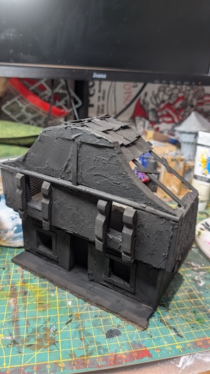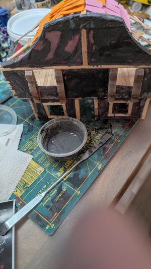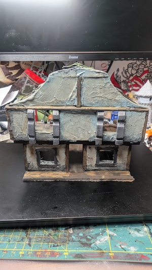 I didn’t go for the heat and roller to add texture this time, but rather the age old method of slathering the building with a slurry of thin polyfila mixed with PVA and craft paints. Once that was dry I used more craft paints to add a bit of colour.