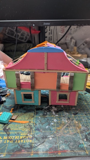 Windows were either cut out, or assembled from smaller rectangles, with the edges hidden with more coffee sticks or wooden pegs. A gable was added using the curved shape of one of the off-cuts, rafters were even more coffee sticks and roof tiles were added with cut up very thing EVA shapes (I’ve no idea where they came from, but there were collected from the kids craft supplies).