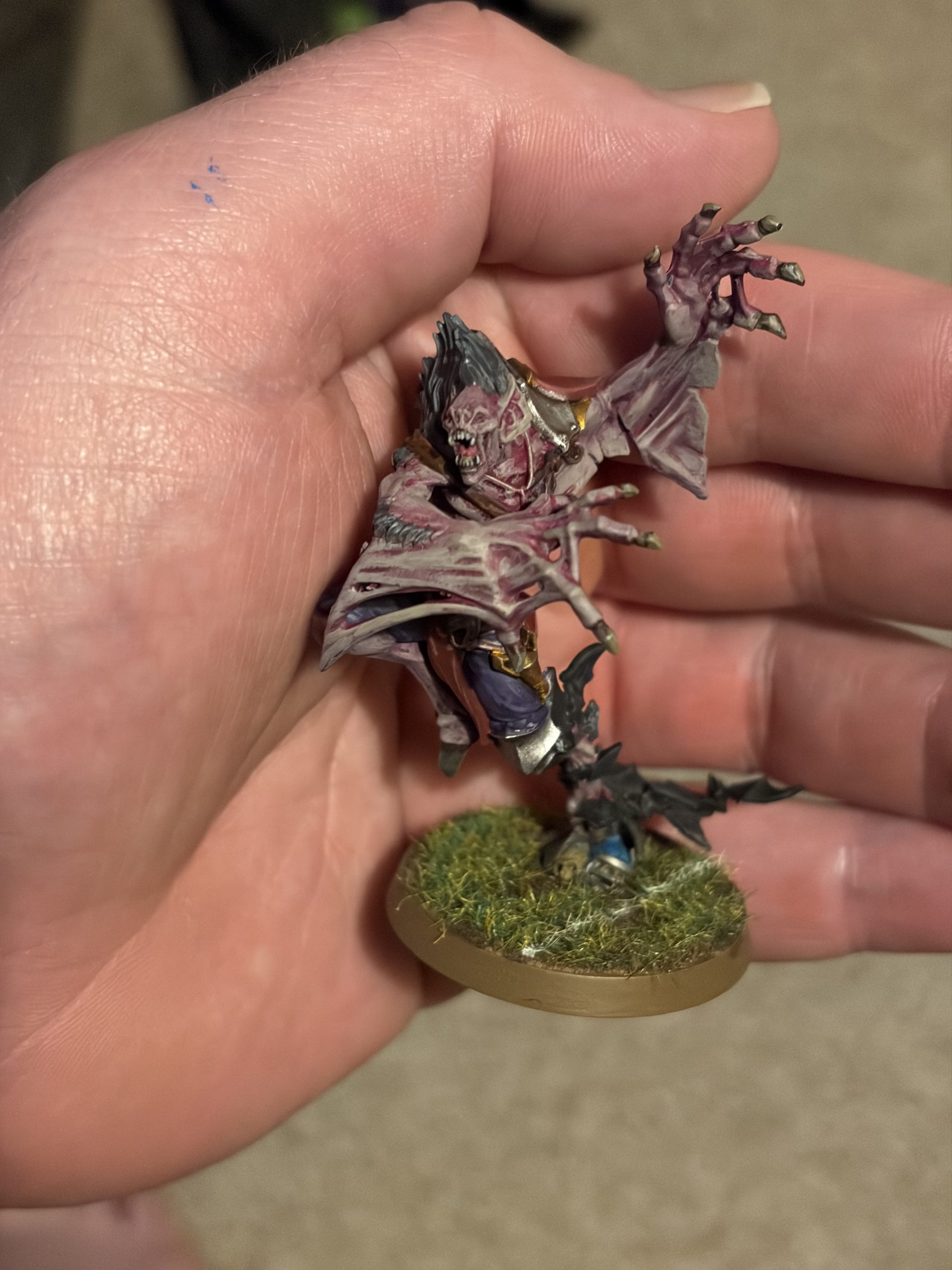 i layered a couple layers of incubi darkness, then mixed about 60% incubi with the skarsnik, and then painted it over leaving the darker tone in the recesses. Normally I would have done this a few more times with more skarsnik added to the mix but decided for brevity to just do a highlight of pure skarsnik.