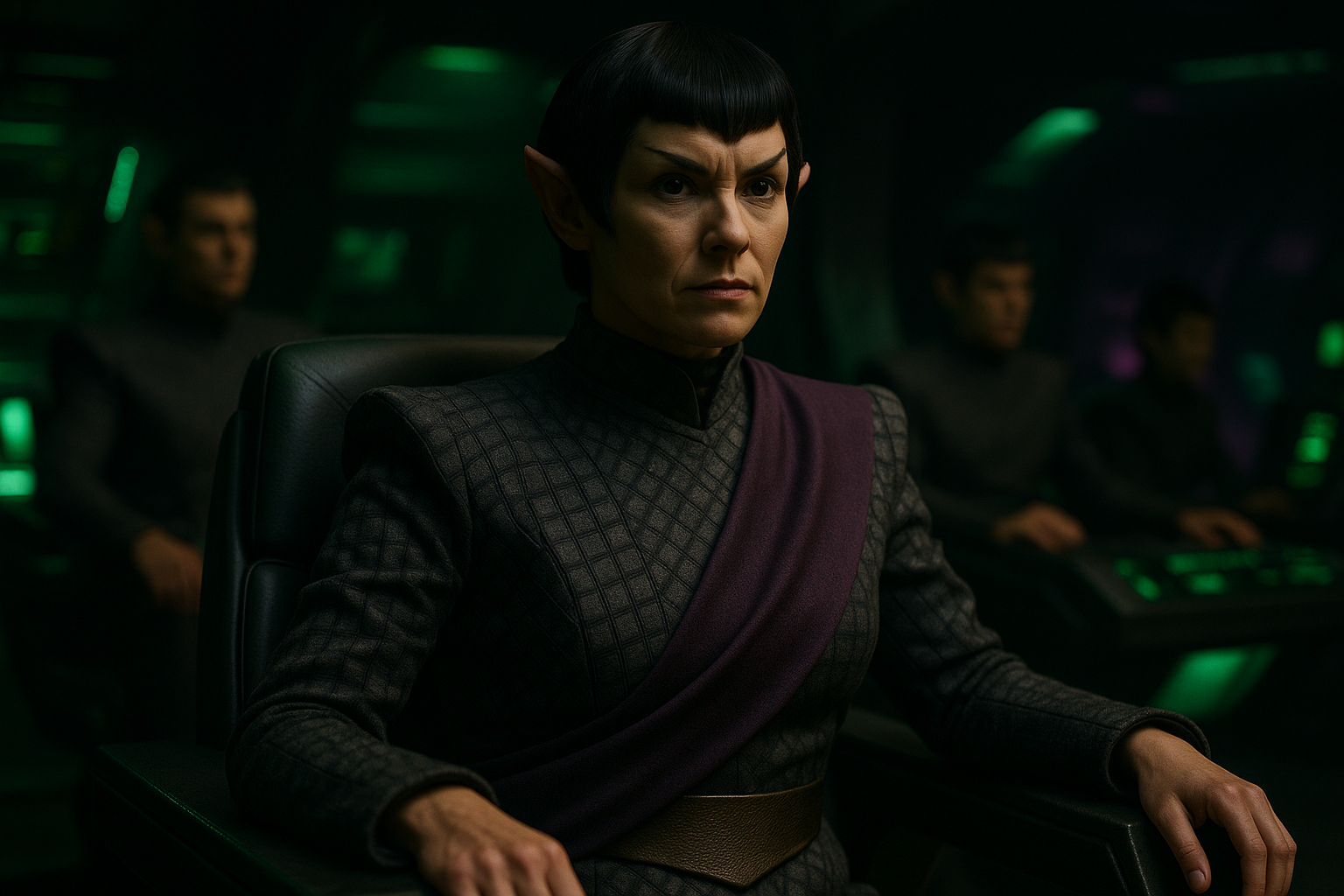 Commander Telek, seated in the sunken command throne, lowered her gaze to the data display blooming across the curved surface of her console. Her black-gloved fingers moved like a ritual dancer’s, zooming and parsing the tactical readouts. A quiet nod was her answer.