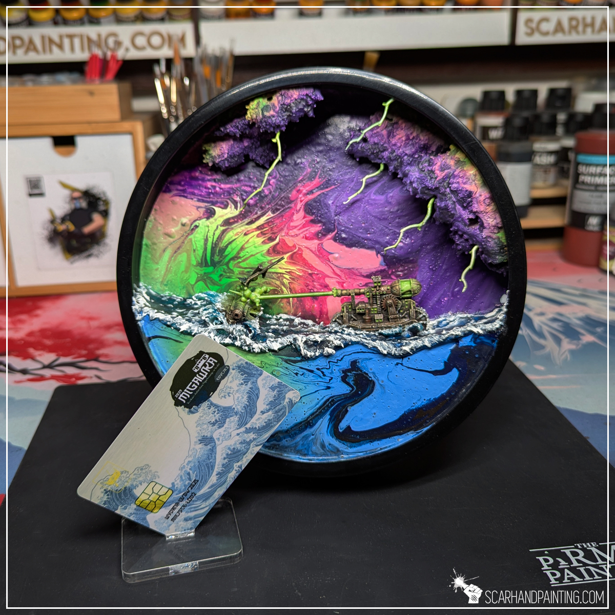 I’ve decided to double down on pouring paints and test using them on plastic. It took a lot of work, first covering a bunch of old Citadel Trees foliage with a mix of Super Glue and PVA Glue, to make them look more like ‘angry clouds’ and then treat each individual piece like a small canvas, pouring just a little bit of paint, one layer at a time to build volume and color mix. Finally I’ve built the thing, added a few lightning bolts made of dried sticks and… the deed was done.