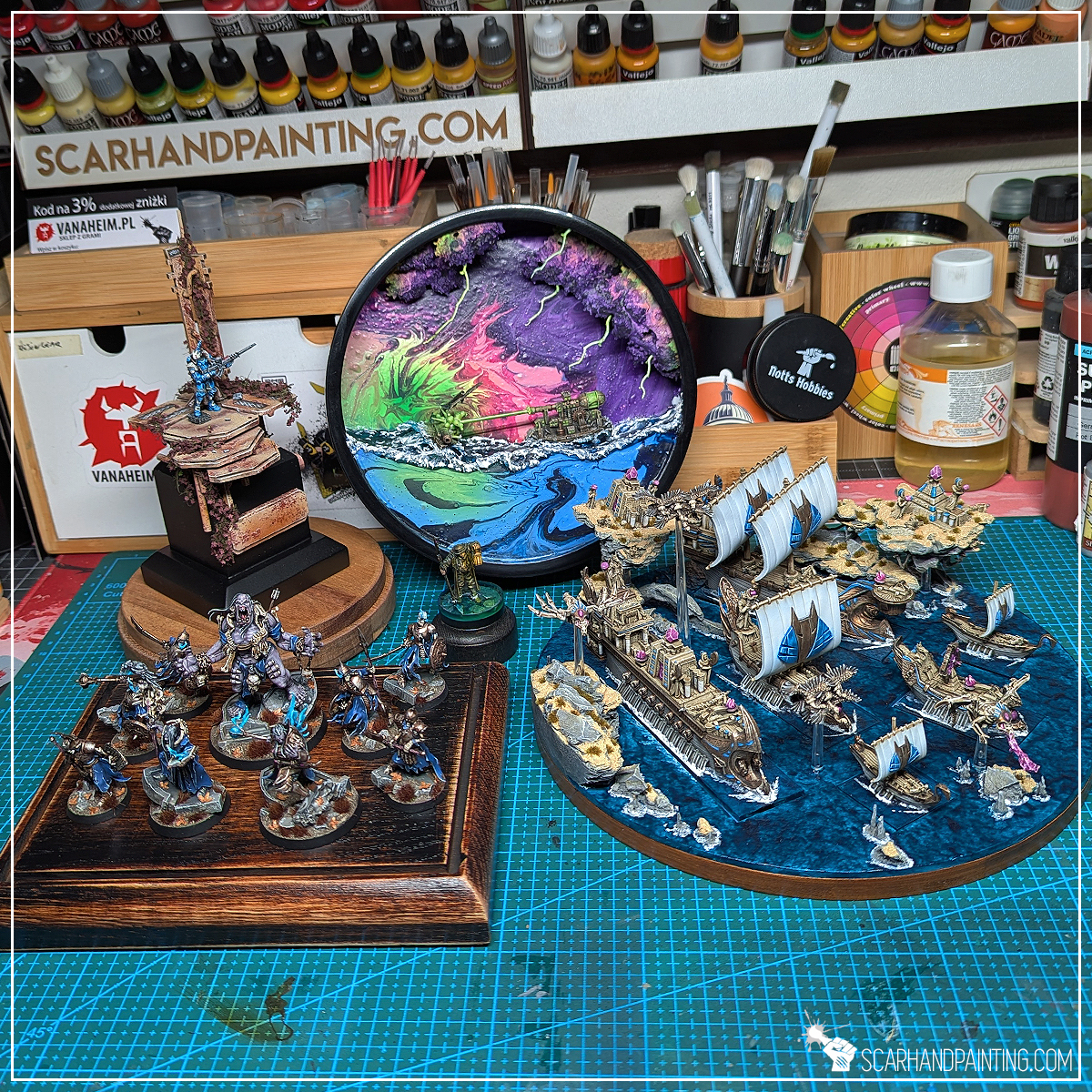 The ships I’ve painted individually (I mean, like a duo, but aside from the rest of the project). Painting miniatures is something I’m used to. The background though, this was quite a challenge. I used special paints that I got for a method called “pouring” that I am super hyped about, but do not get great results with. Done only two successful projects with it before and neither is anything spectacular…
