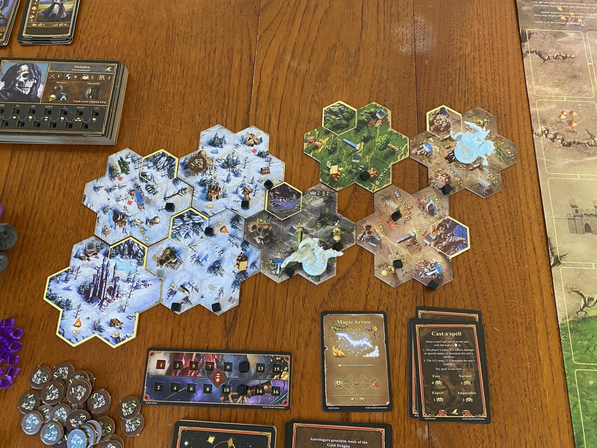 I also tried to focus on using a magic hero and building up a deck of spells to use. I’m not convinced it’s as good as being a might hero though. It’s hard to get lots of spells without spending money in the mage guild (diverting it away from building and recruiting). You also burn through cards to cast the more powerful spells.