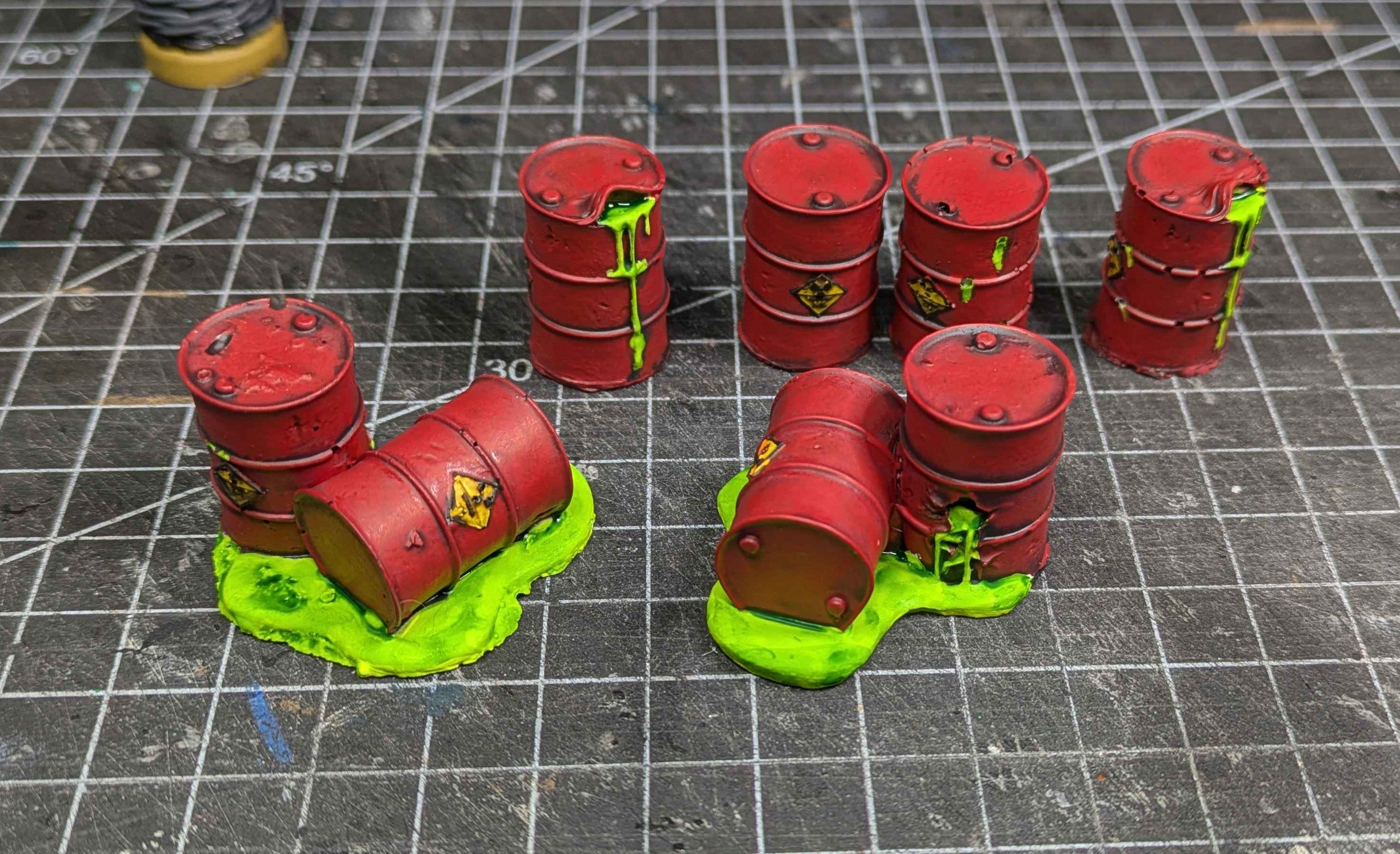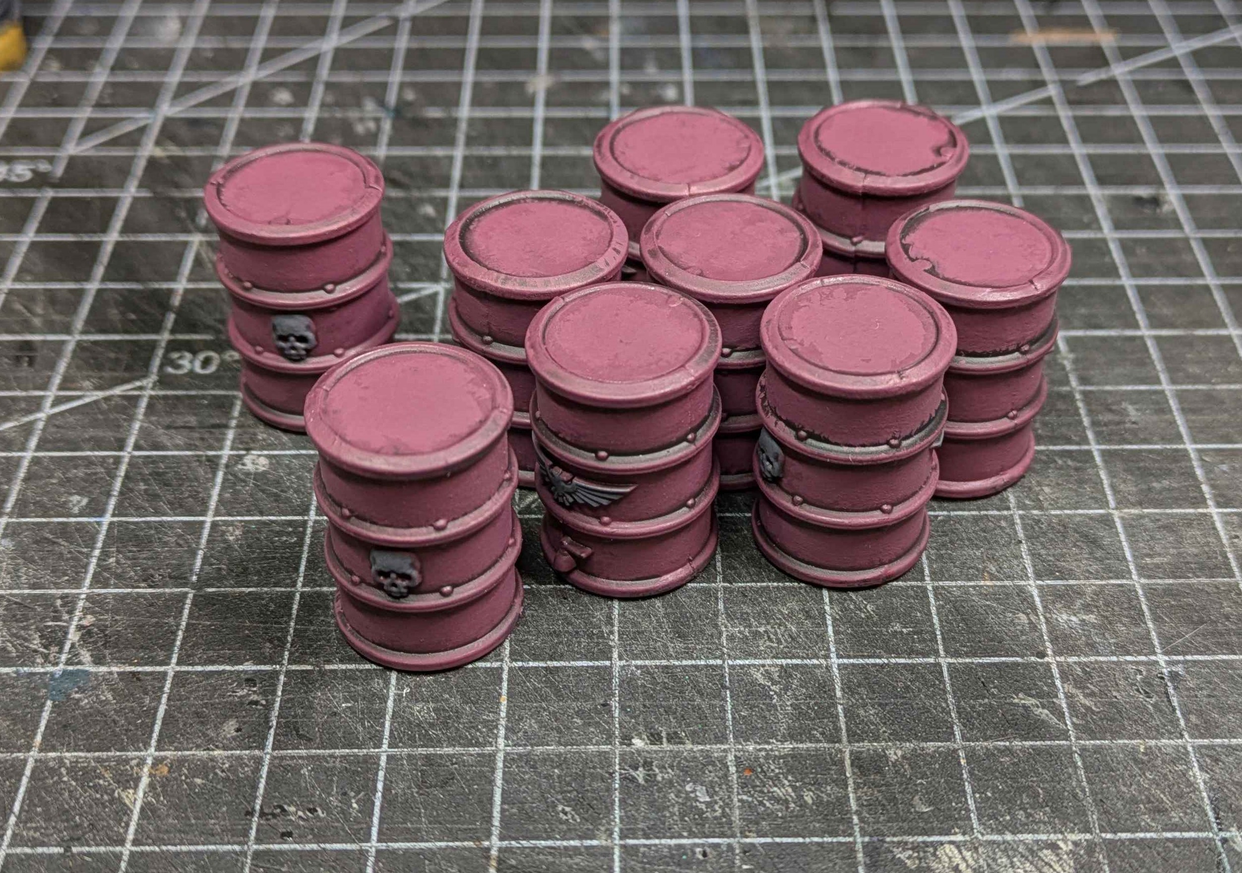 I also have a bunch of GW barrels which I painted a different colour to the objective markers. Once both sets of barrels had base coats, they got a wash of black wash and then a stippled reapplication of their base colour.