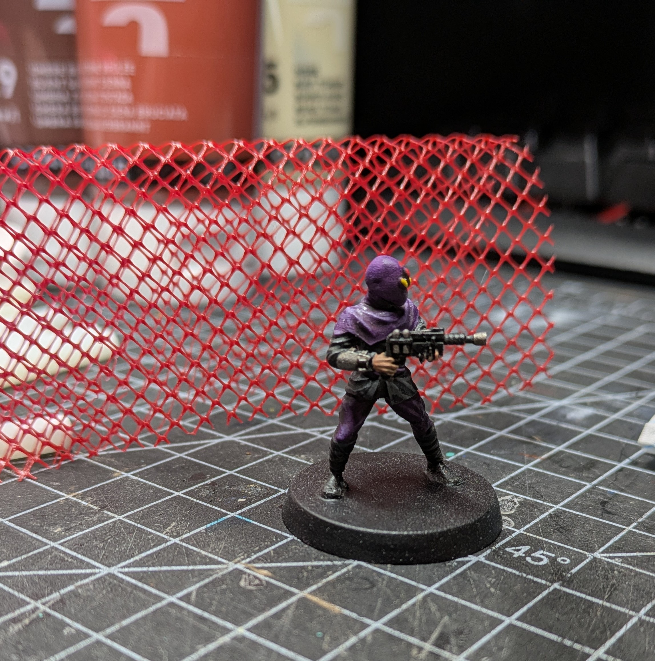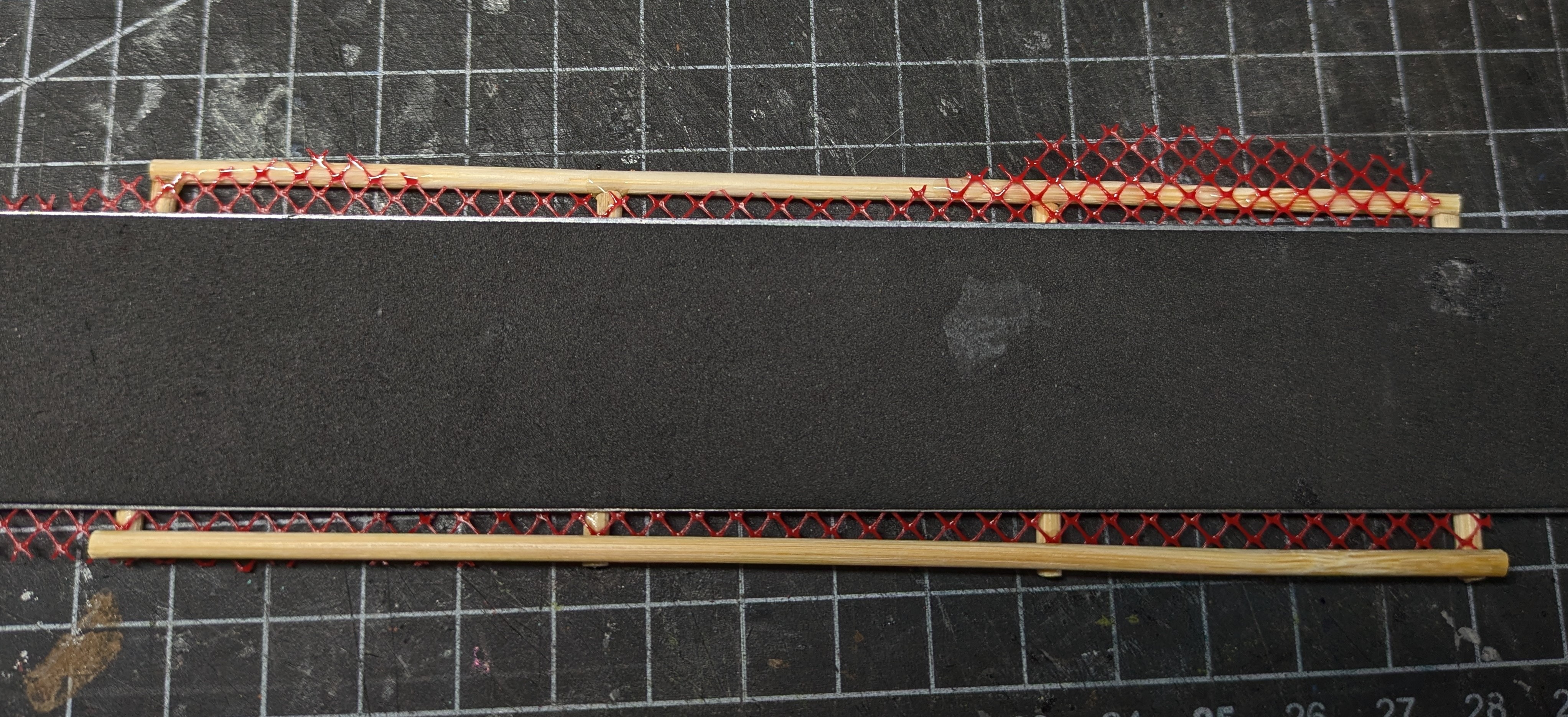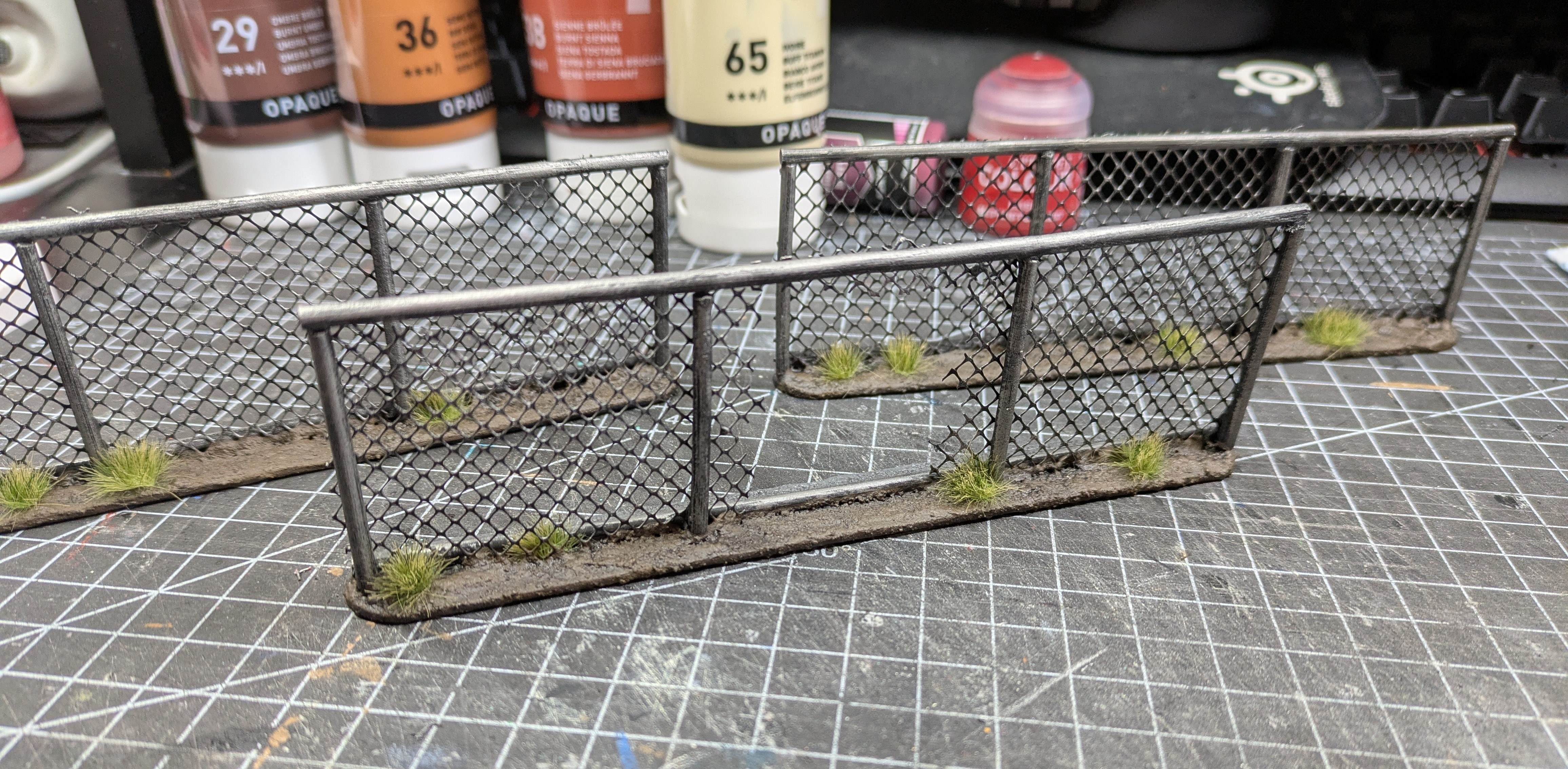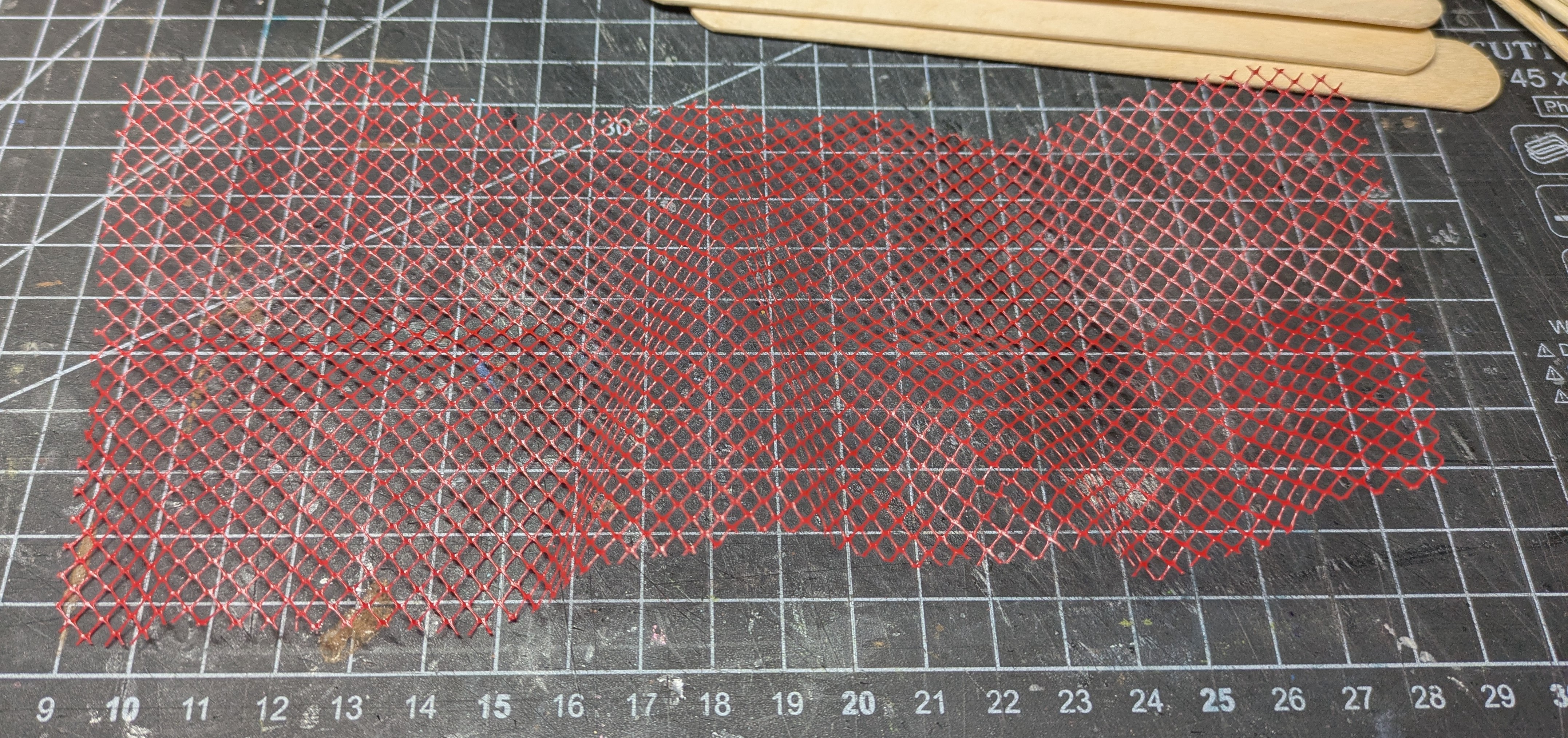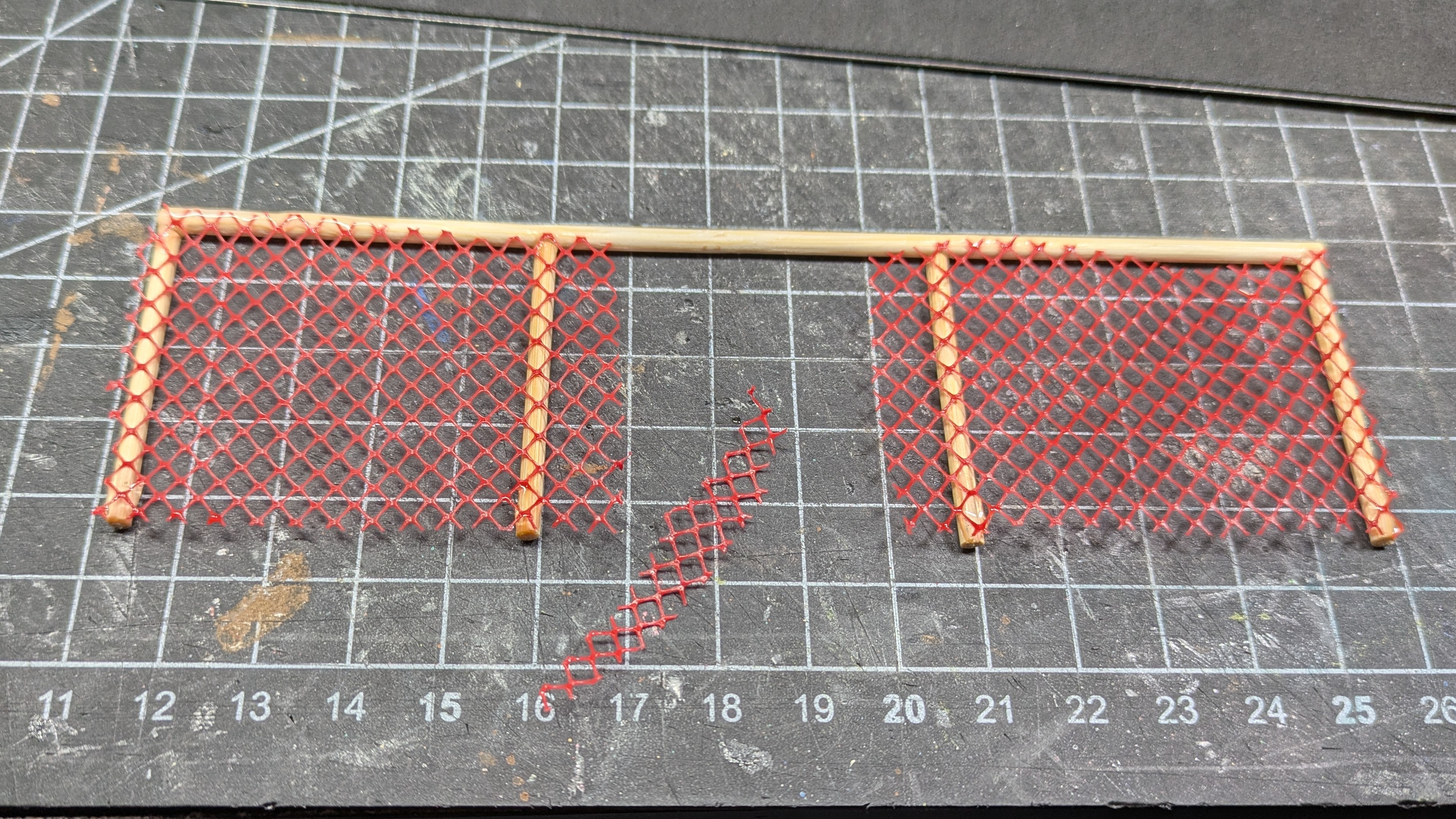 Next up I wanted some chain-link fence but looking around in my junk pile… sorry, scratch building supplies, I only had one piece of leftover netting that will work. Folding it in half to check that it would make fence tall enough to look right, I cut it in two and started cutting up kebab skewers for the metal frames. I had to get a little creative with gluing because I didn’t have any wiggle room for overhang. Using my metal ruler to hold things in place while I used super glue worked well most of the time; a couple of times I added a little extra weight on the ruler too.
