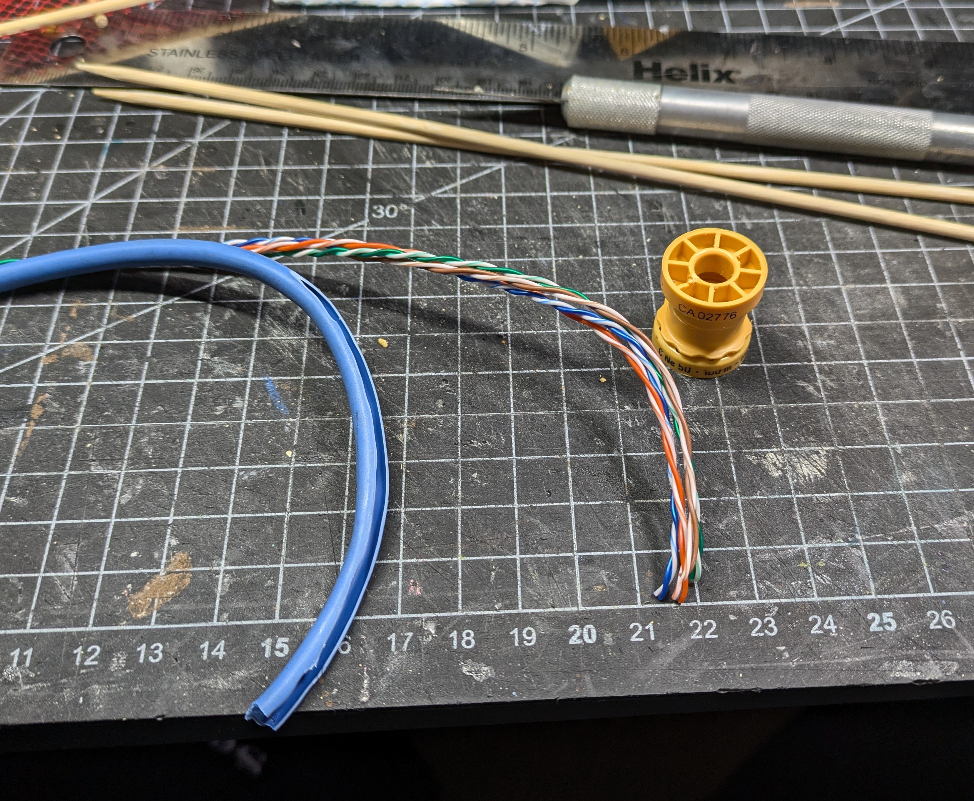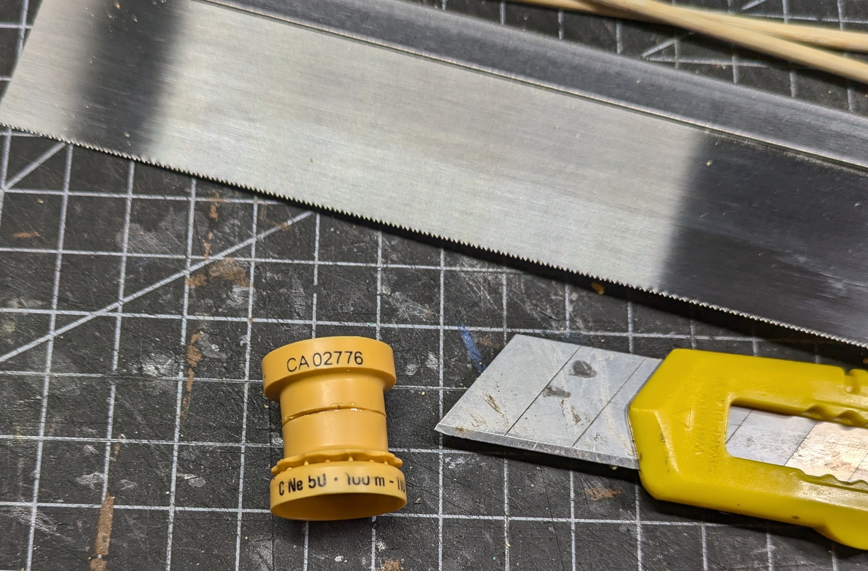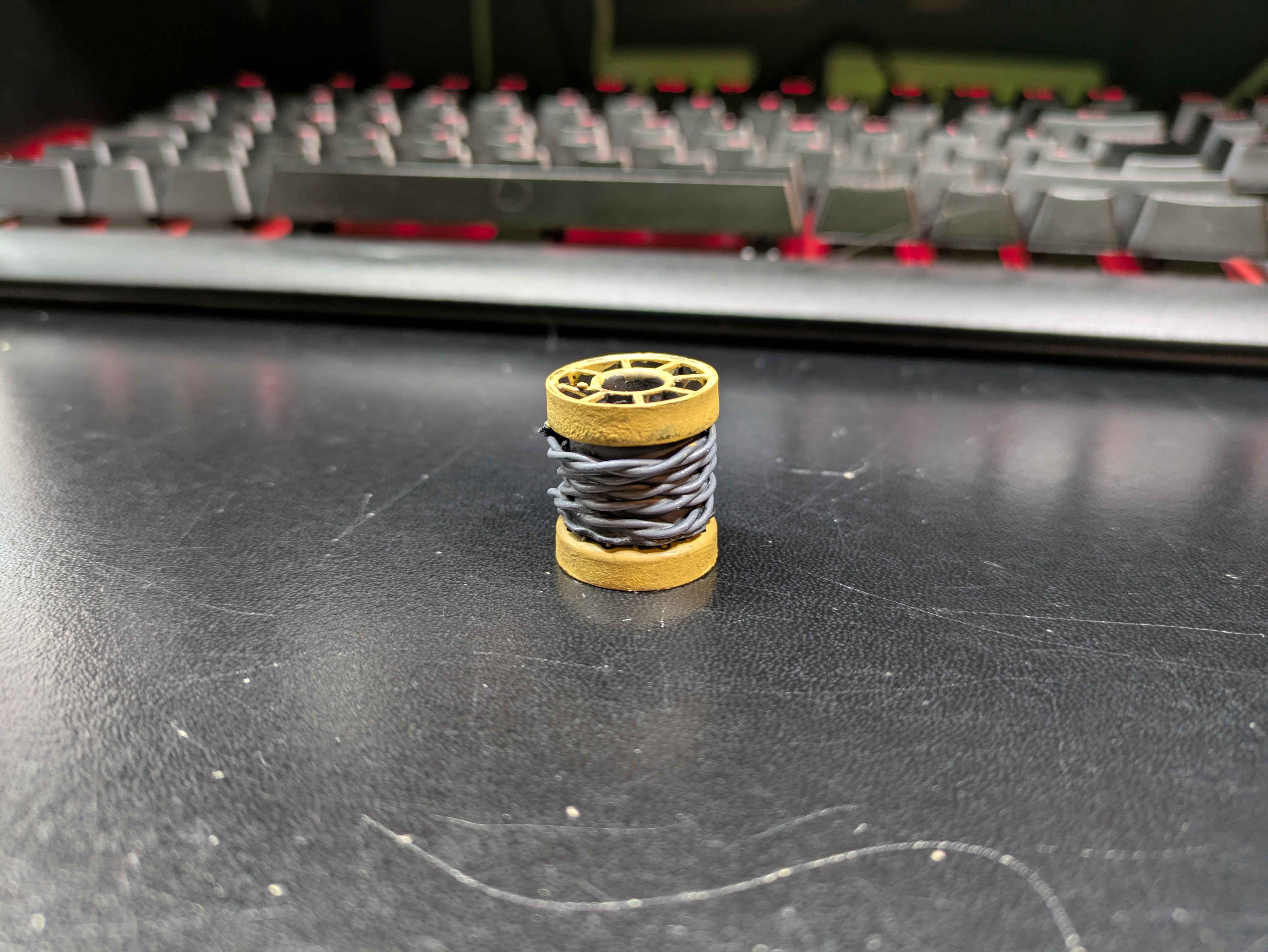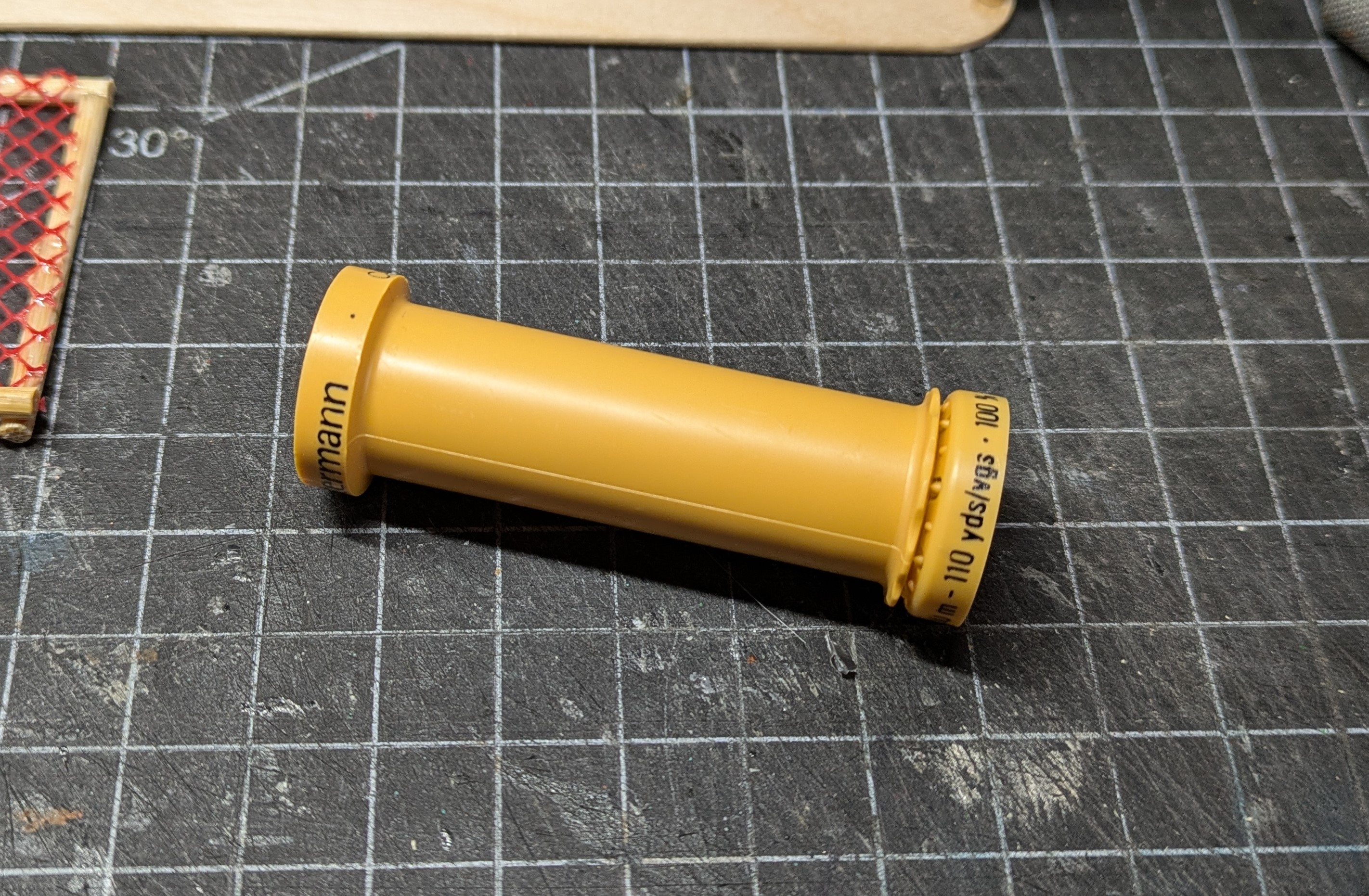 I also found this old thread bobbin. A quick couple of cuts with my hobby saw and it was better scaled to mini height. Some wires stripped out of an old ethernet cable wire superglued round it and then some black spray primer. Some paint and a wash later, it becomes another bit of dockside scatter.