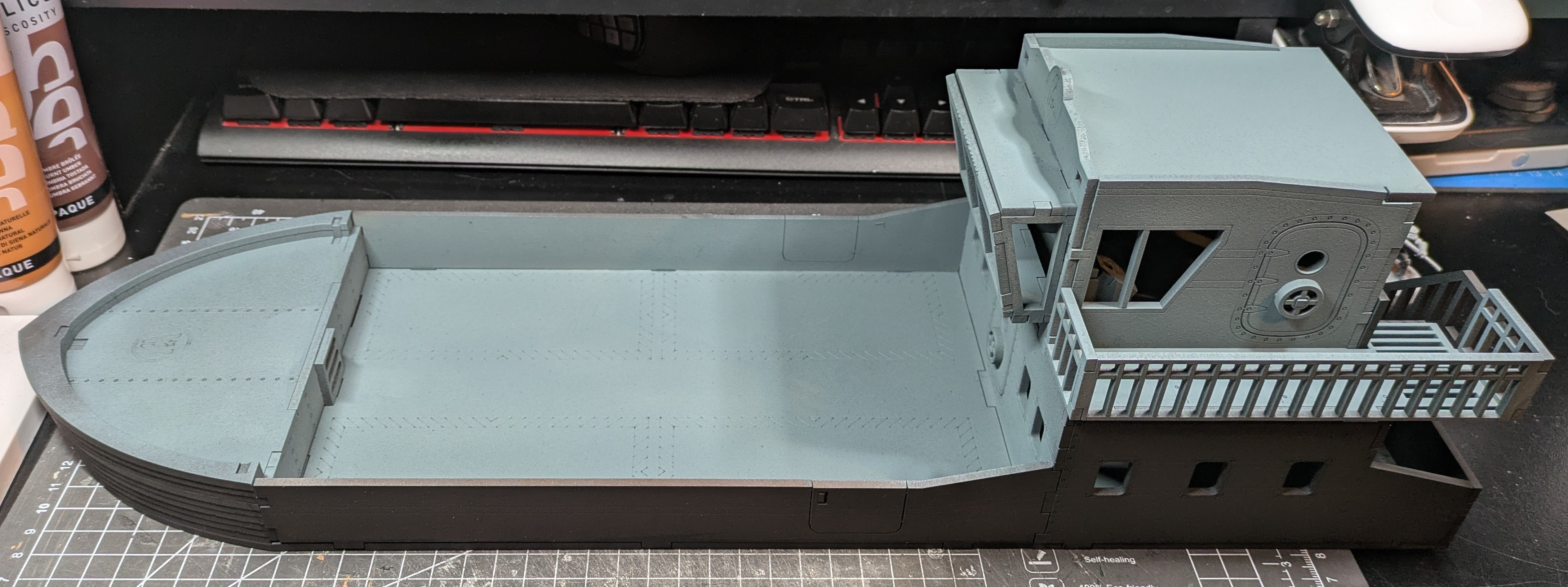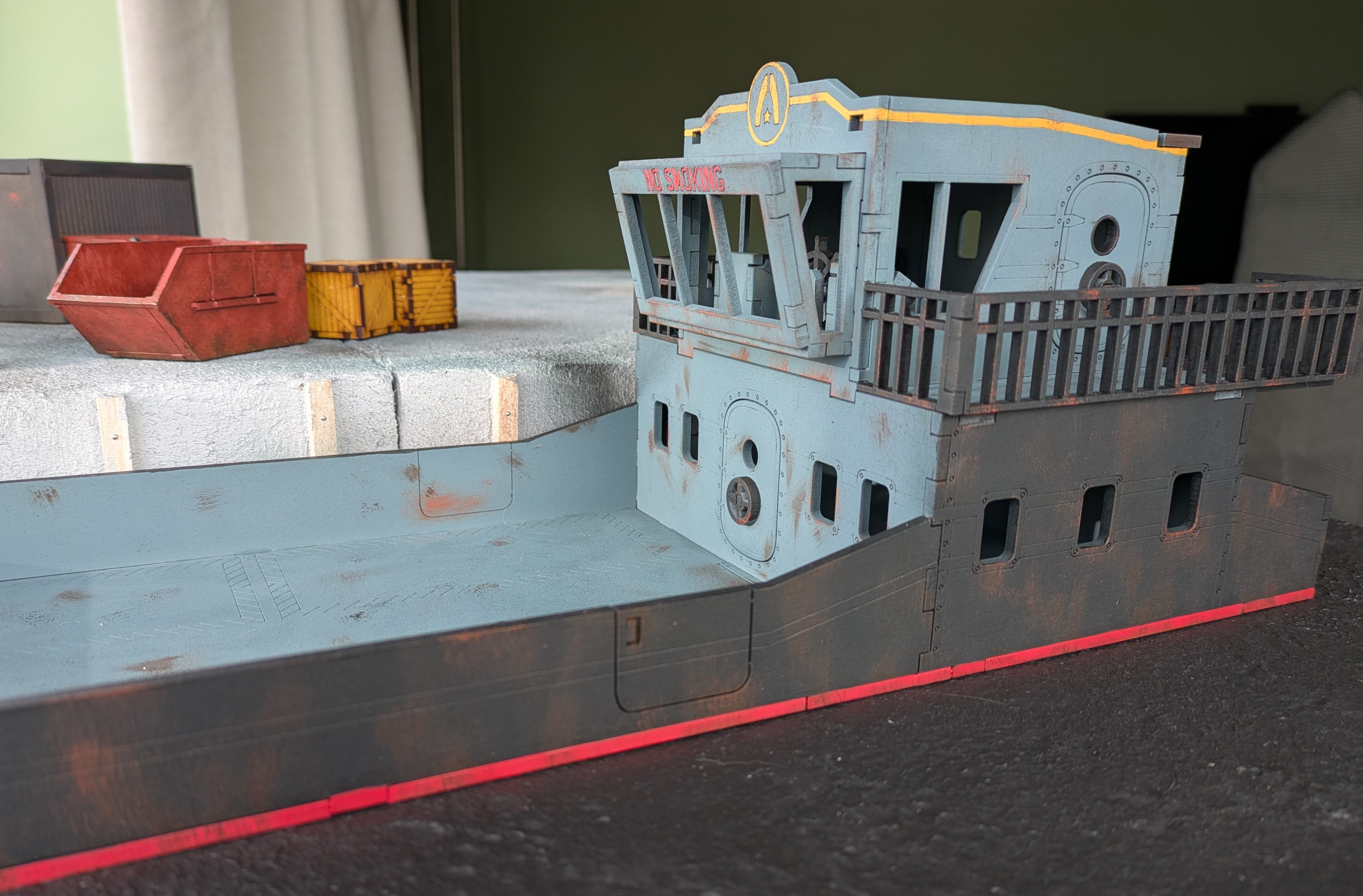 I’d already built and primed the ship (with two different colours of spray primer cans to save time)but I did some detail painting and then sponge weathering. All in all, not bad for an mdf kit that had been sitting the stash for several years.