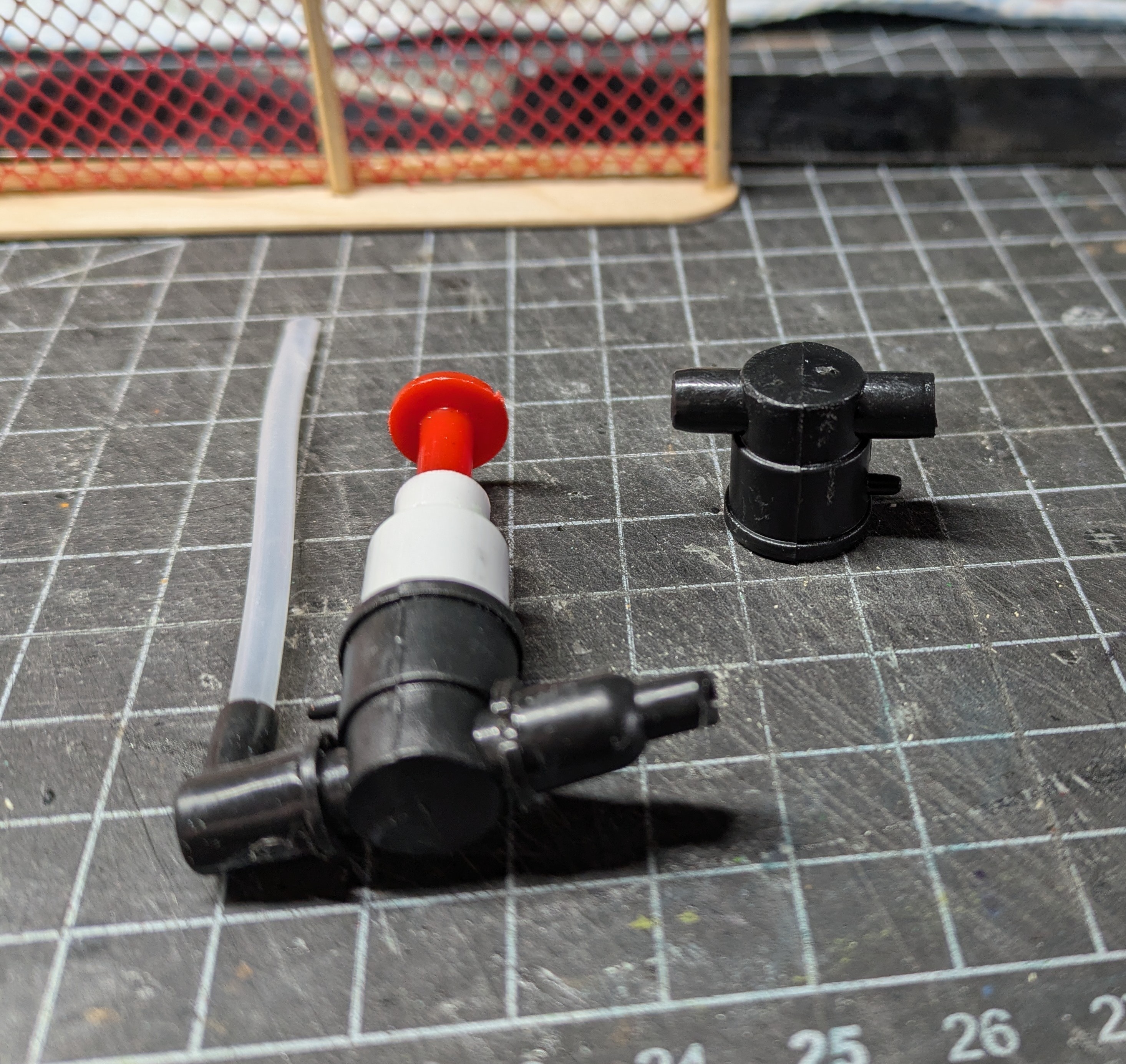 Some homemade dockside bits. As part of digging around in the Toolboxes of Trash that I keep for scratch building, I found these water gun trigger sections. They pull apart really easily and, though the plastic is too soft to file away lines, I carved away what I could and hit them with some black primer. A drybrush of gun metal and then a dark brown sponged on for light weathering and now our ship has something to tie up to. Sadly I don’t have anything right now that looks the right gauge for actually tying up the ship so we’ll all need to use our imaginations for the game.