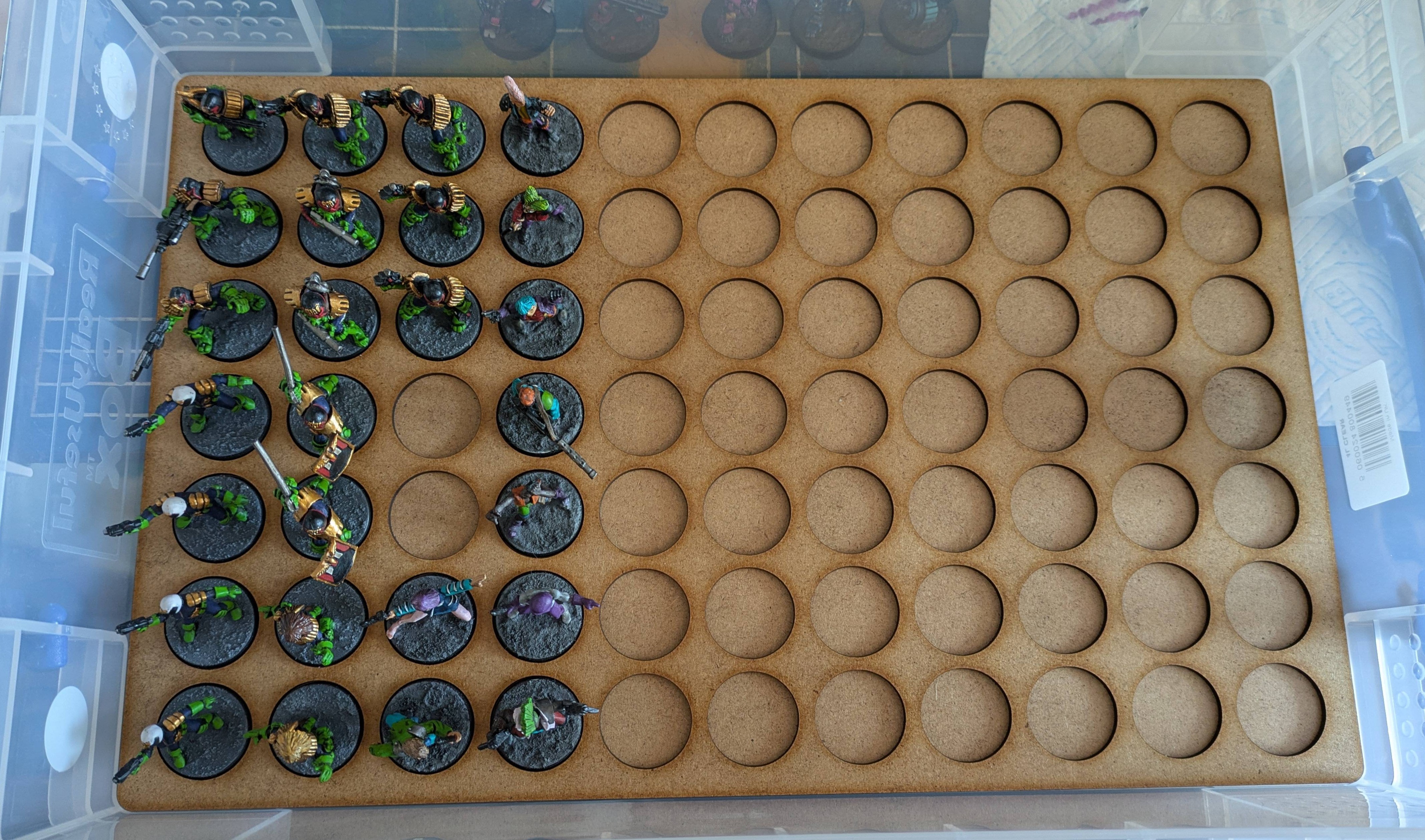 The Humble 4L Really Useful Box which I used for the majority of my painted models. Having everything in one place is handy but as this is a collection that I don’t see leaving my home again, I wasn’t fussed about putting magnets on the bases. I grabbed an MDF insert from Warbases which holds 77 x 25mm round bases which should be fine for the vast majority of the models.