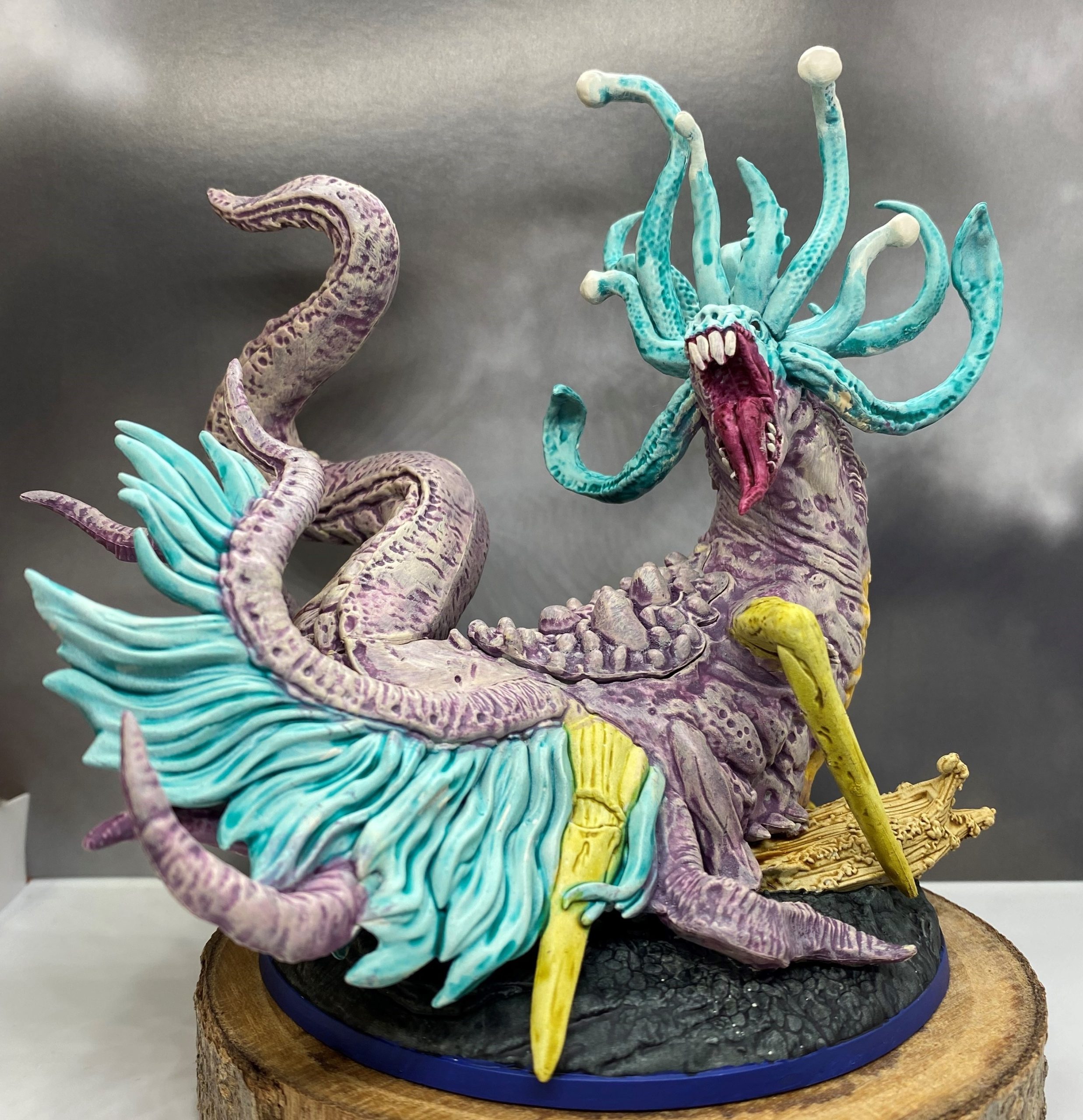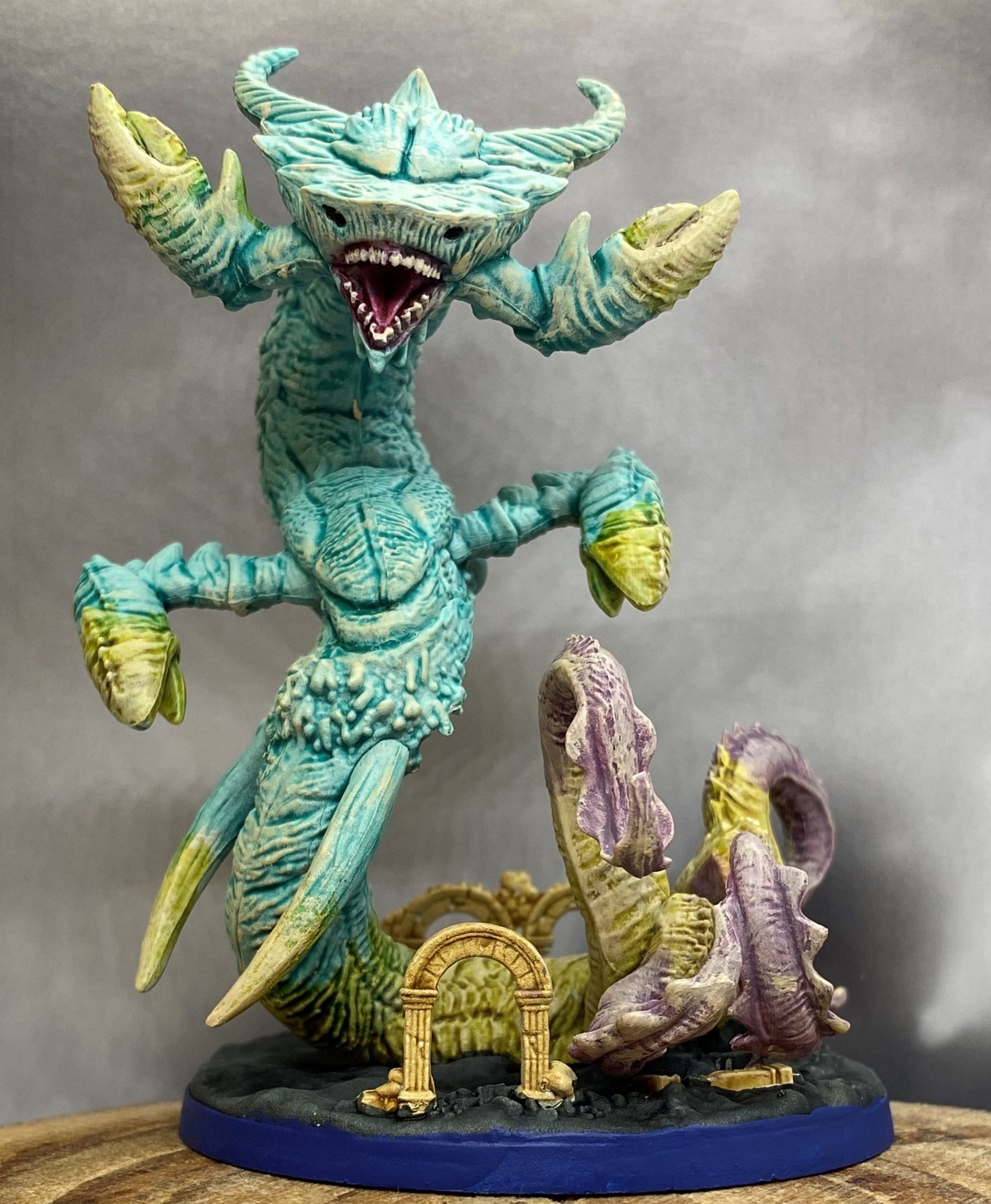 The Medukatos’ hair(?) and head tentacles were painted aethermatic blue. The body was painted apothecary white with a bit of volupus pink added in. The stomach was painted iyanden yellow. The limbs were painted plaguebearer flesh. The mouth and tongue were painted volupus pink. The body and stomach were dry brushed flayed one flesh. The teeth painted wraithbone and the eyes abaddon black. The eyes(?) on the tips of the tentacles were painted wraithbone.