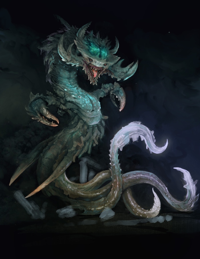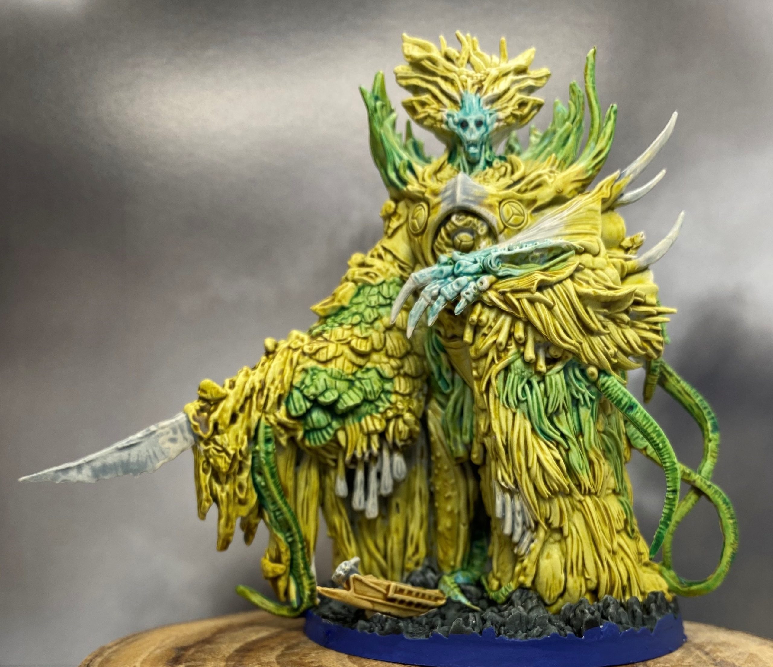 The Ur Fleece was painted plaguebearer flesh all over. Then some bits were painted over with aethermatic blue to get a nice green colour. Some parts were then repainted wraithbone to make them pale again. Apothecary white was then used for the glaive, fish, claws and centre of the chest.