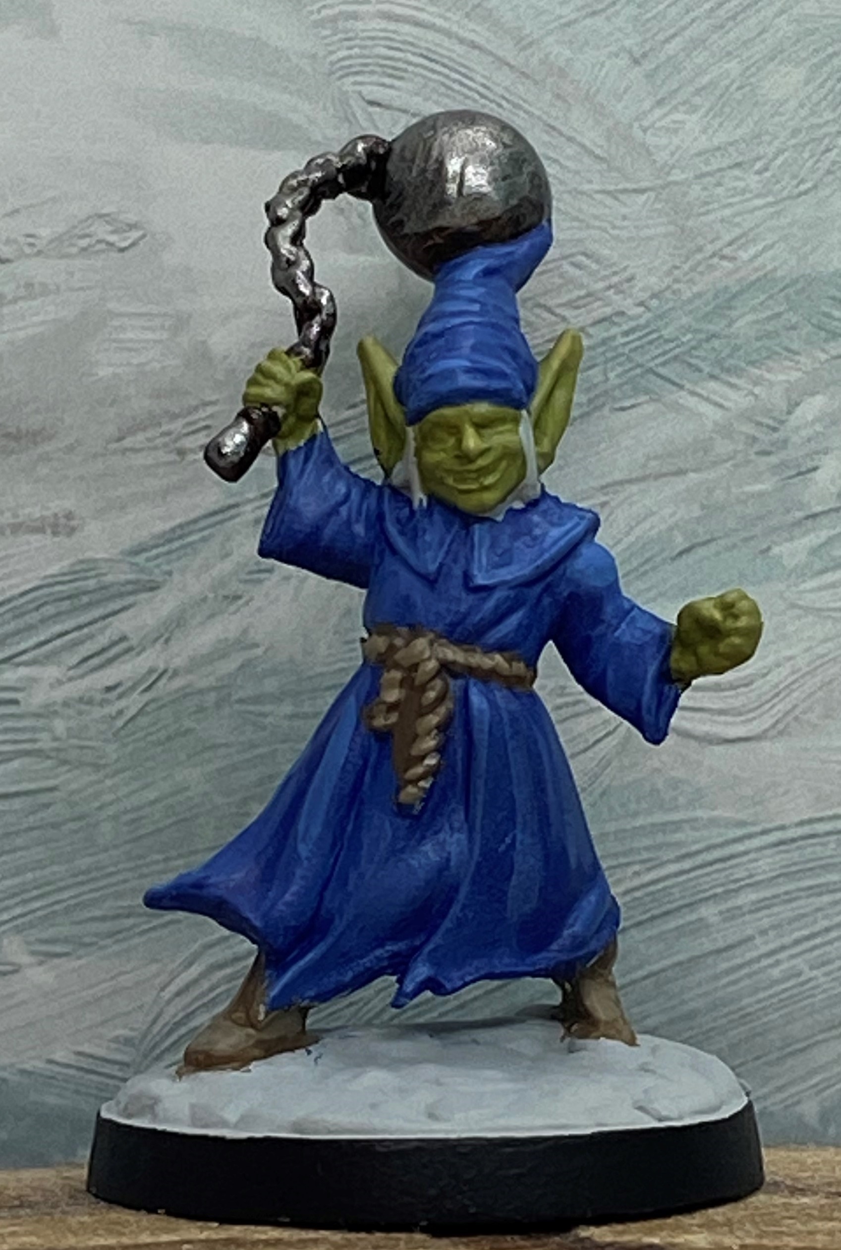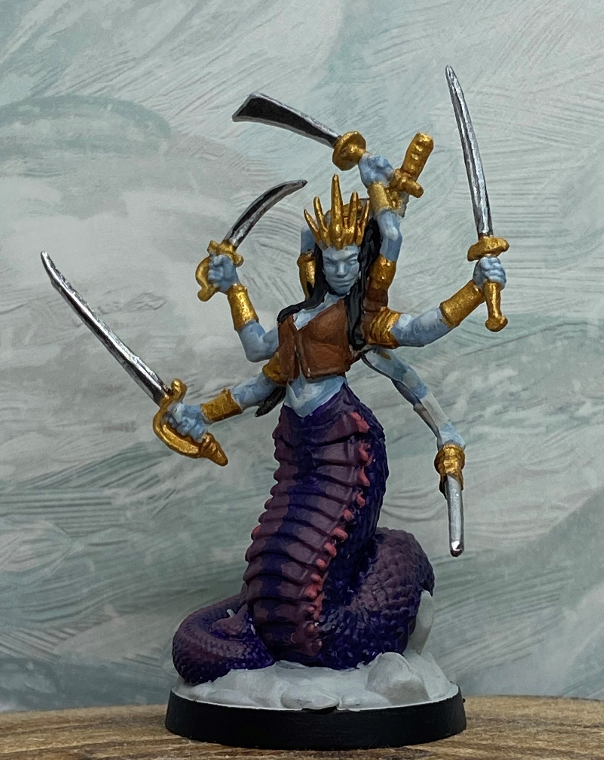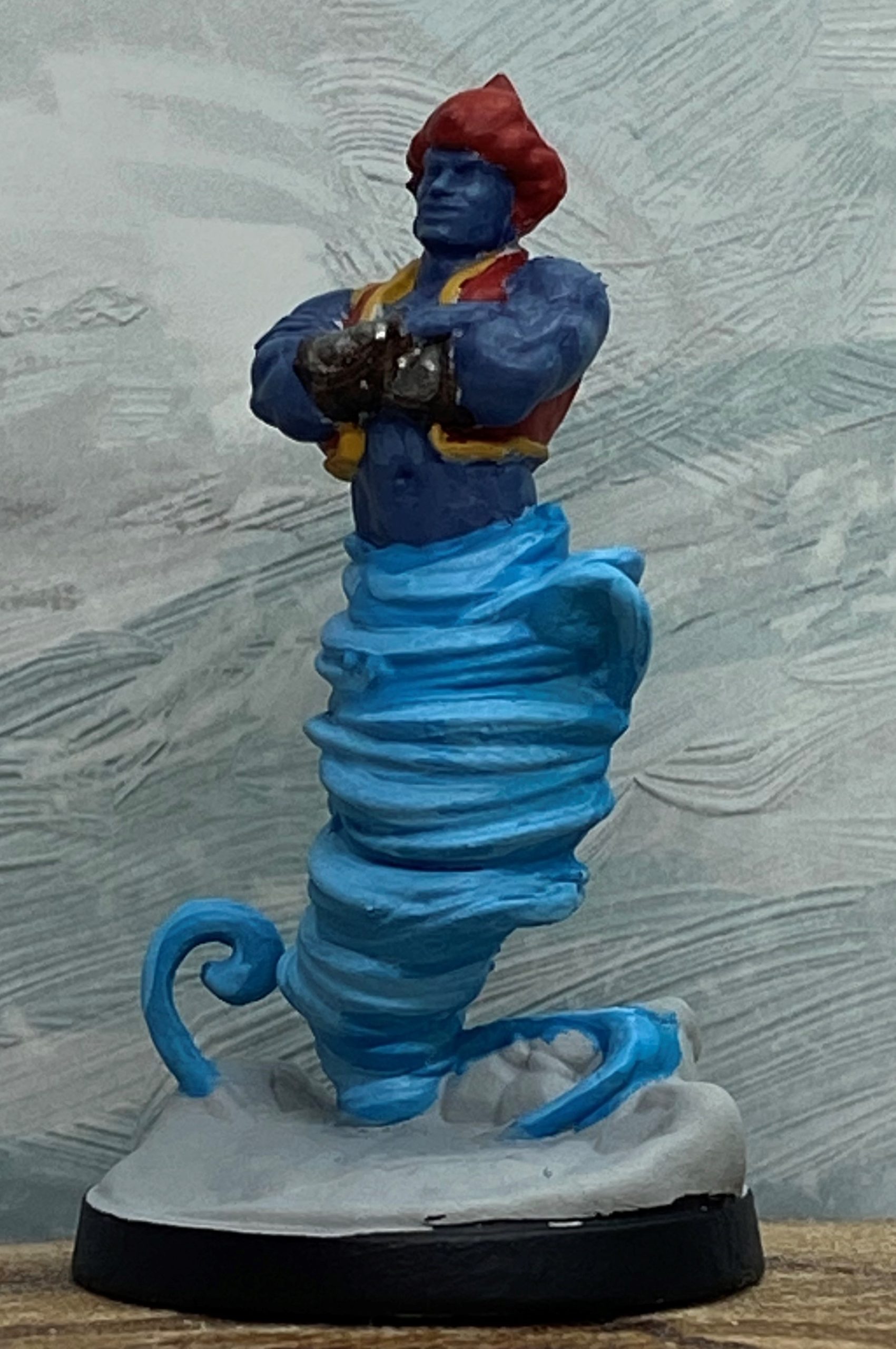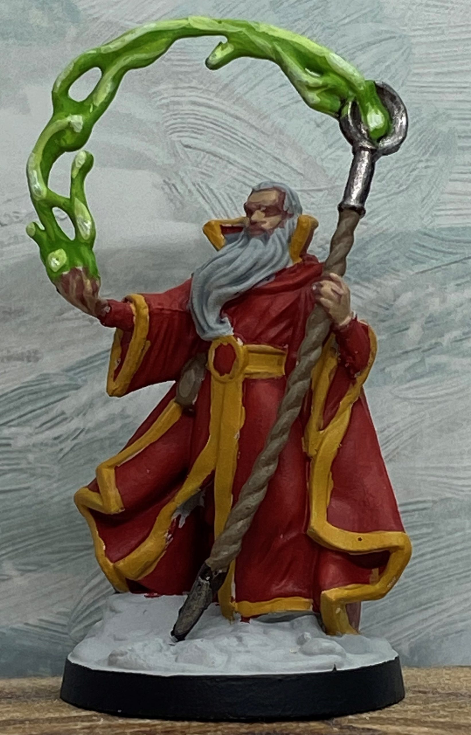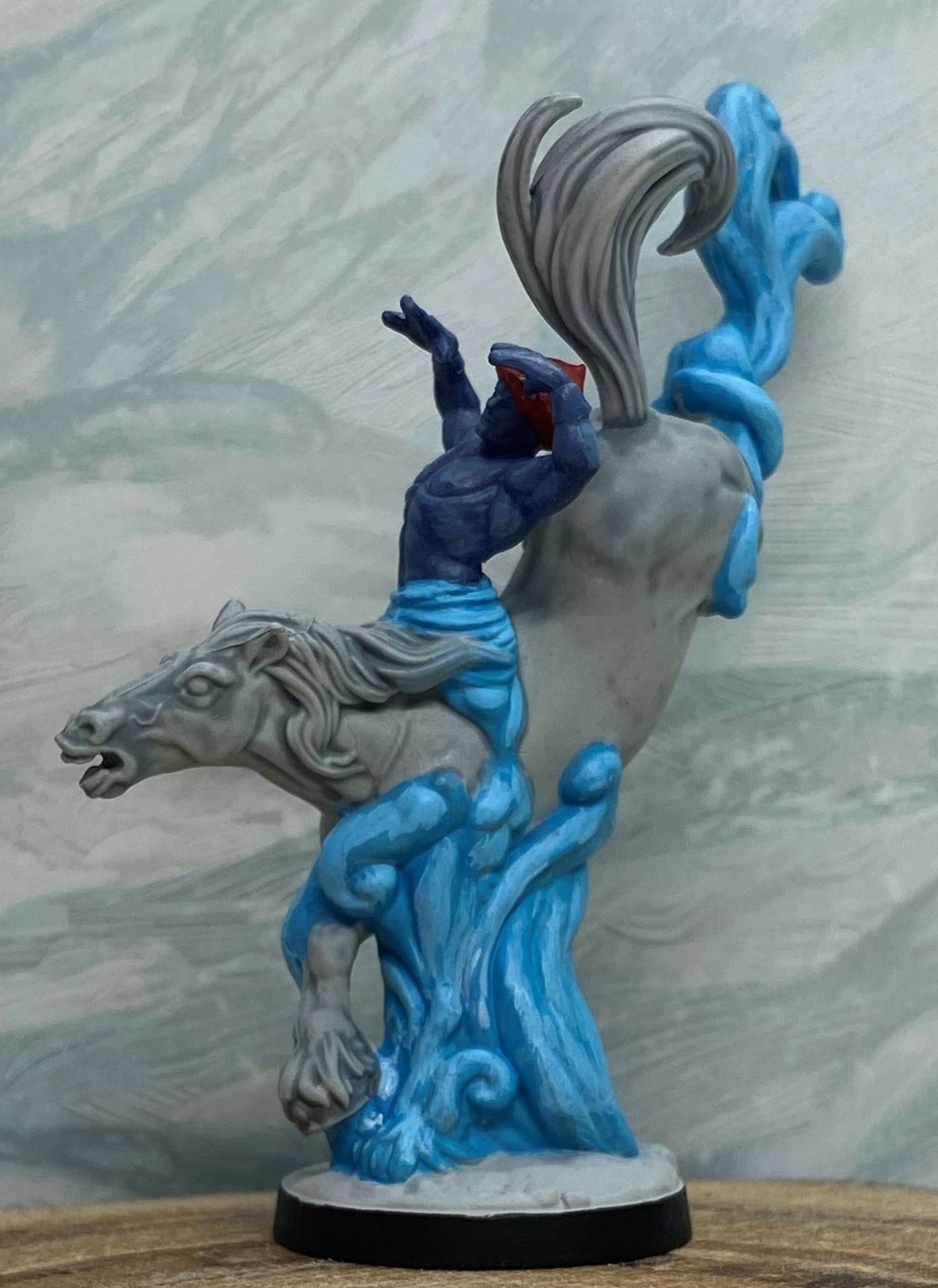 All the models were undercoated grey seer. The gremlin skin was elysian green blended up with ogryn green. The gremlin robes were painted macragge blue blended up with calgar blue. The genie skin was painted the fang blended up with russ grey. The genie and mount blue clouds were painted lothern blue blended up with white scar. The red robes were painted mephiston red blended up with evil sunz scarlet. The brown leathers were painted steel legion drab blended up with kark stone. The horses were painted apothecary white. The yellow trims were painted averland sunset. The iron golem was painted warplock bronze blended up with runefange steel. The green magic was painted moot green blended up with white scar. The Naga’s swords were painted leadbelcher highlighted with runefang steel. The Naga and Titan skin were painted fenrisian greyblended up with pallid wych flesh. The gargoyle was painted corvus black blended up with administratum grey. The Naga snake tail and Titan skirt was painted naggaroth night blended up with pink horror. The Titan’s armour was painted retributor armour highlighted with auric armour gold.