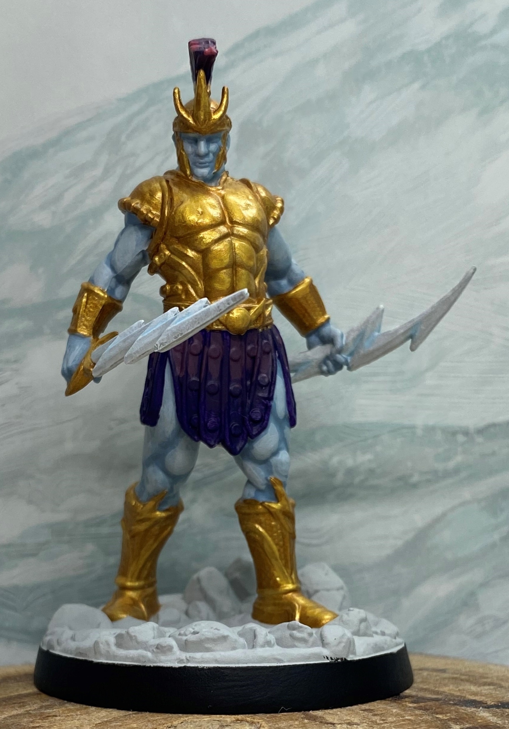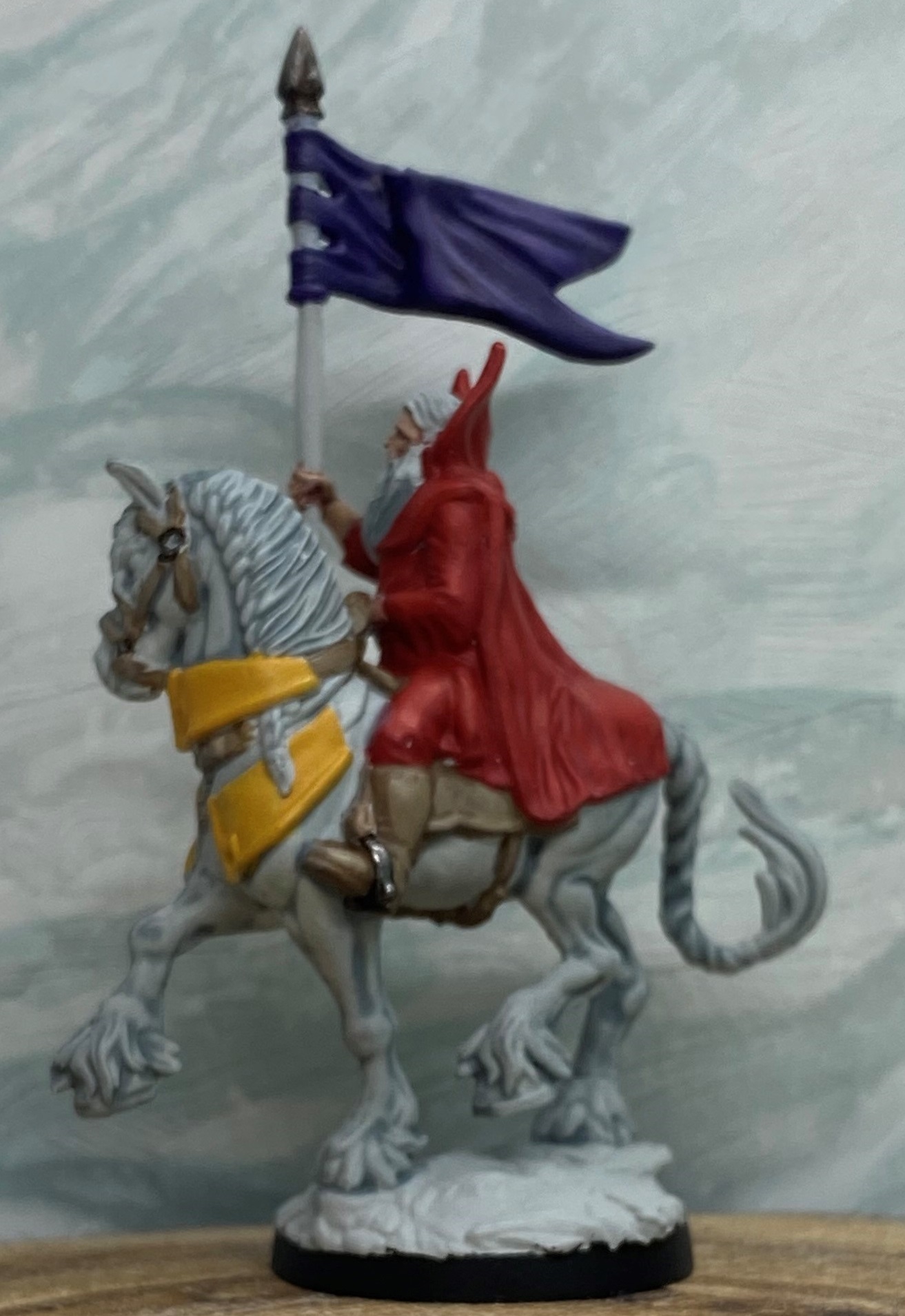 A few glazes of druchii violet were applied to the bottom of the gold horns to simulate the light reflecting off the robes in the gold.