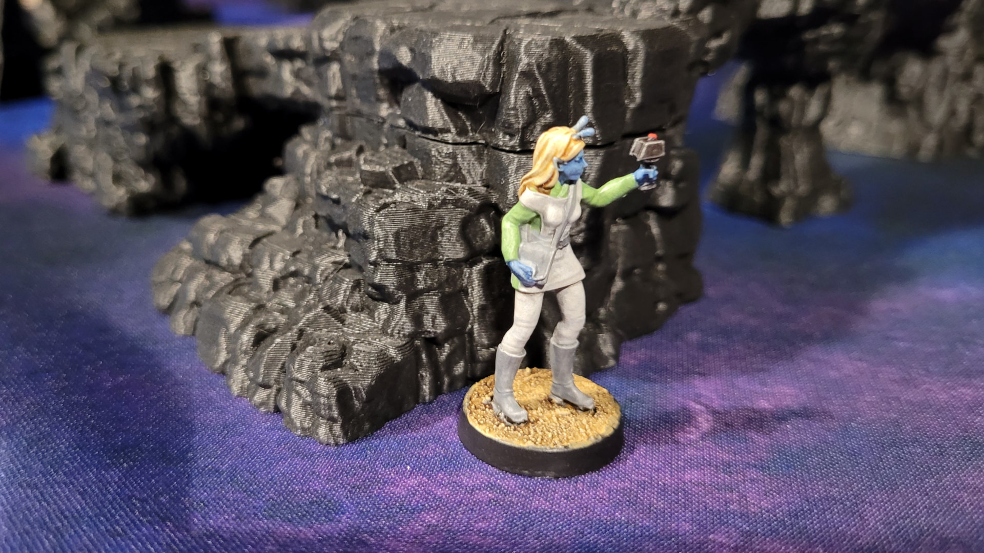 To put it another way, my Eternal Empire force consists of models from Harlequin’s old Doctor Who range, and Beast in the Broch’s excellent Future Freedom Fighters who may or not be based on characters from Blake’s 7. I used Sea Devils for the Gillcreeps, FedSec Troopers for the Dronetroopers and Dreadbot, and Star Commander Travers for Count Baculum, who will hopefully be my force’s MVP considering his formidable 270 point cost. These models had been sitting in a box for many years, so if nothing else it was fun to get them to the table again after far too long.