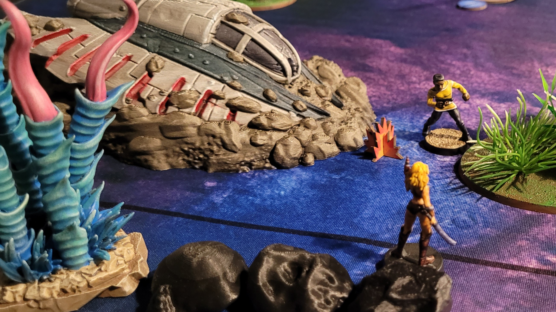 The Babooms! are hiding in a cluster of alien plants, well hidden and maddeningly too close for the Man Hunter to make good use of his free reroll on long ranged attacks. Their bonus from cover is better than his bonus for the high ground, so my opponent reluctantly moves the Man Hunter down from his desert rock to get a better shot. He moves in close and is able to rout the Babooms! — they’ve got several pin tokens affecting them, and that combined with the Man Hunter’s multiple Plot Armor cards means he’s rolling a 14 dice attack! However, when the Babooms! are routed, they instead explode, dealing damage to everyone within close range. The damage takes out the Man Hunter in a fiery conflagration.