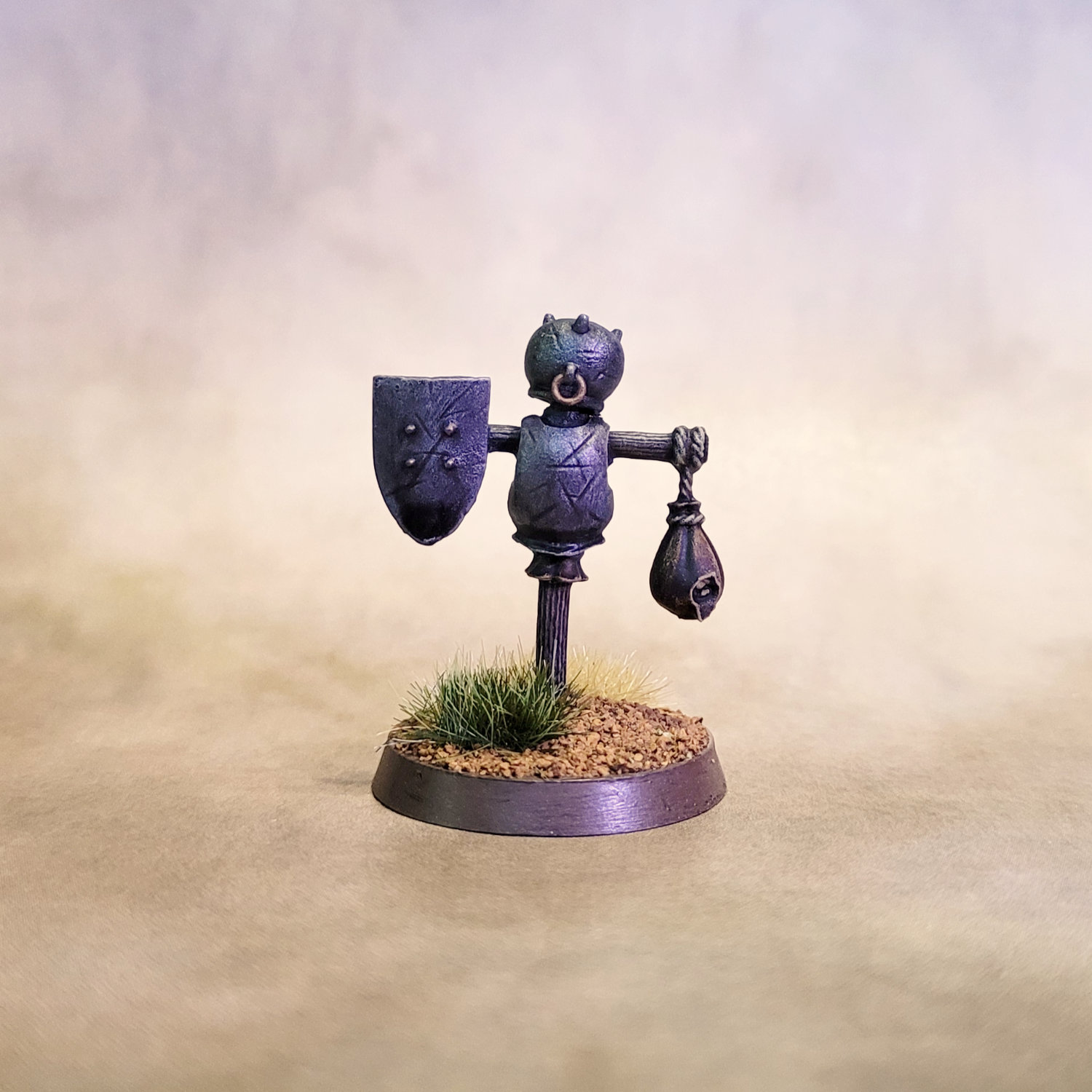 I also finished the two bonus miniatures that came in the boxed sets, a practice dummy for the halflings and a clockwork knight for the goblins.