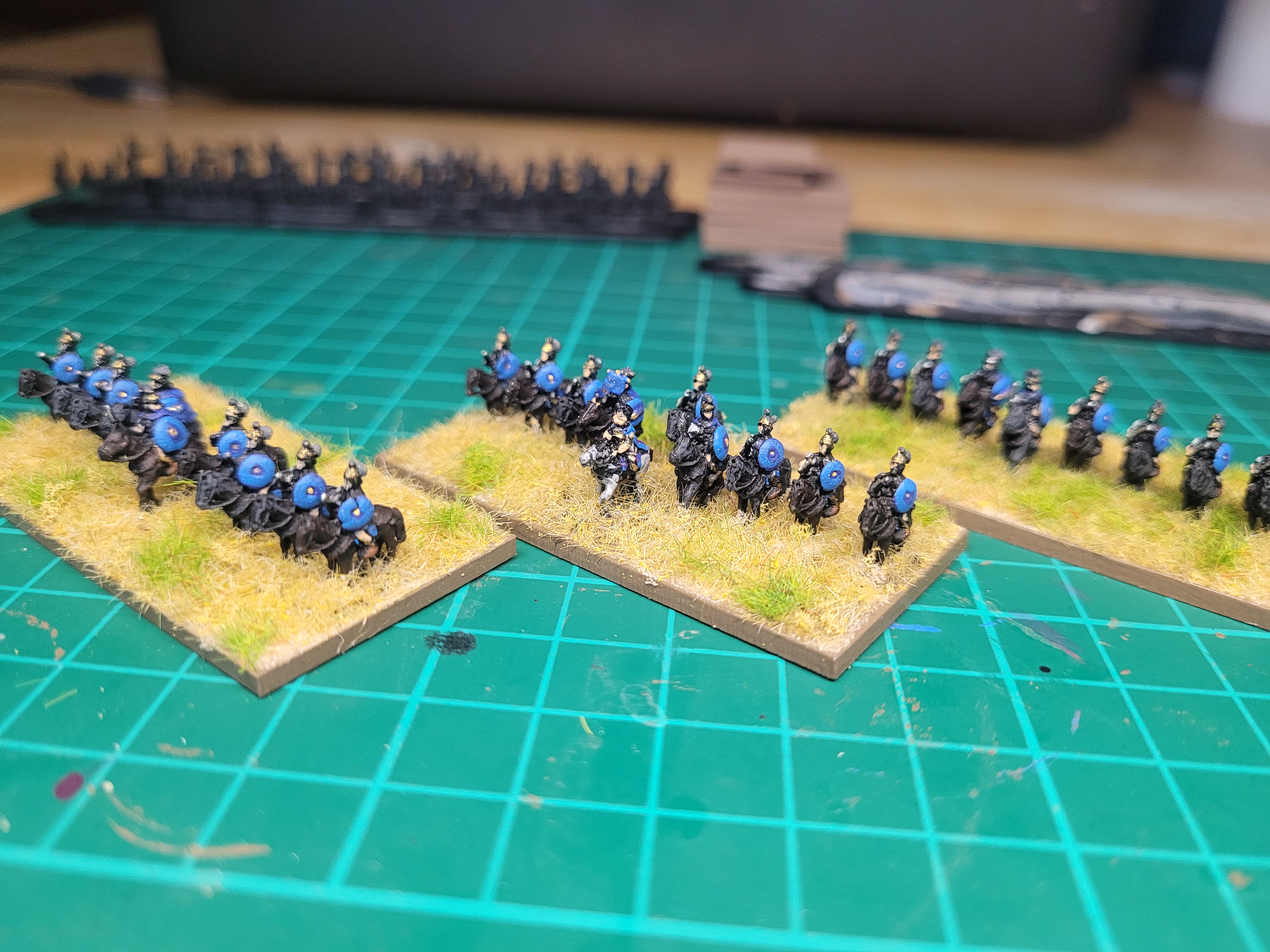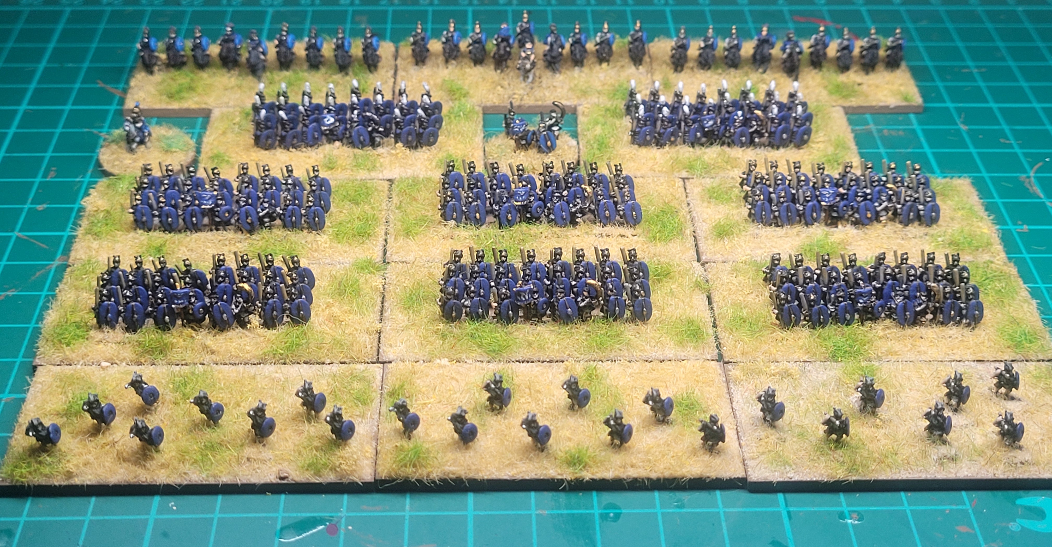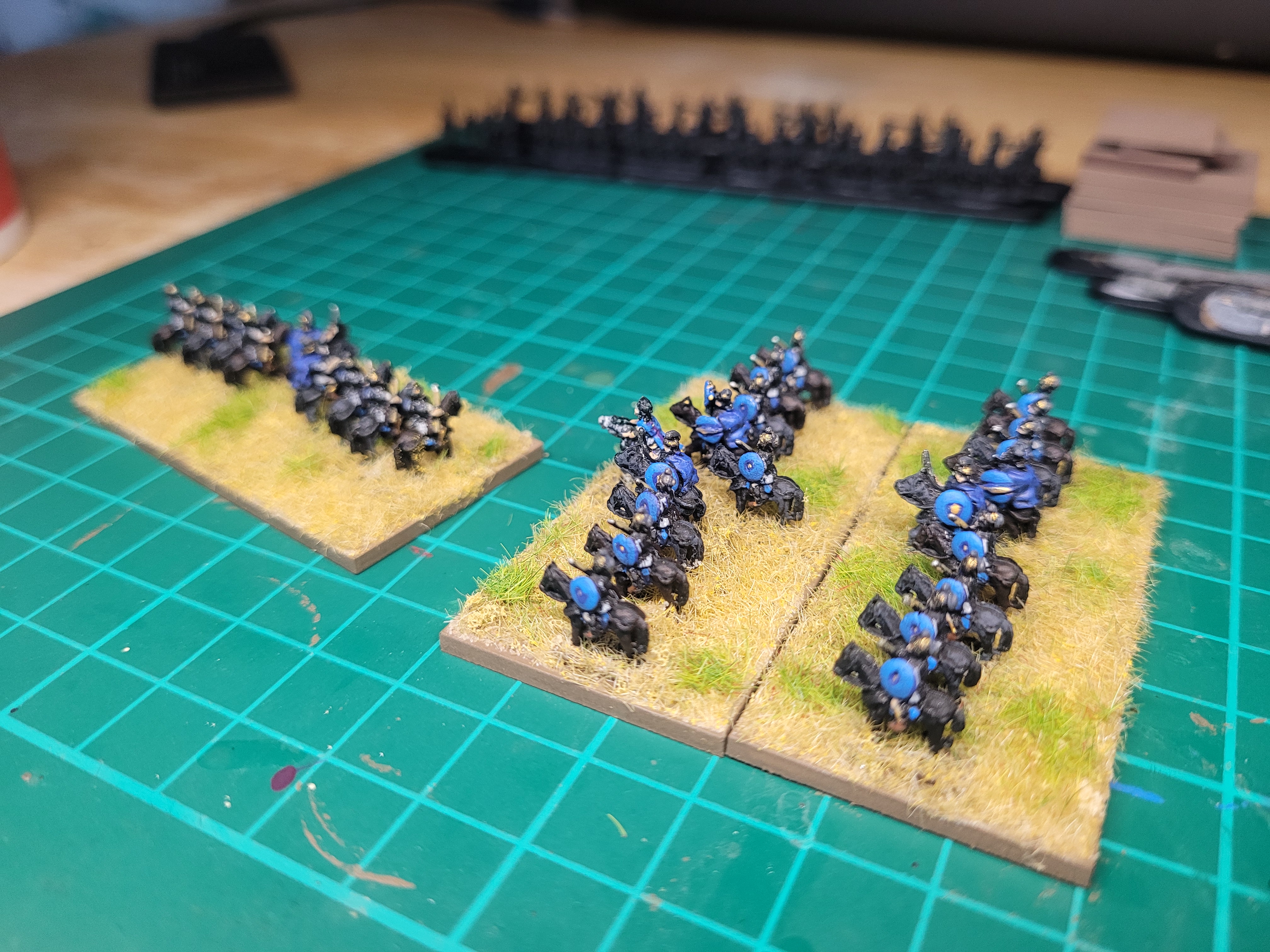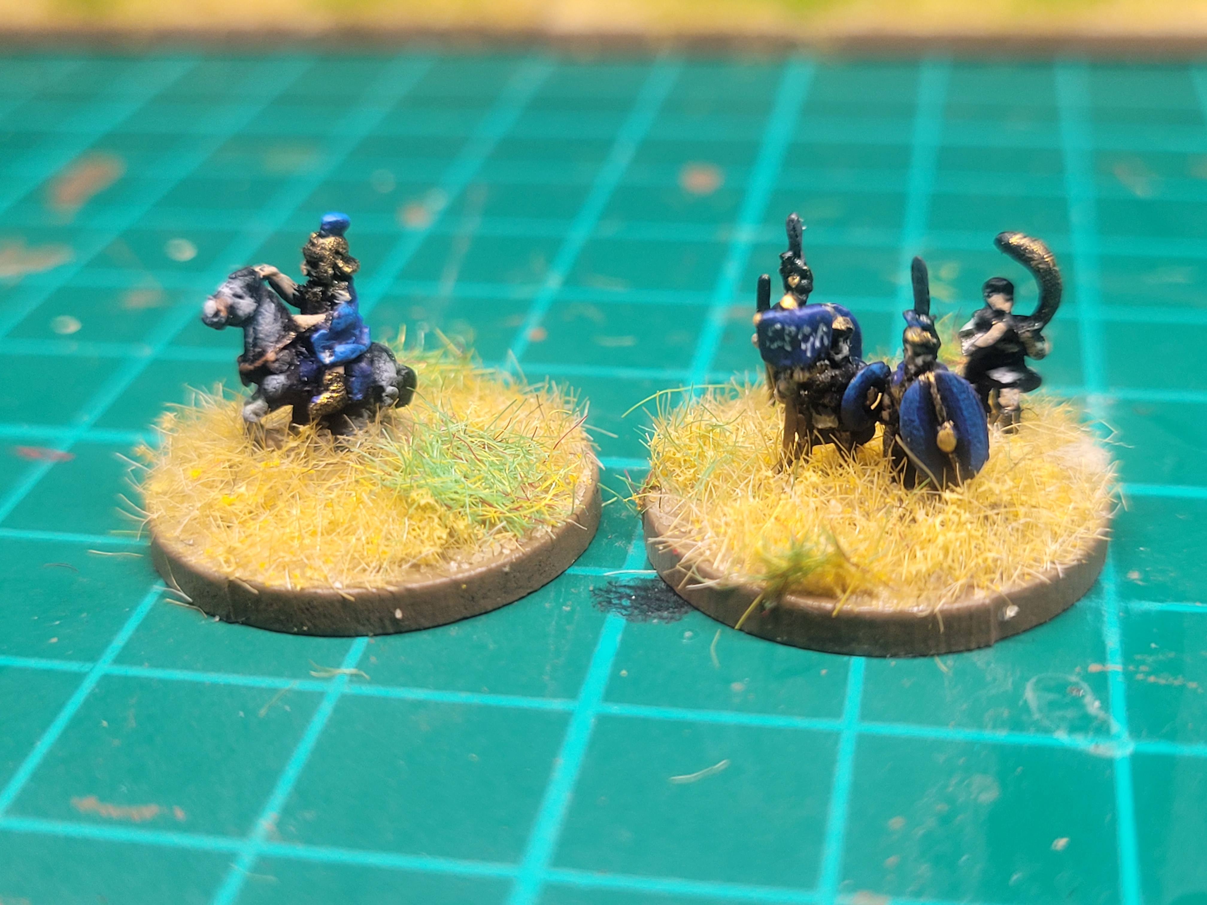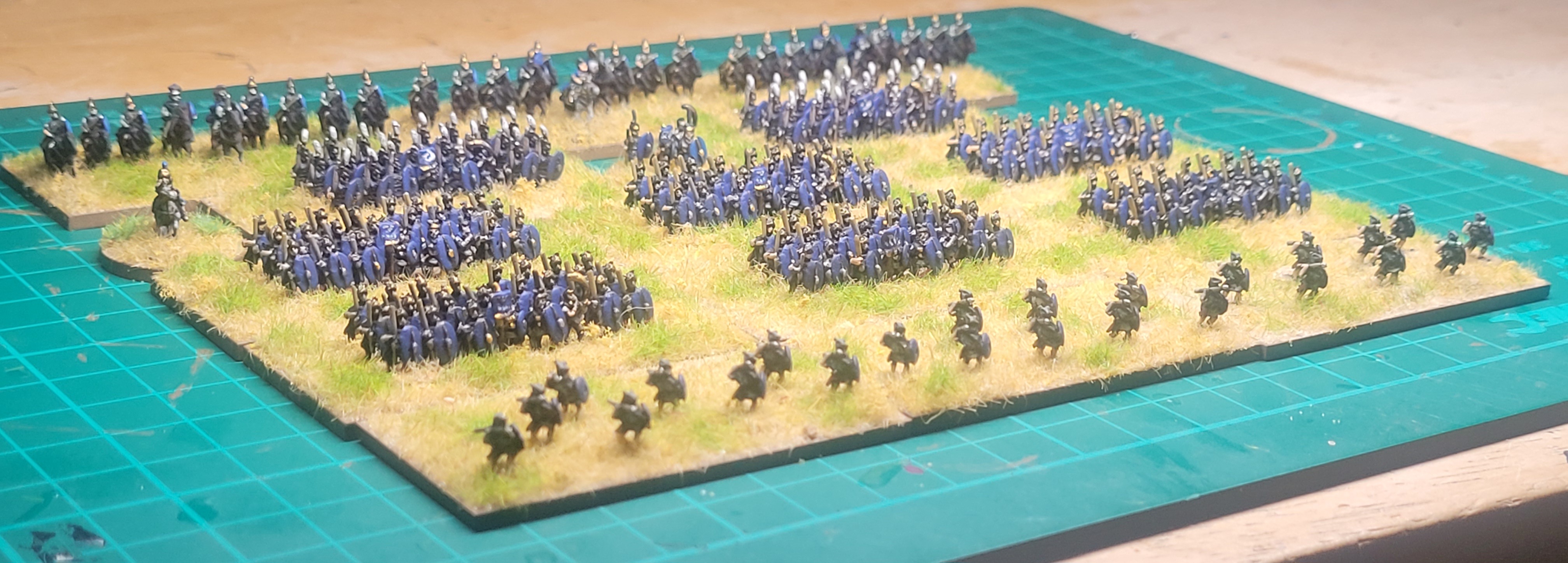 Opted for just 1 type of Cavalry unit, based in line as Medium for our own DBA identifying method (Knights/Elite Cav are based in wedge formation, Light in loose skirmish order). General in 1 of the units which works for DBA as well as Lion Rampant