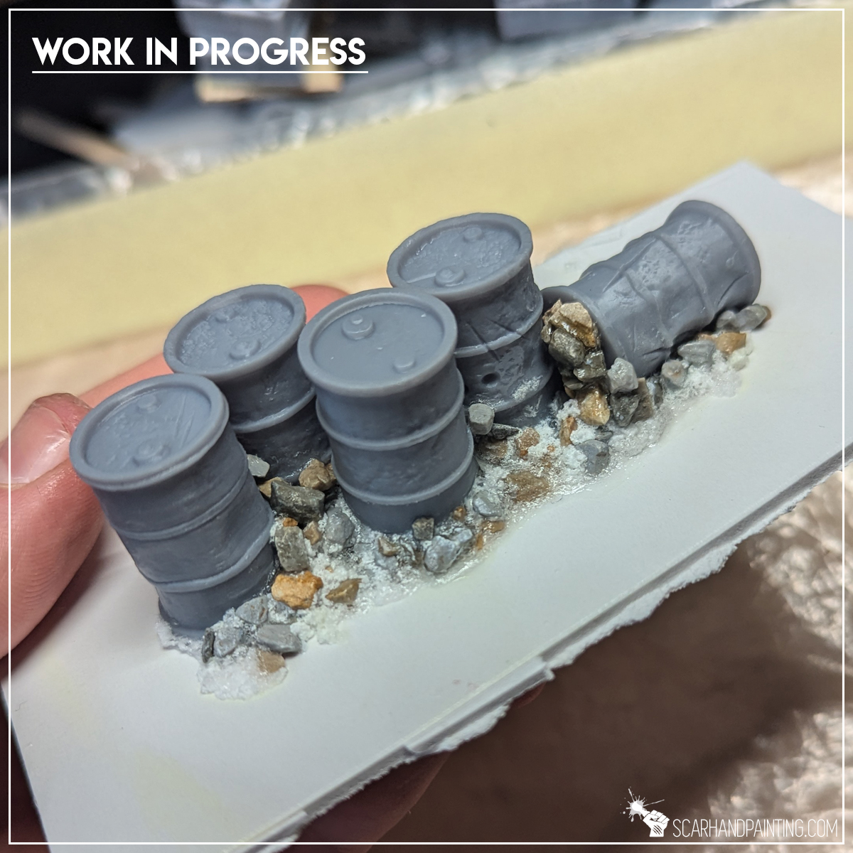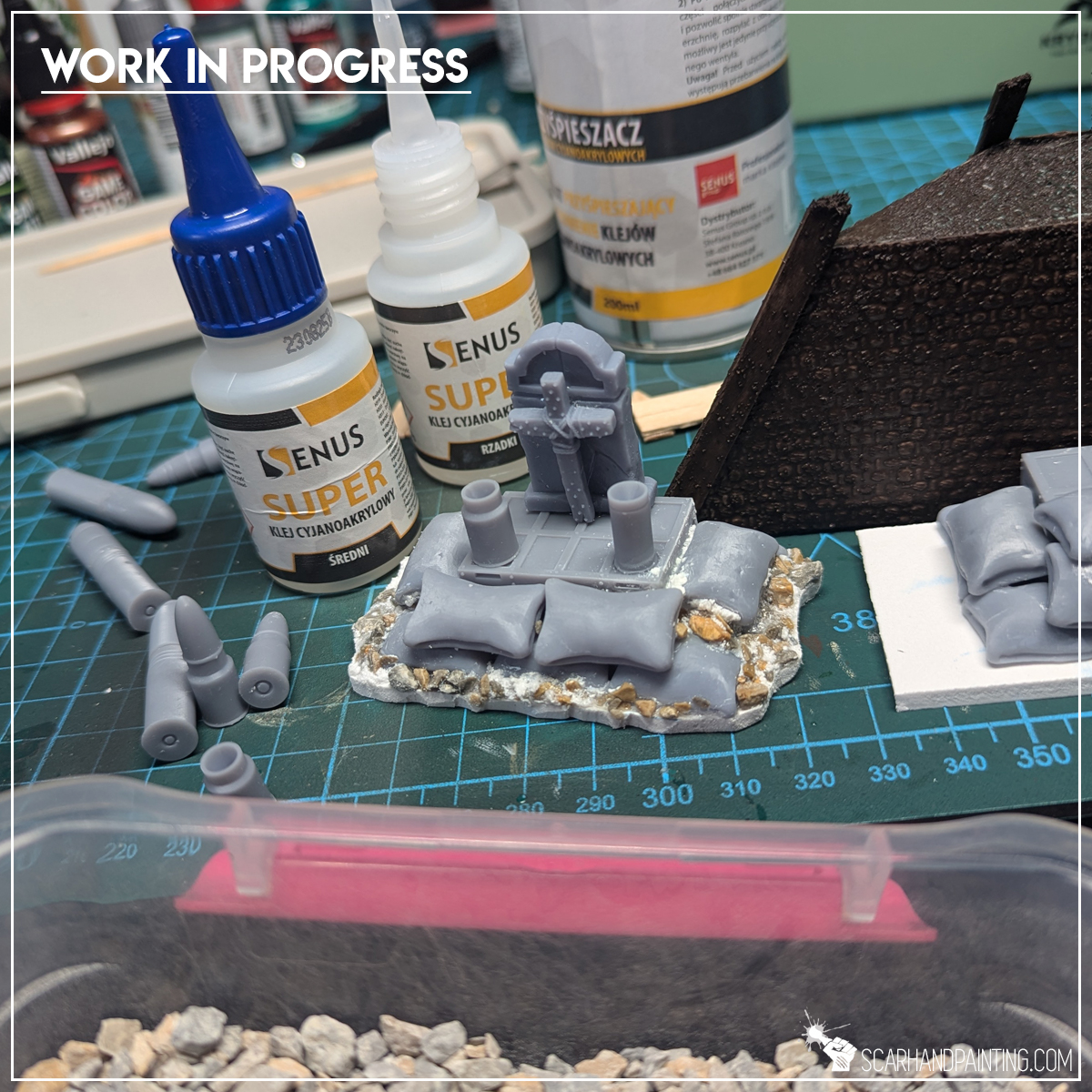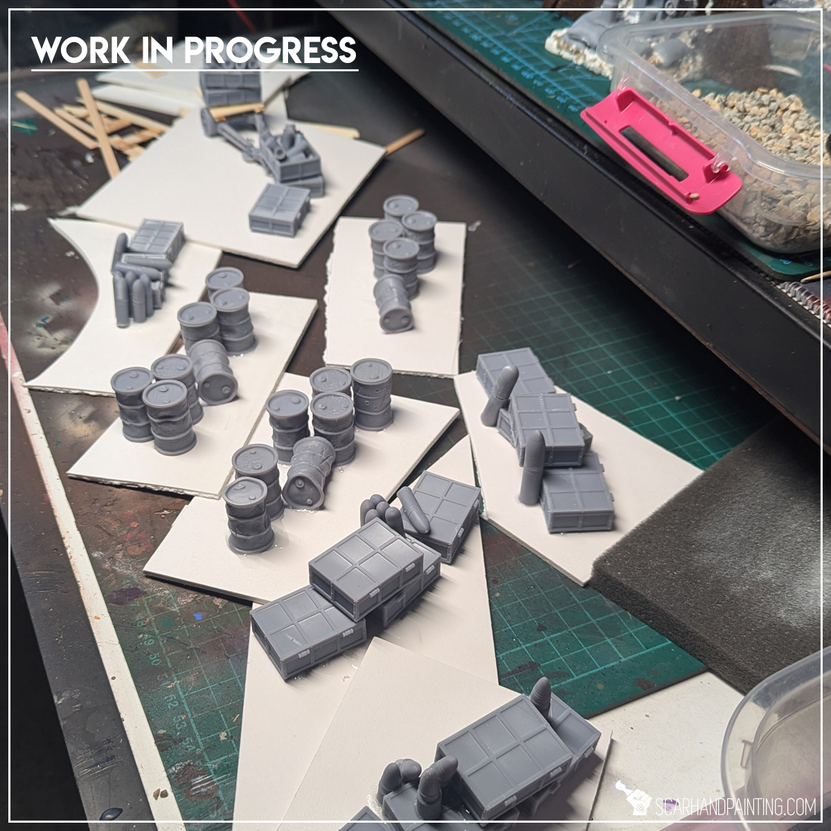 Whereas walkways and firing steps are rather simple to make from scratch, the rest is an entirely different topic. Fortunately we live in the glorious era of 3d printing. The way I approached this part of the process was to print a lot of different bitz, including crates, ammunition, artillery, sandbags and even entire bunkers. I then combined these elements on small plasticard bases, then added gravel and texture, thus creating little scenes to be scattered around the board.