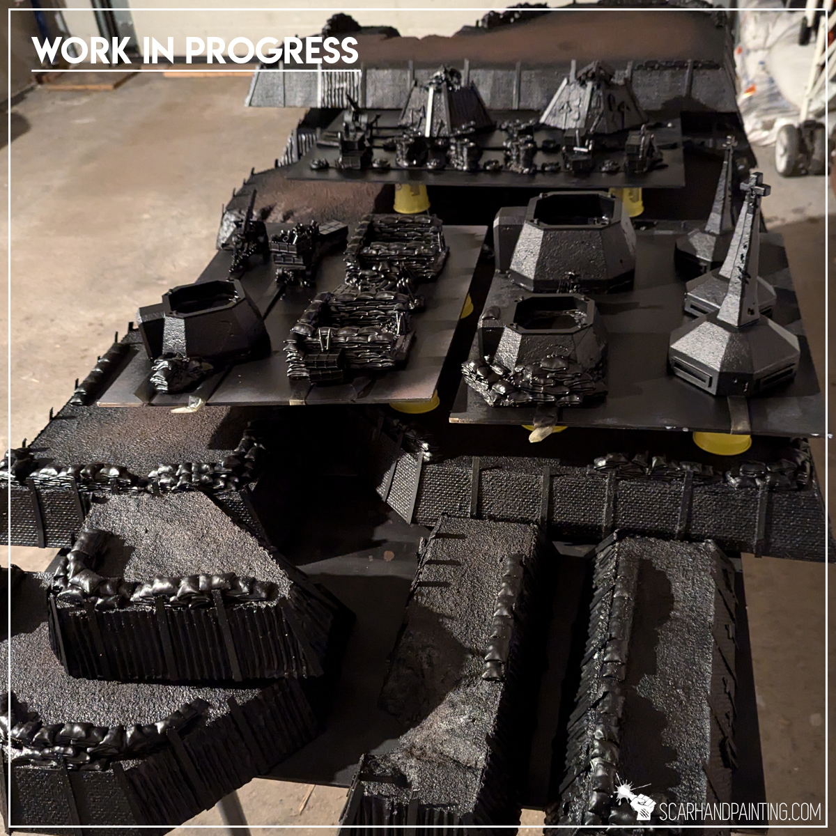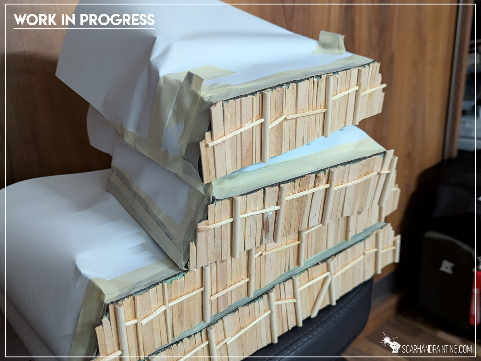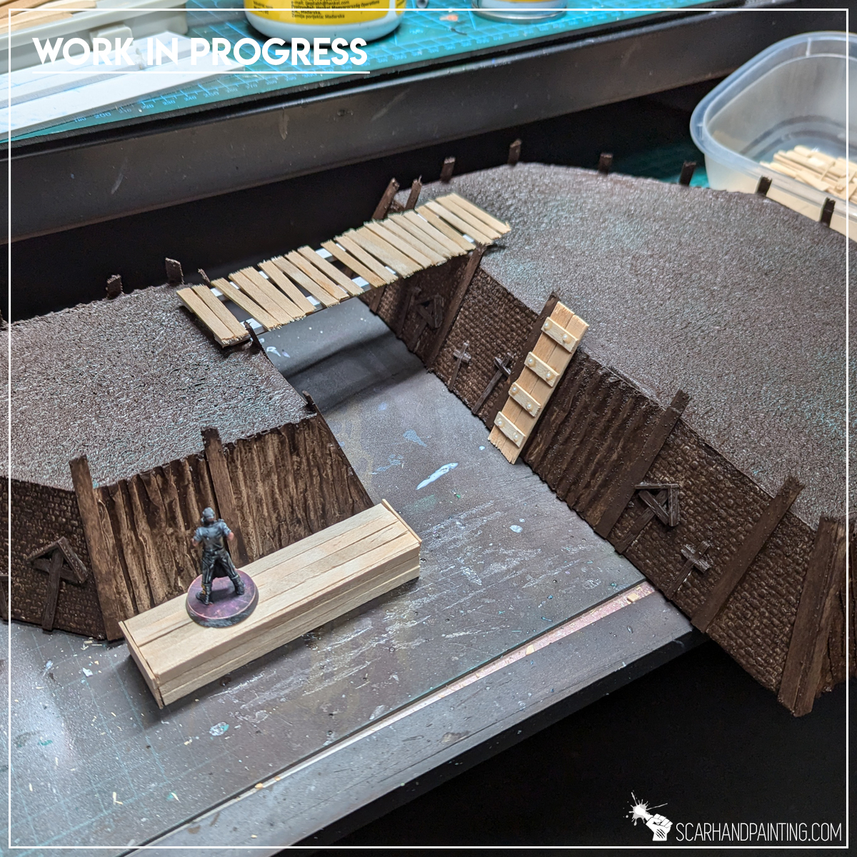 Fortunately there’s plenty of inspiration online (something that kept feeding my lust for a Trench Crusade board). I’ve ordered some styro-foam, six hundred stirring sticks, textured wallpaper, got a few STL files and a few days back I started cooking.