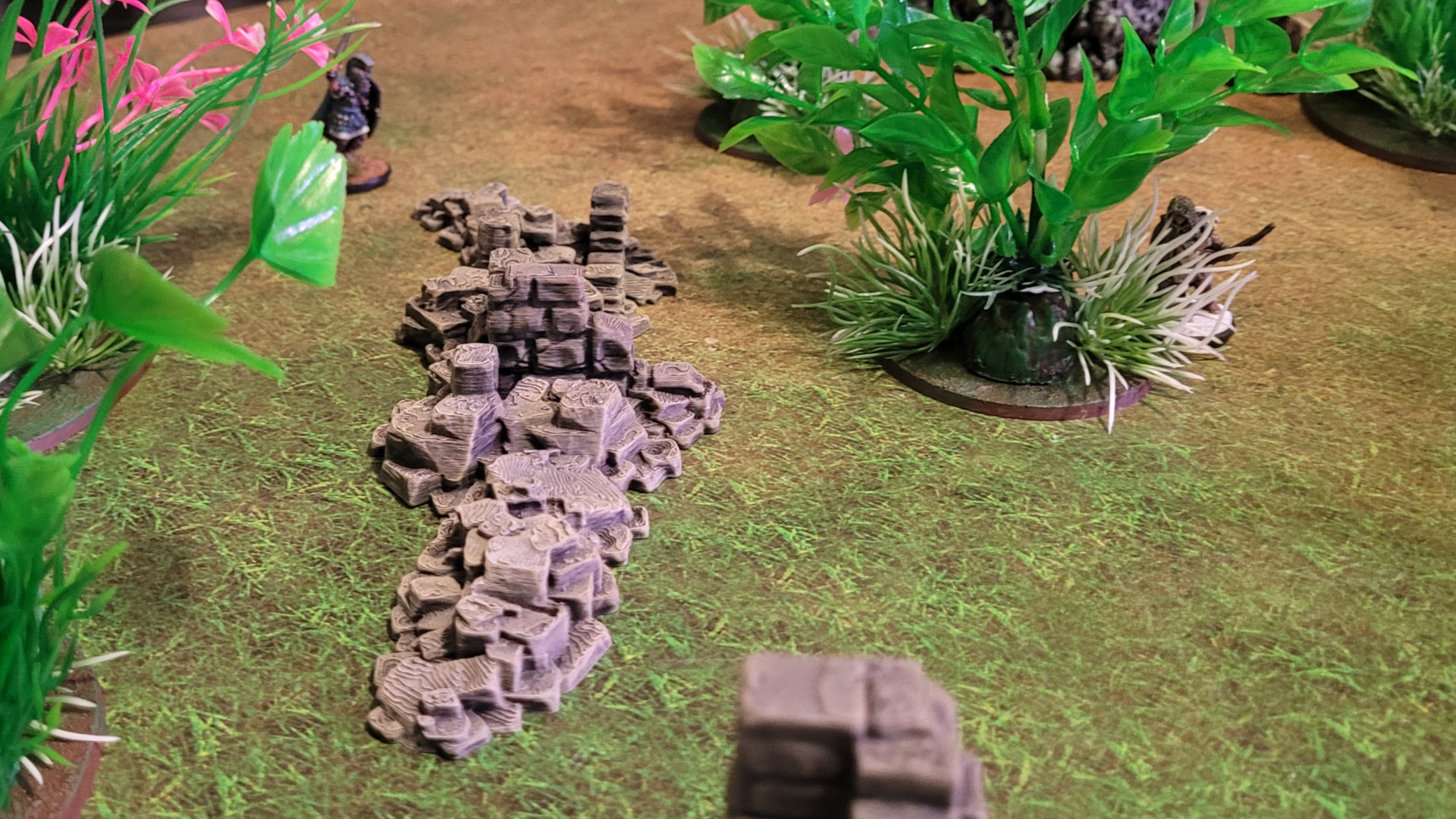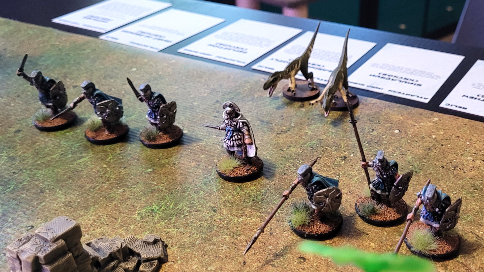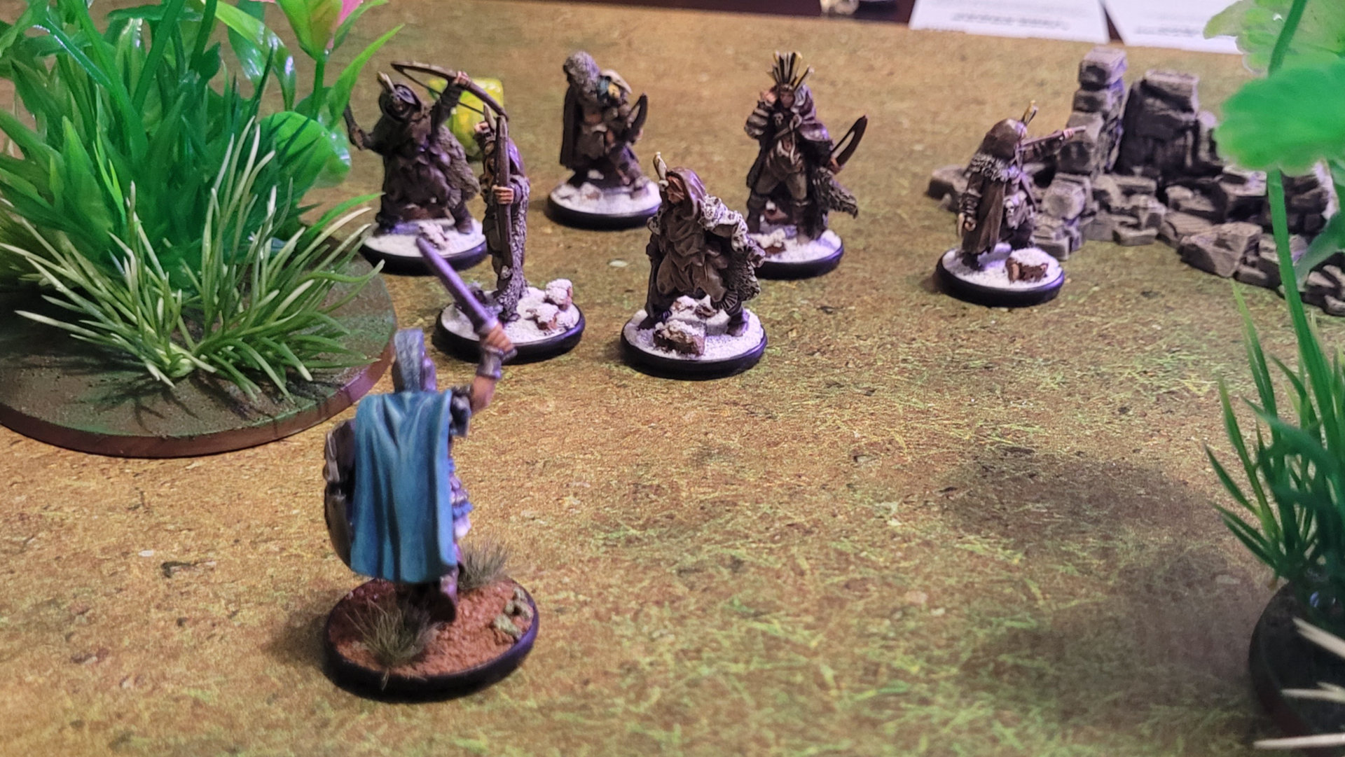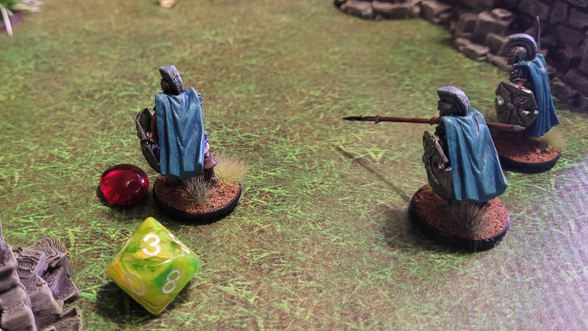 At the end of the round, each model rolls once for each time they have been hit. For a ranged attack, a roll of 1-4 is a wound, which is the end of most Bods. So at the end of the first turn I’m already down two models, one shot with an arrow and the other lost in the jungle, possibly to reappear later.