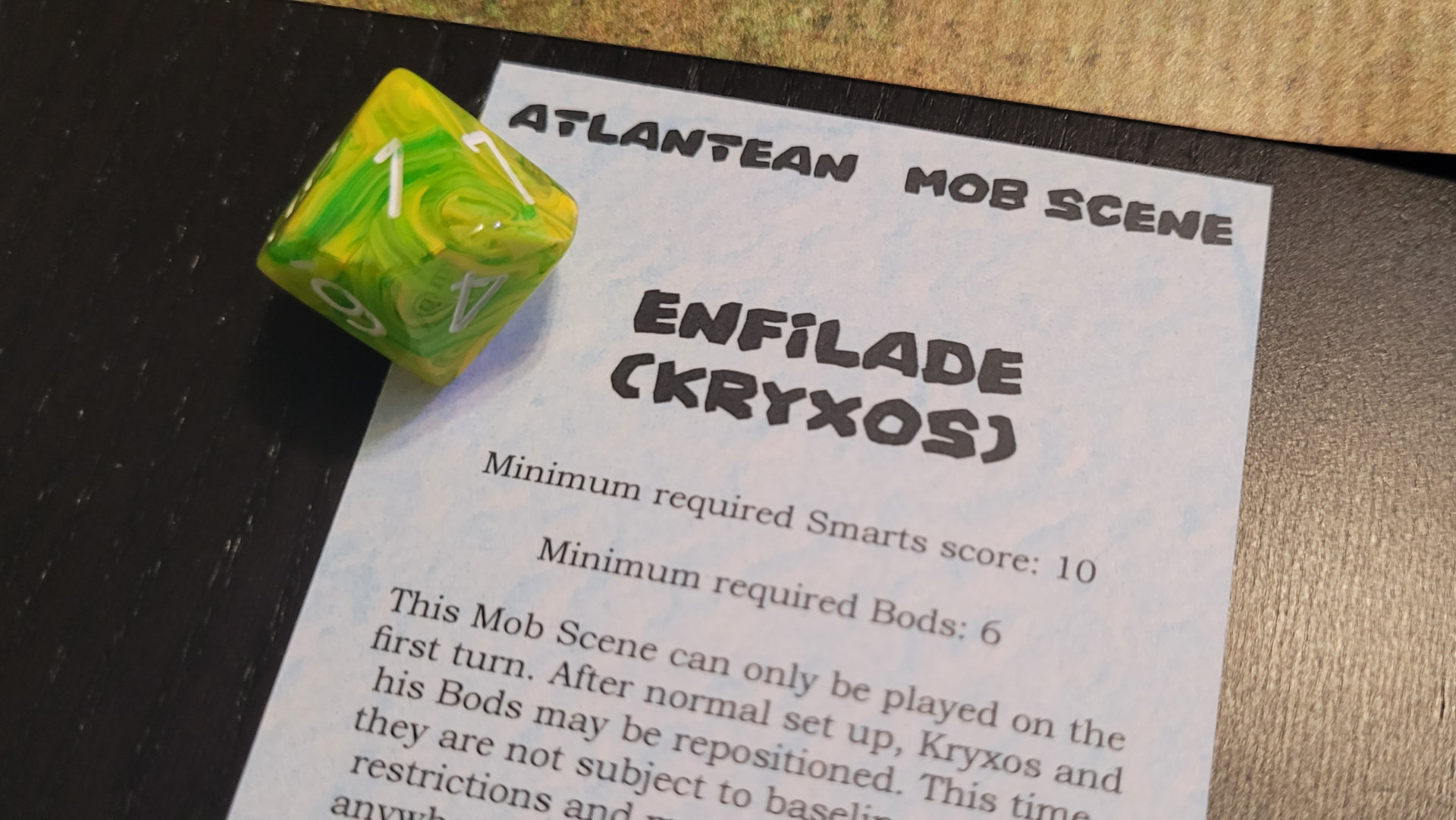 Our Double Trouble is “Ravenous Beasts,” which places 1-3 non-player beasties on a randomly chosen table edge. They will move after both players, making a beeline for the nearest model and attacking if they get into base contact. With a Moxie of 5 they’ll be pretty good at evading ranged attacks, and their massive Buff of 8 will give them a huge advantage in close combat — it’s a small mercy that they leave play after 3 rounds. Naturally, they’ll be starting on my table edge, so my Atlanteans will need to run for their lives.