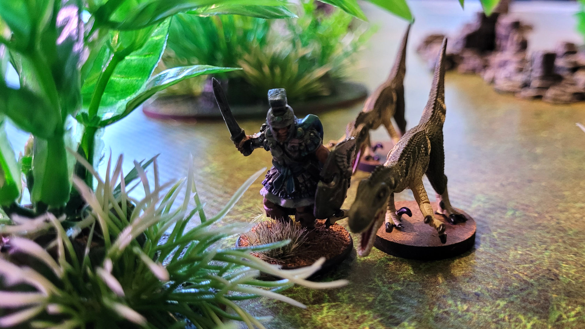 One game element I haven’t touched on yet is Double Trouble, which we finally trigger on round 4. On any round that both players roll the same number for initiative, it triggers a random encounter taken from a list that can include anything from a wave of lava creeping across the board to a ravenous T-Rex stomping out of the bushes and eating any models it comes into contact with. Double Trouble is what attracted me to Savage Core in the first place, and it is easily the most fun and interesting thing about the game.