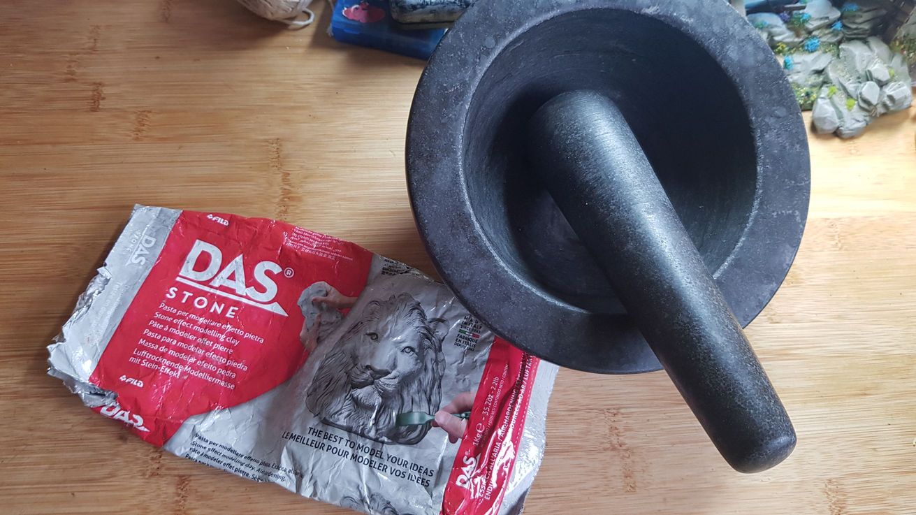 The product "DAS" is one of those modelling clays that are very cheap and useful for anything that does not require much finesse. It's likely available europe-wide and I'm sure that the US has equivalents.I made simple “pancakes” of thin but varying sizes with it. I waited at least a week for them to as hard as they would.. Then smushed them up with a heavy mortar and pestle. I left them at very varied levels of “smushed-ness” for effect, as a sort of “grit”.