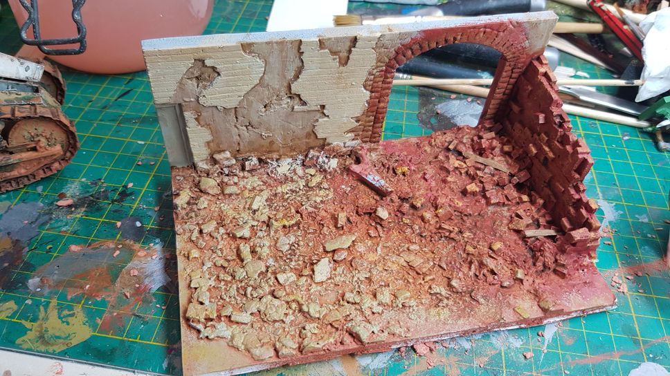 The far ruined brick wall is various waste pieces of foam board crudely sliced into brick-ish shapes and applied on top of each other to form the basis of a thick, very destroyed, load-bearing wall. There are a lot of crude 3mm long foamcore “bricks” mixed in with the terrain too.
