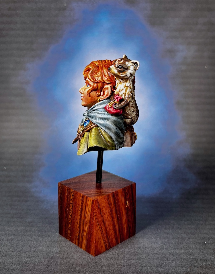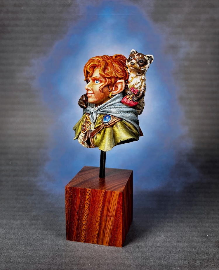 I arrived at KublaCon (the Khan of Cons!) in Burlingame, California Friday afternoon and immediately dived into Speed Painting and Minis Painting classes. One of them (We Drink and We Paint Things) was set up for us to bring a project to fine tune or fix. I brought this fellow as I wanted to fix a few things I was still not happy with. Saturday morning I headed down to the Paint and Take area as they had good lighting and worked a couple more hours on detailing, specifically the hair an fur in the shadowed areas as well as the halfling’s face. This was my third year entering Masters Class (showing with the pros) and I earned a certificate of achievement last year so I was really hoping for a Bronze to show my growth. Won’t lie, when the last Bronze trophy was awarded and my name hadn’t been called, my stomach dropped but true to his roguish nature, my halfling bust had snuck into the Silvers! I earned a Silver in Masters Class!
