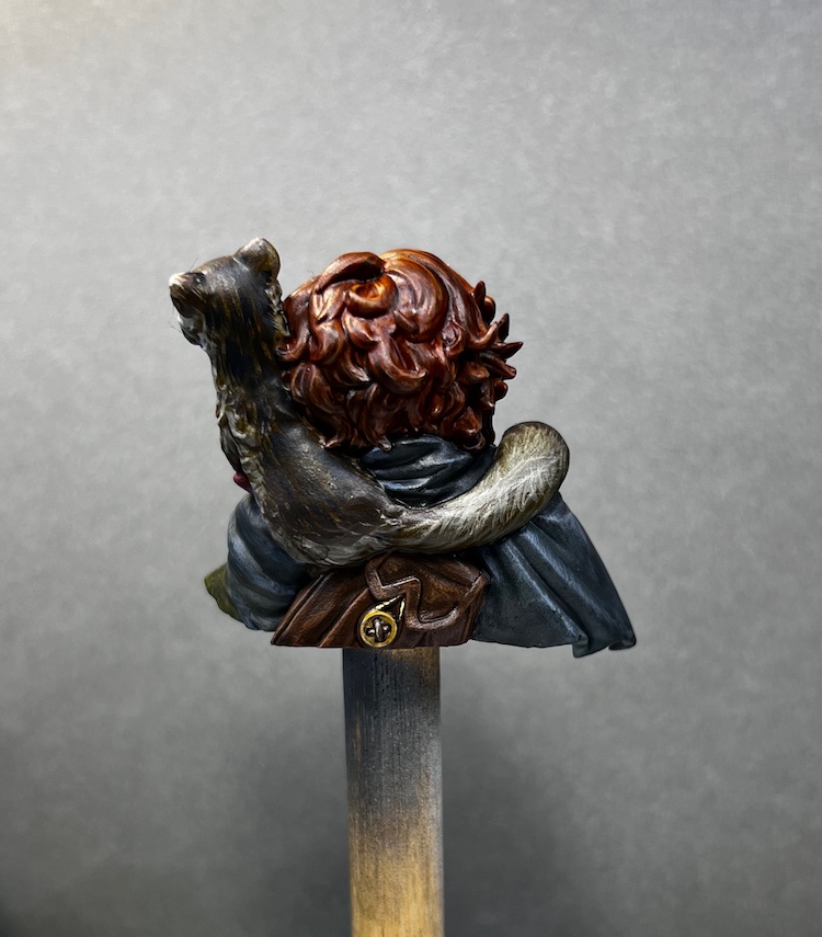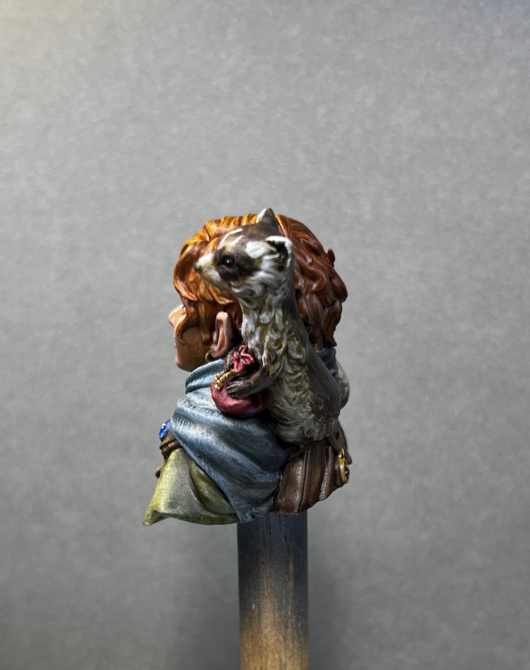 The shirt received some touch up and I began painting in the fine lines of a grid pattern and started painting the buttons. I’m still working on the cloak and the jacket as well. I don’t think they show a sense of lighting yet. The halfling’s hair is in a similar state. I’ve also begun laying down color on the ferret but there’s still a lot more work left on the furry fellow. Oh, and the buckle got some greenish brown which I hope makes a good dark end of the NMM.