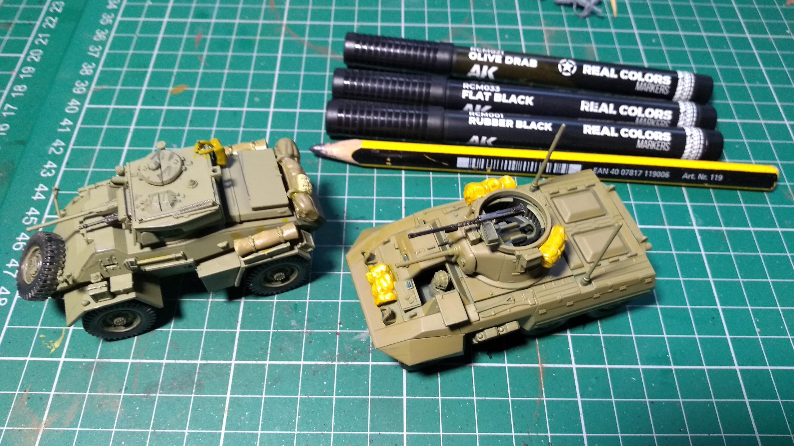 Pioneer squad finished found asprue of Blitzkrieg minis from an magazine so used some of them to do more upright poses instead of kneeling type. Primed vet squad and pioneers with Vallejo German panzer grey so they are now ready to finish.Then decided to do a quick paint job on my two scout cars, the Humber MK III and the American M8, quick prime of Army green then used my paint pens to finish, quick wash all over just driver in the M8 to do and done, decals to be chosen when I decide on unit and then weathering to finish.