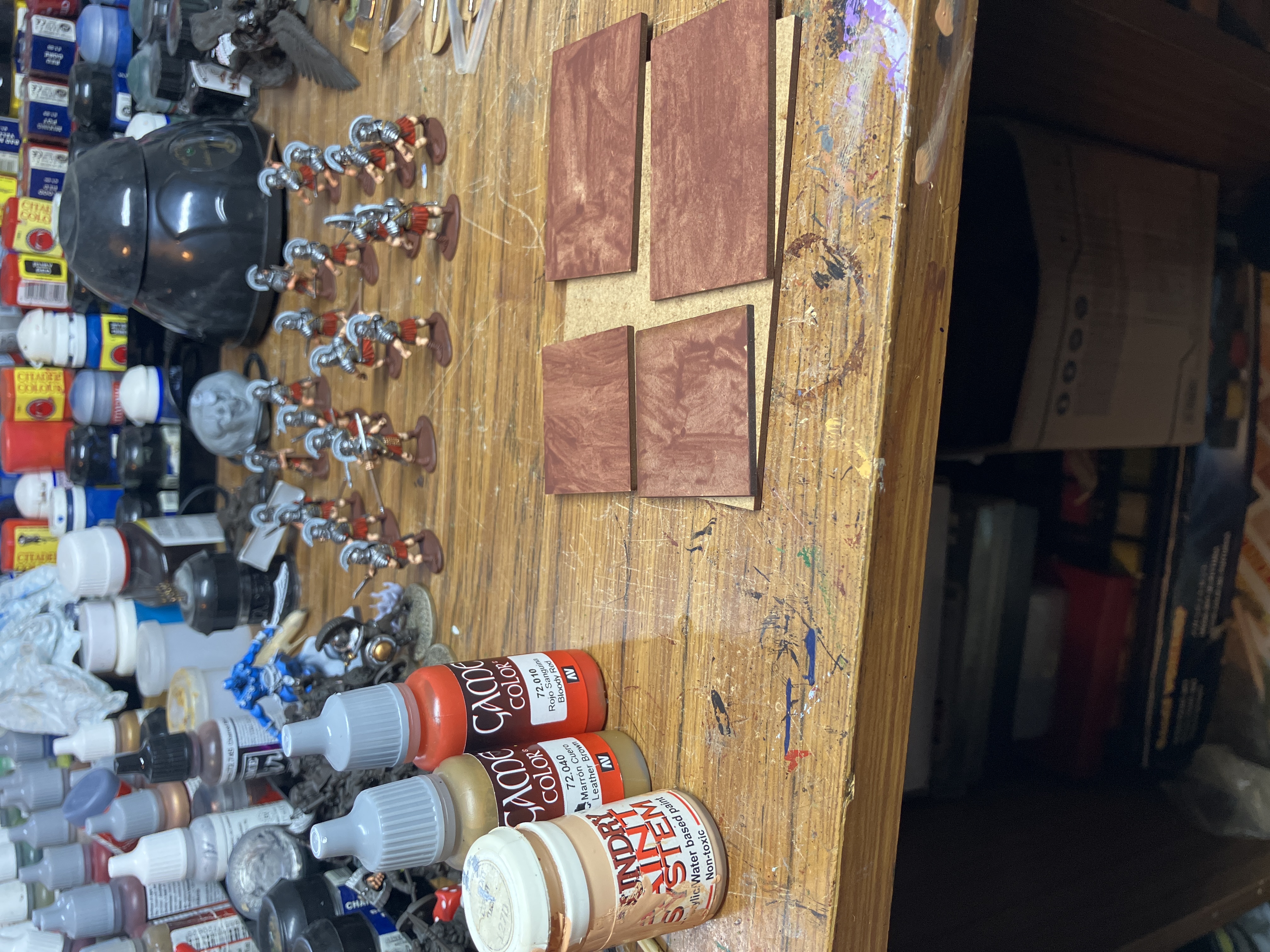 shapes were roughed out with Vallejo game colour leather brown (closest equivalent to citadel snakebite leather I used originally), and highlights applied with citadel bubonic brown and very old citadel bleached bone.