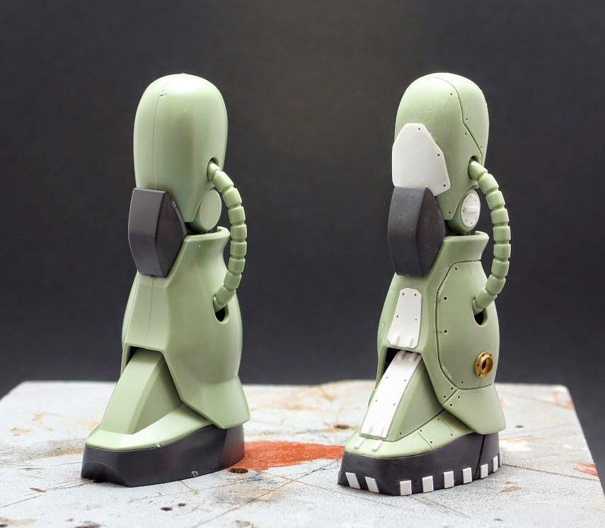 In order to make the Zaku look like a new prototype, I had to change a few more characteristics of the body, and not just the head. Therefore I thought of adding some extra body armour in the form of plates made from plastic card.