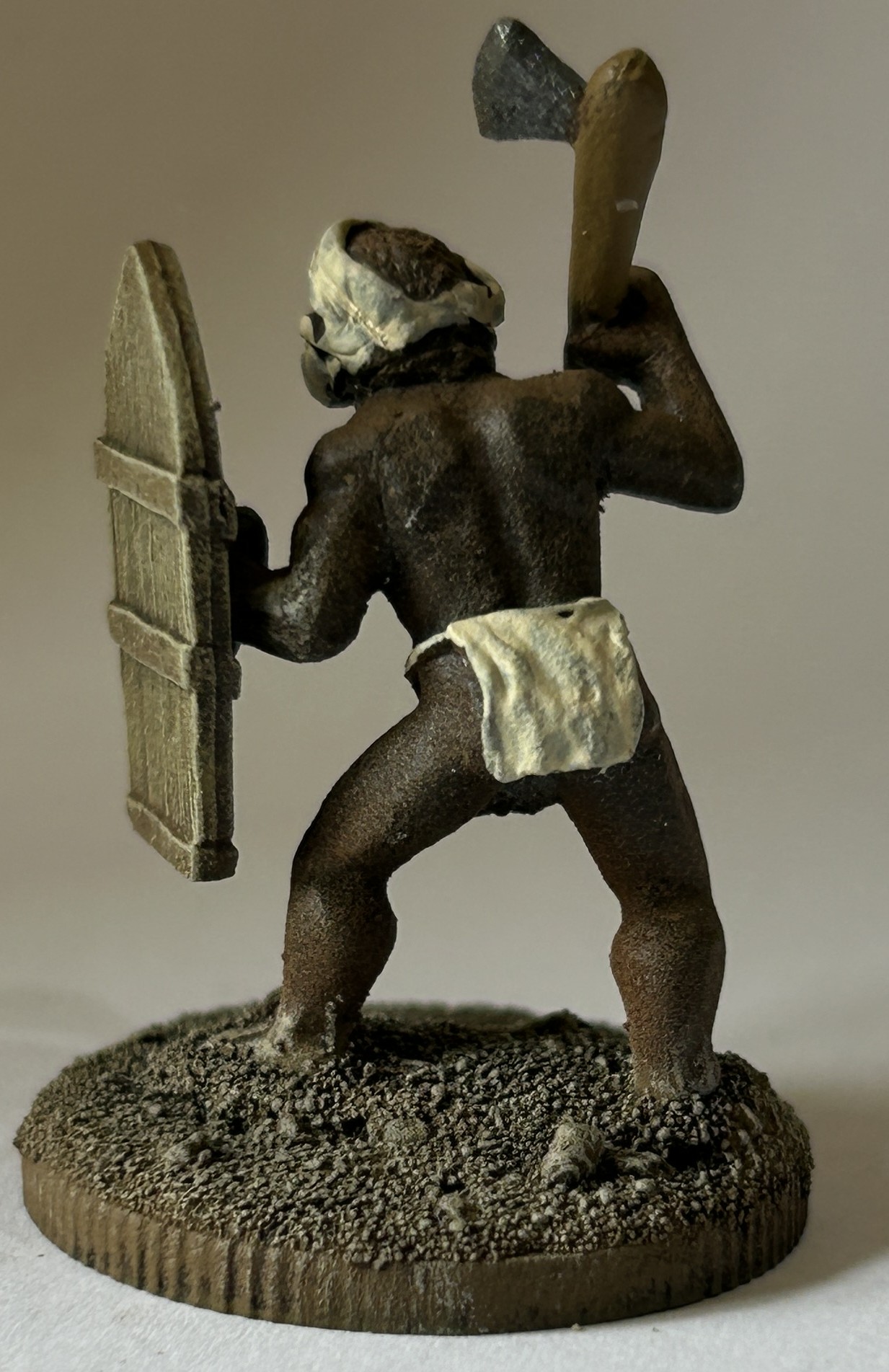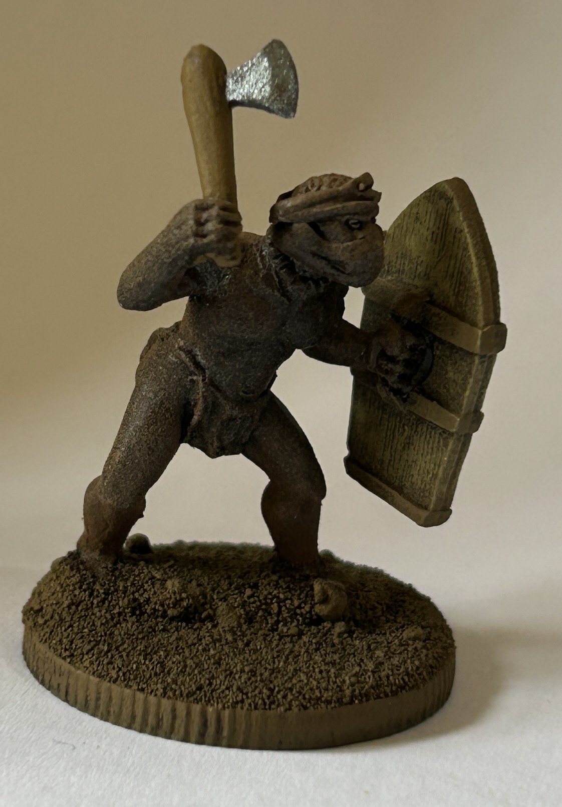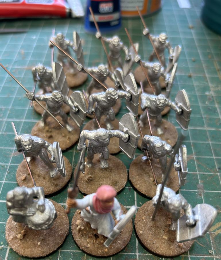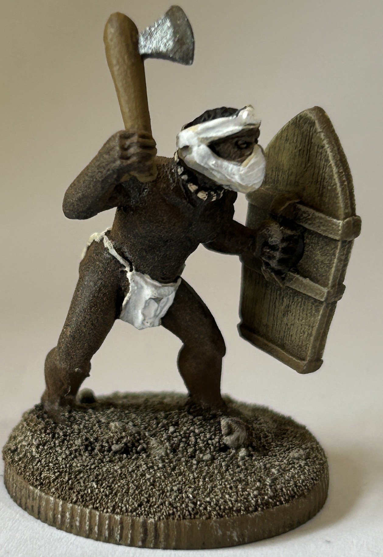 Now onto weapons. Most of the warriors have spears. The art shows long slender shafts so I went for wire spears that I cut to length with tin snips. For a bit of visual variety on axeman is in each unit. Vallejo Earth on the haft and Gunmetal for the head.