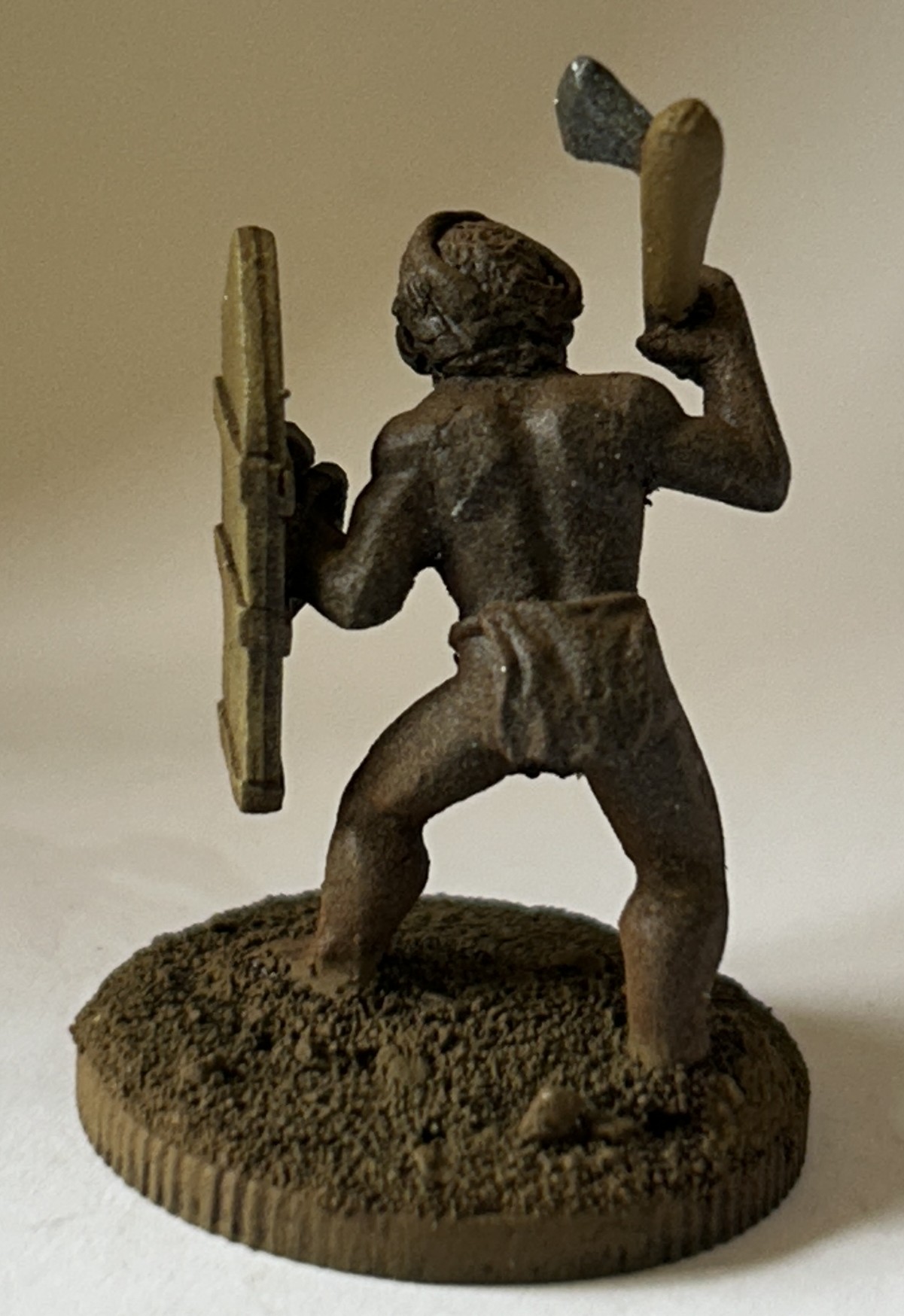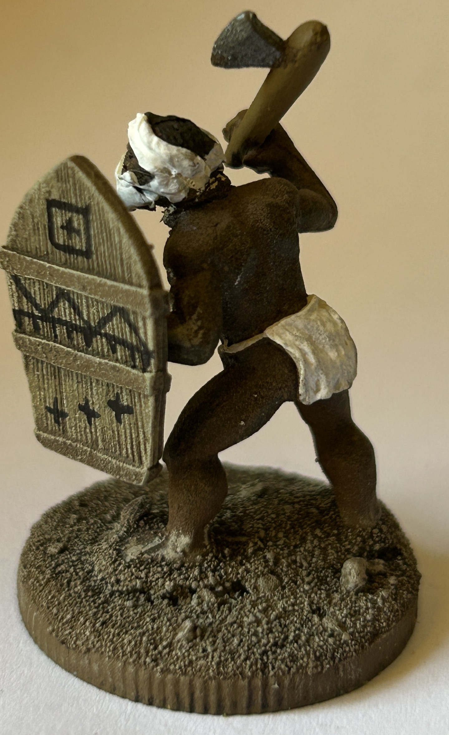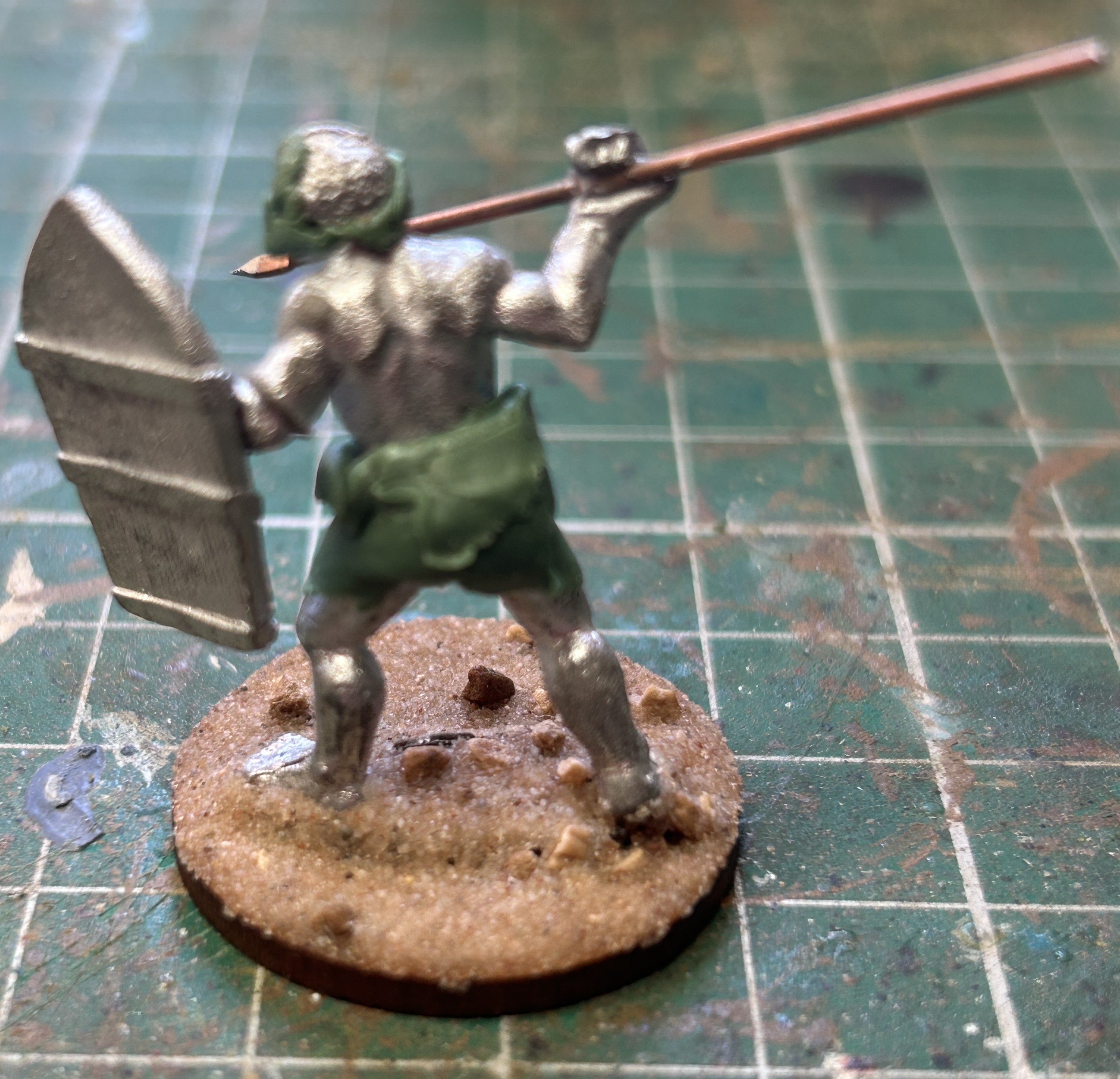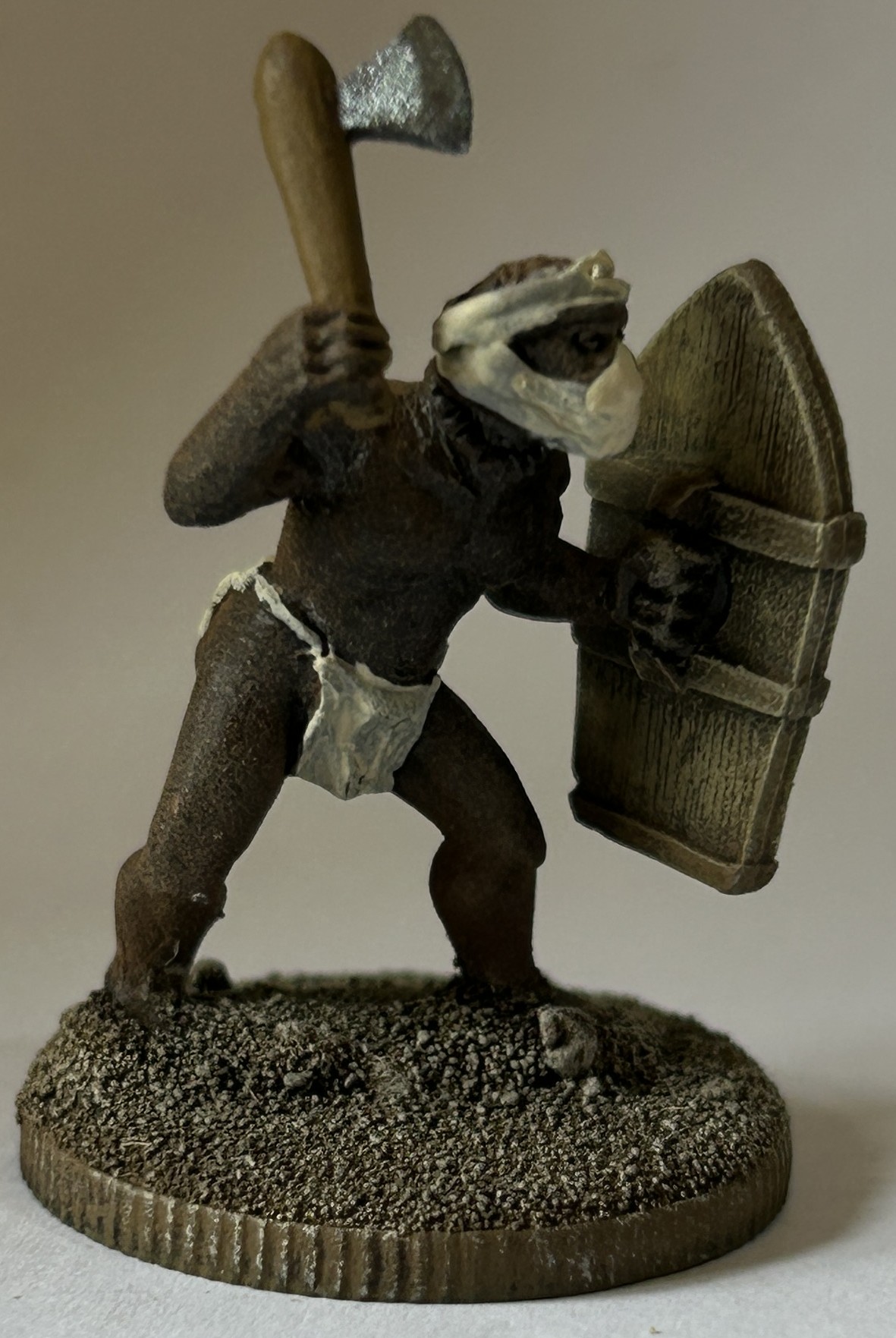 Now onto weapons. Most of the warriors have spears. The art shows long slender shafts so I went for wire spears that I cut to length with tin snips. For a bit of visual variety on axeman is in each unit. Vallejo Earth on the haft and Gunmetal for the head.