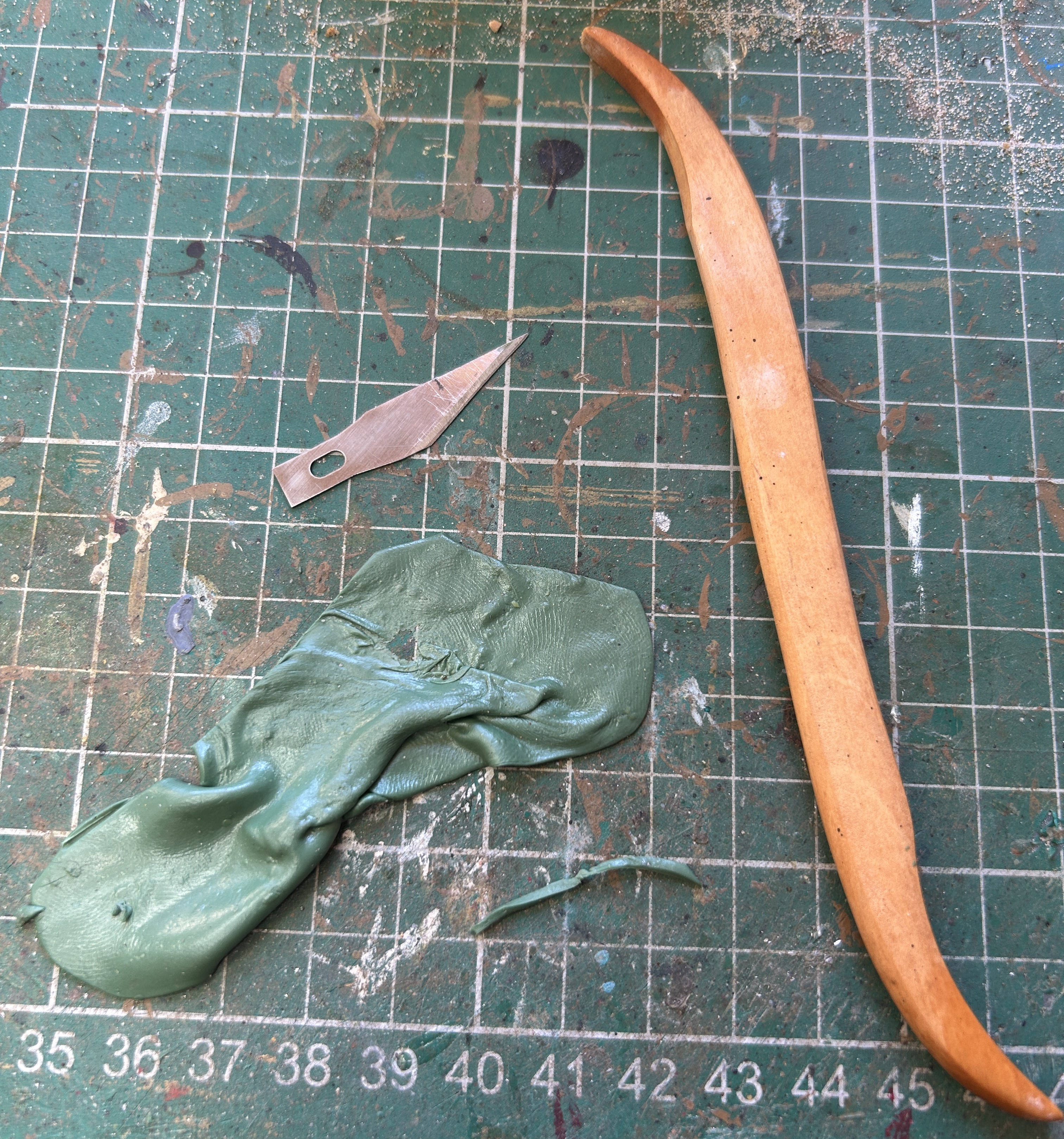 This first version was my attempt at an impressionistic version with the pattern on the rear section not matching the original. I didn’t like it so erased it and redid it to match the original. Then I started applying the colours. Here are the first two, black and Wolf Grey. I also used Flat Red and then had to mix a yellow from white and AP Ancient Honey as I don’t have all my paints available to me due to getting ready to move.