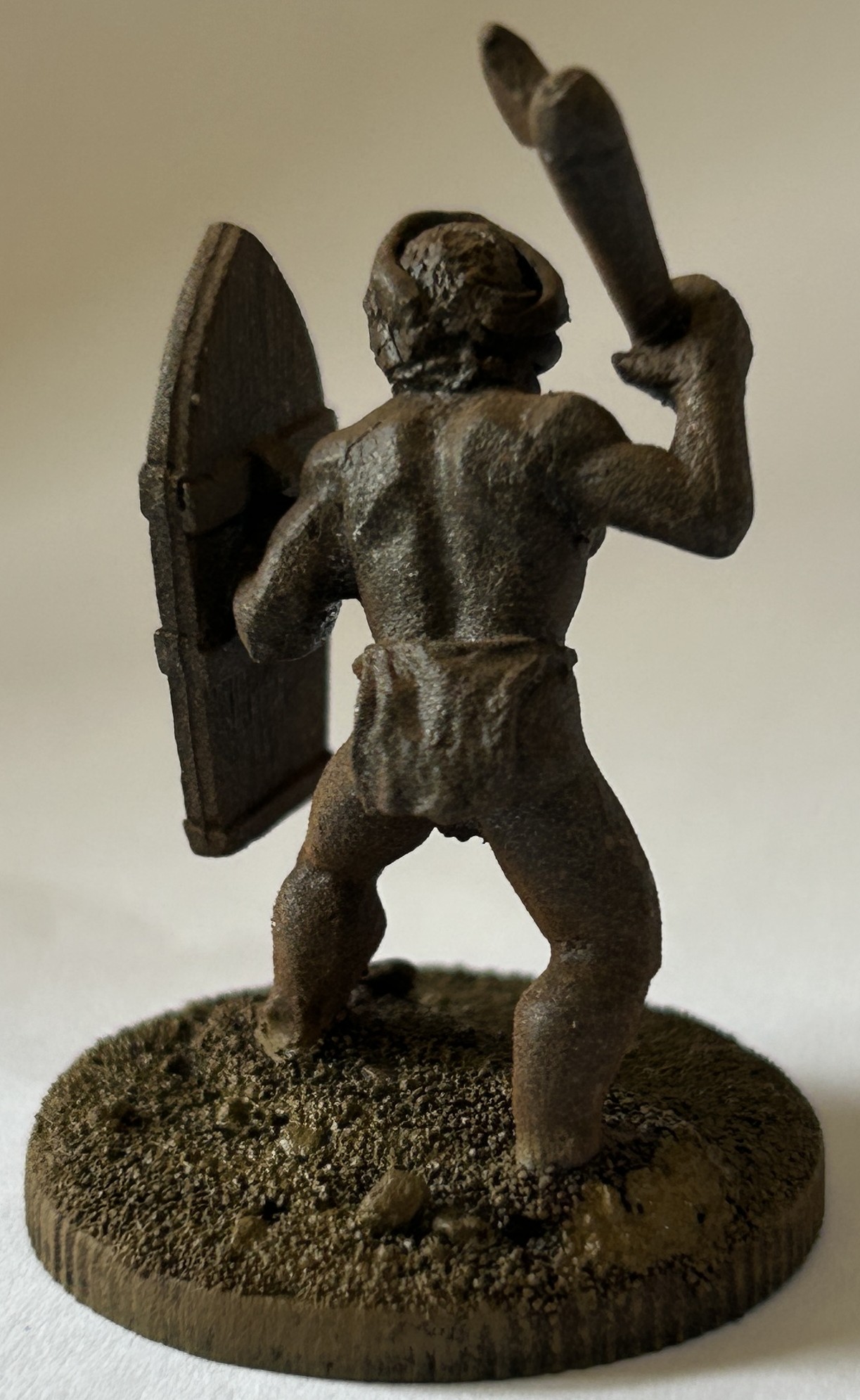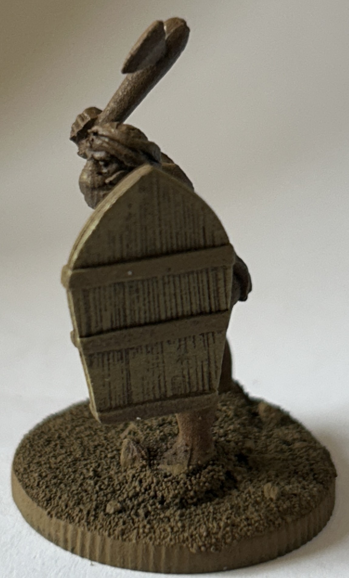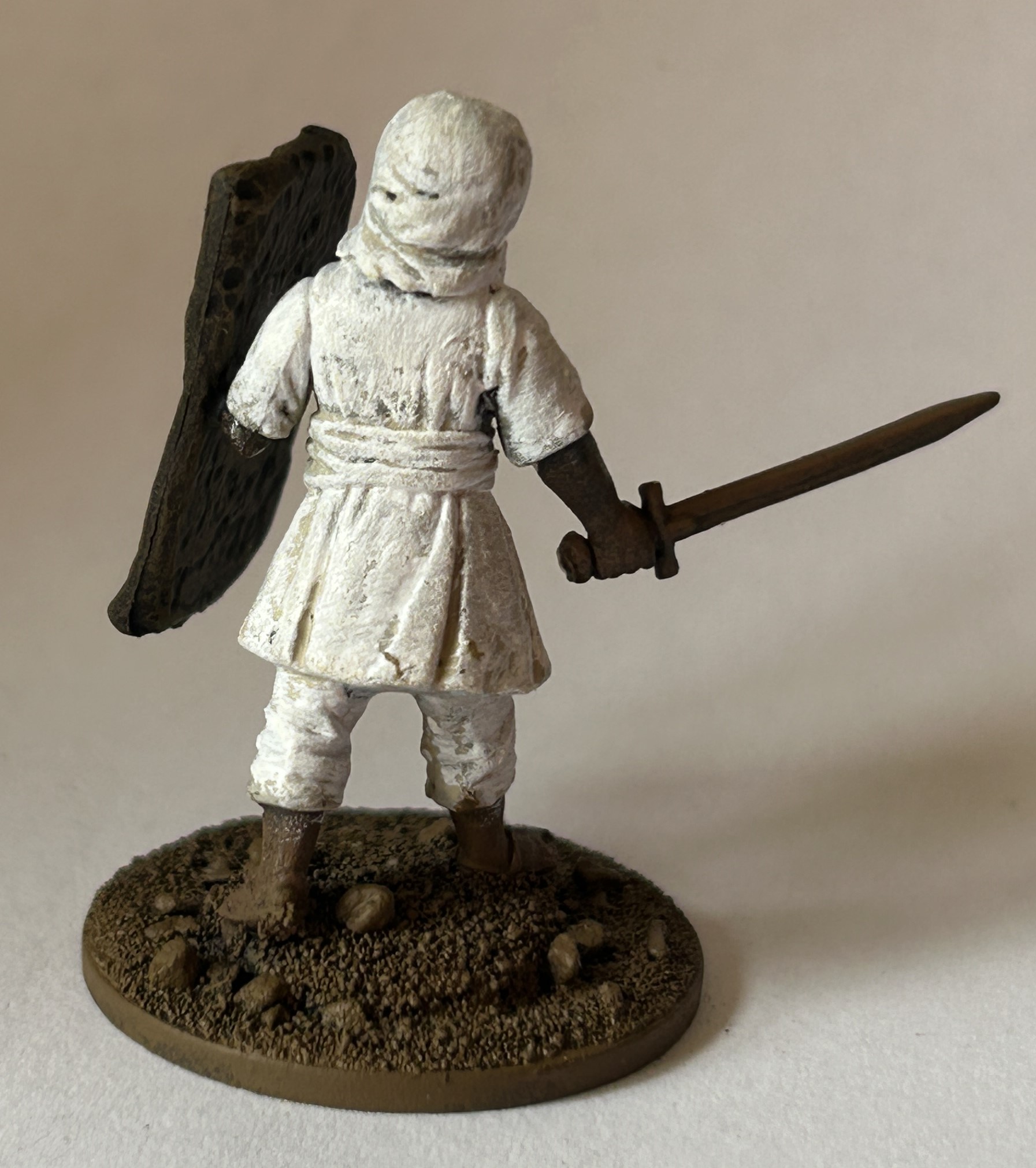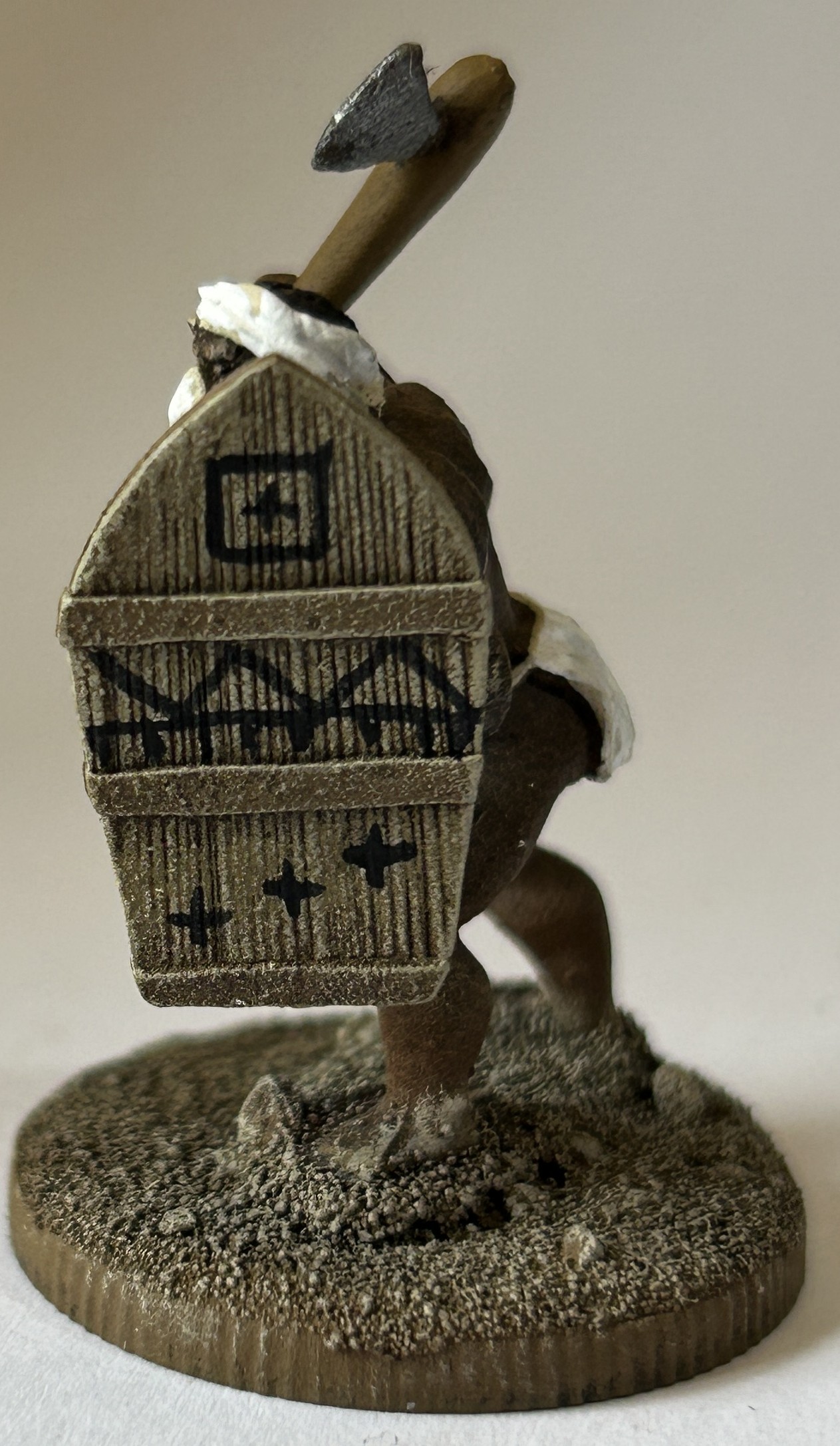 Finishing touches now. White is generously overbrushed (like dry brushing but with a wet brush) onto the cloth areas. Any final details also picked out – this one has a necklace but there are arm bands too, most probably they were made of ivory. The shield is finished with some basic designs inspired by the artwork – crosses (even ones, like a plus sign) seemed quite important so most shields got these. I used Black Speedpaint but ink would have been fine too, anything thin so you get good flow whilst using a very fine brush, mine’s 0000. The lines are thicker than in the art but they don’t take long to do and look fine en masse.