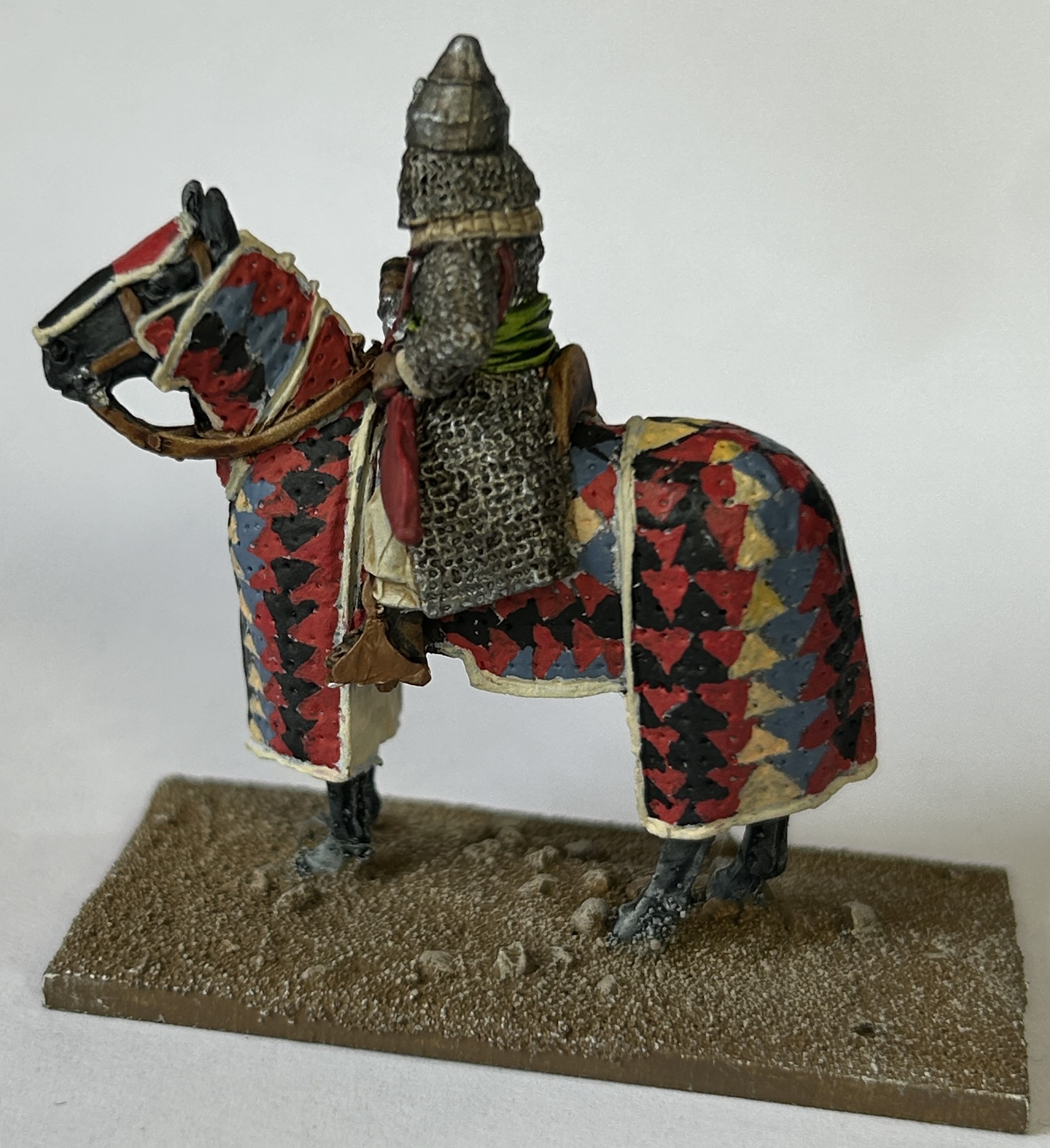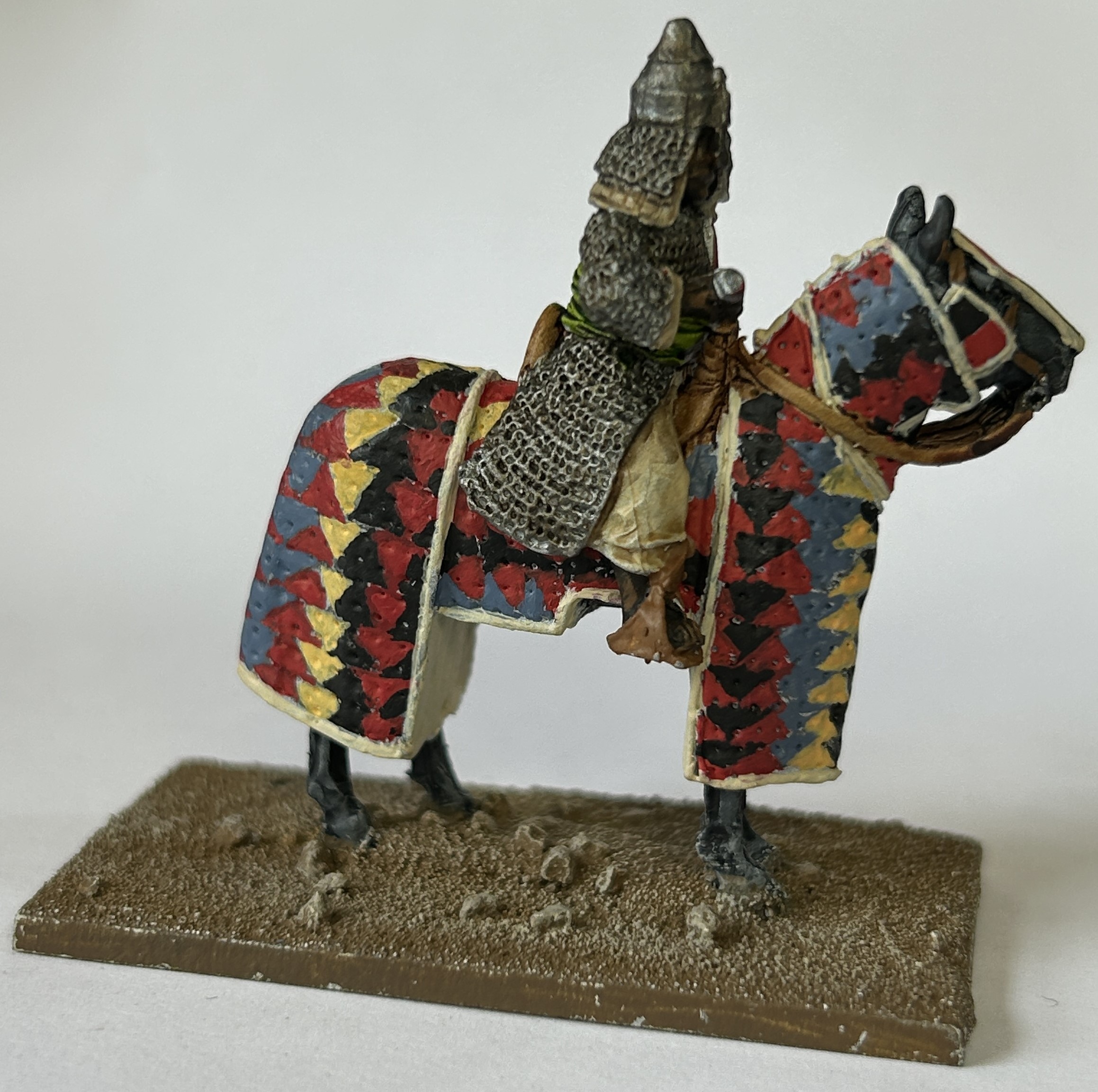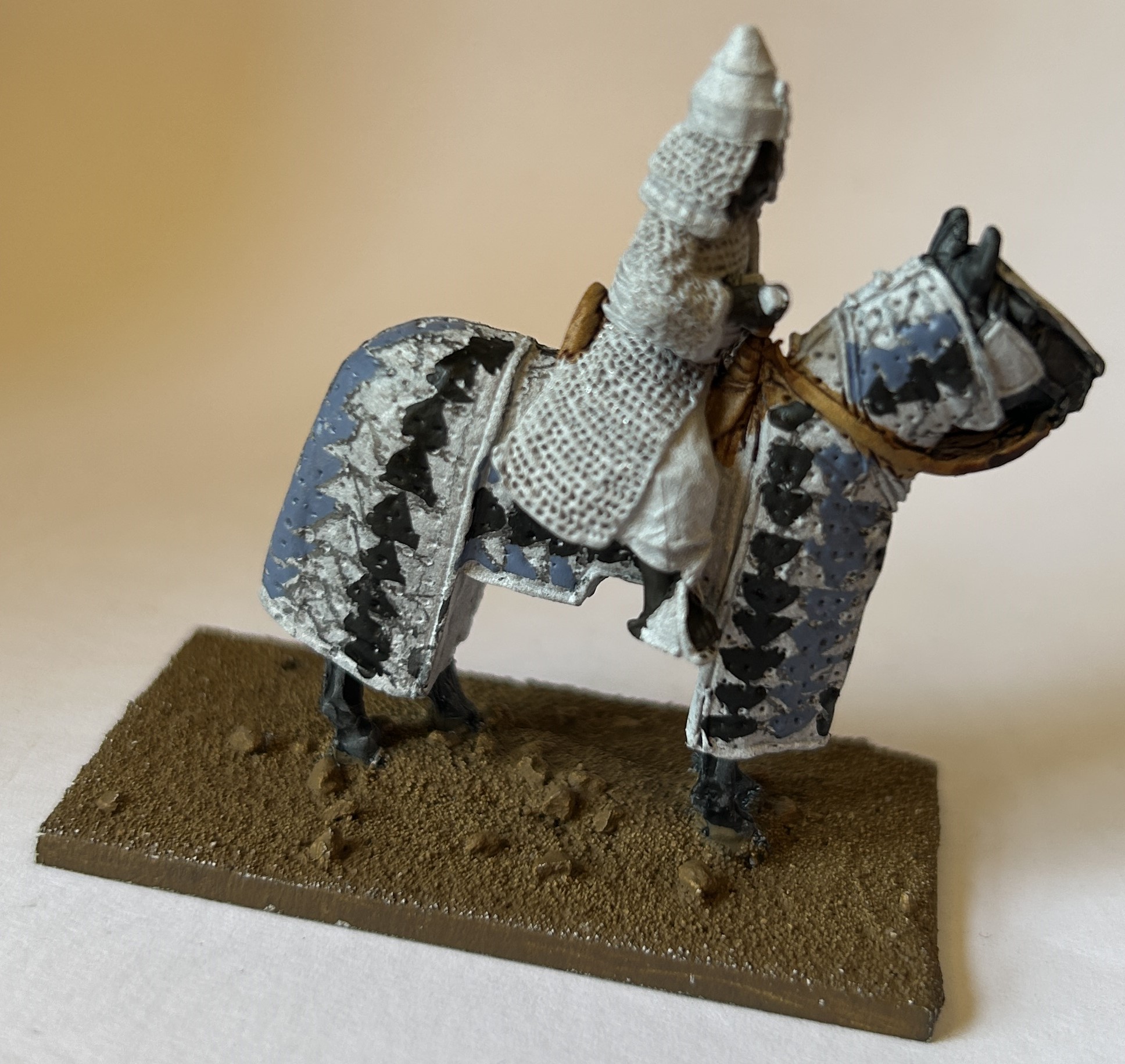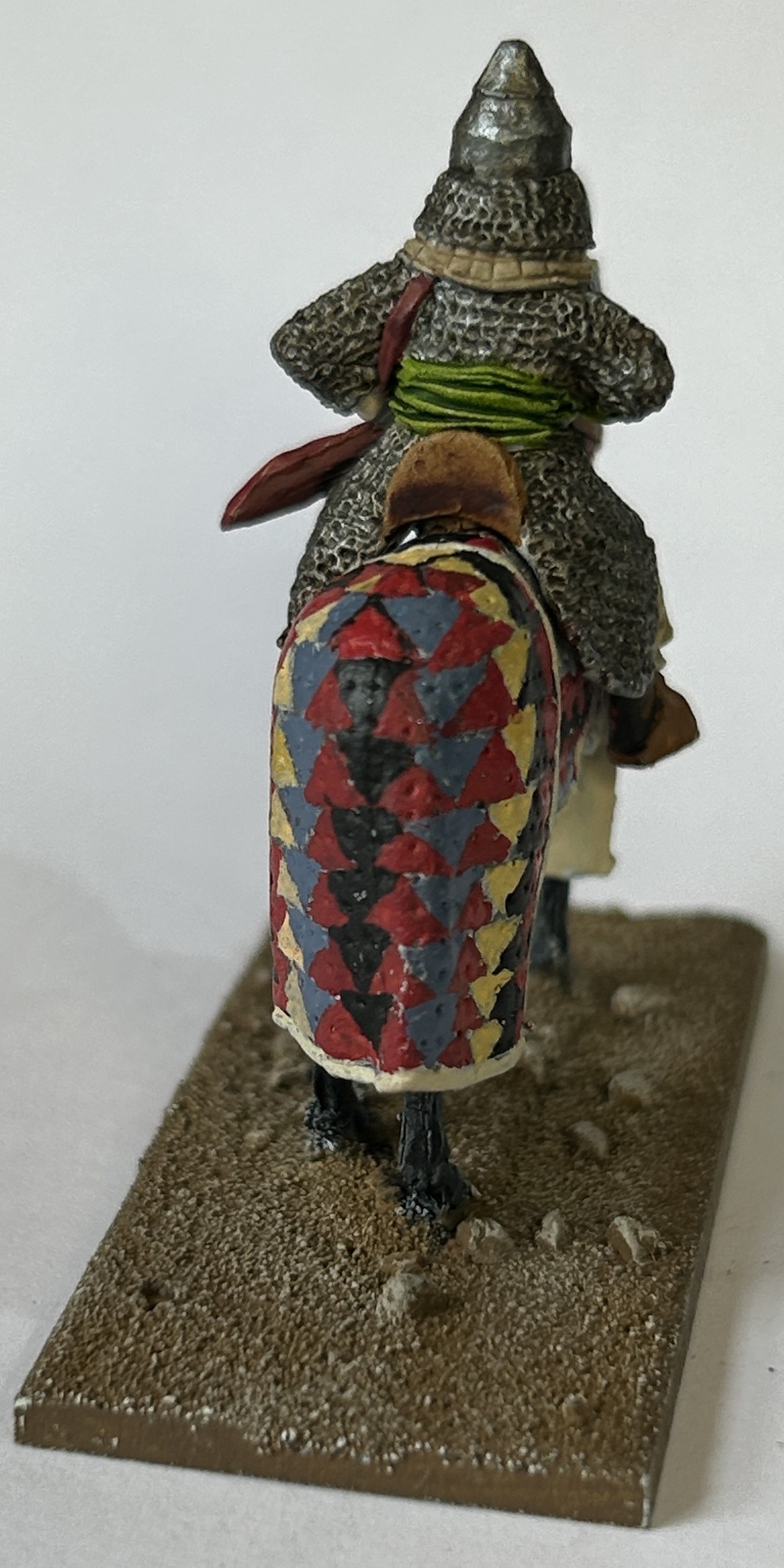 It is hard to get an idea of what it will look like until you get to this stage with all the colours on. I was plesantly surprised that it looked pretty good and the pattern is a good impression of the original with colours in the same order and place on the barding. The colours aren’t clear enough and some of the undercoat is showing through. Whlist this is accurate to the original this is probably due to the ravages of time so I’d like the colours clearer. While I did that I took the chance to make the triangle shapes clearer and tidied up the shapes at the top of the rump where the various sections converge.