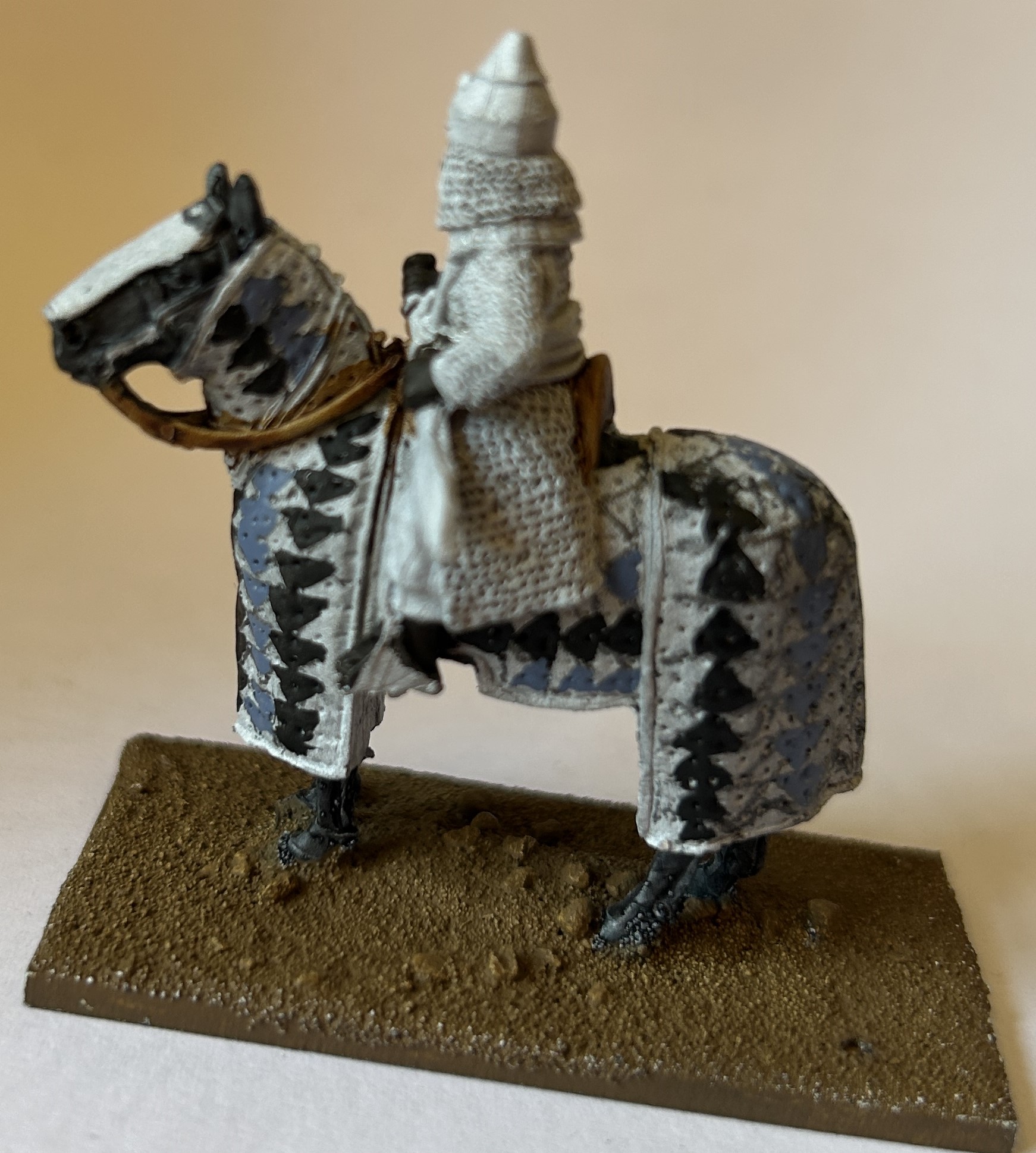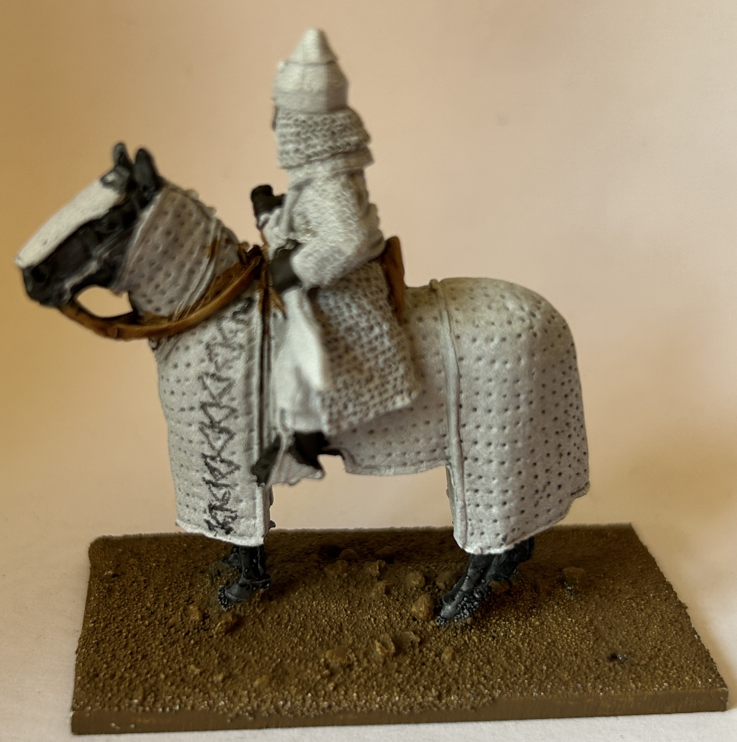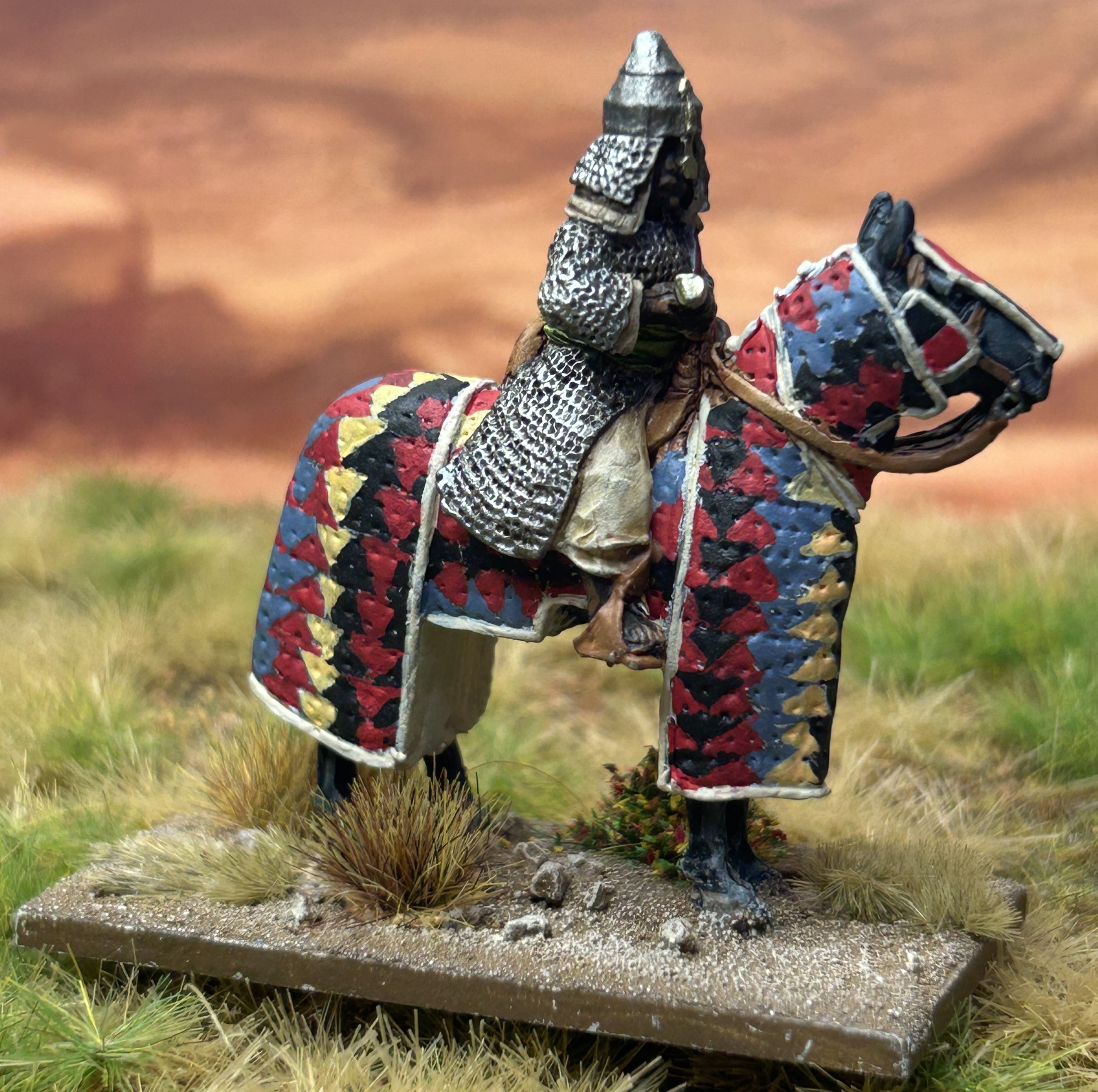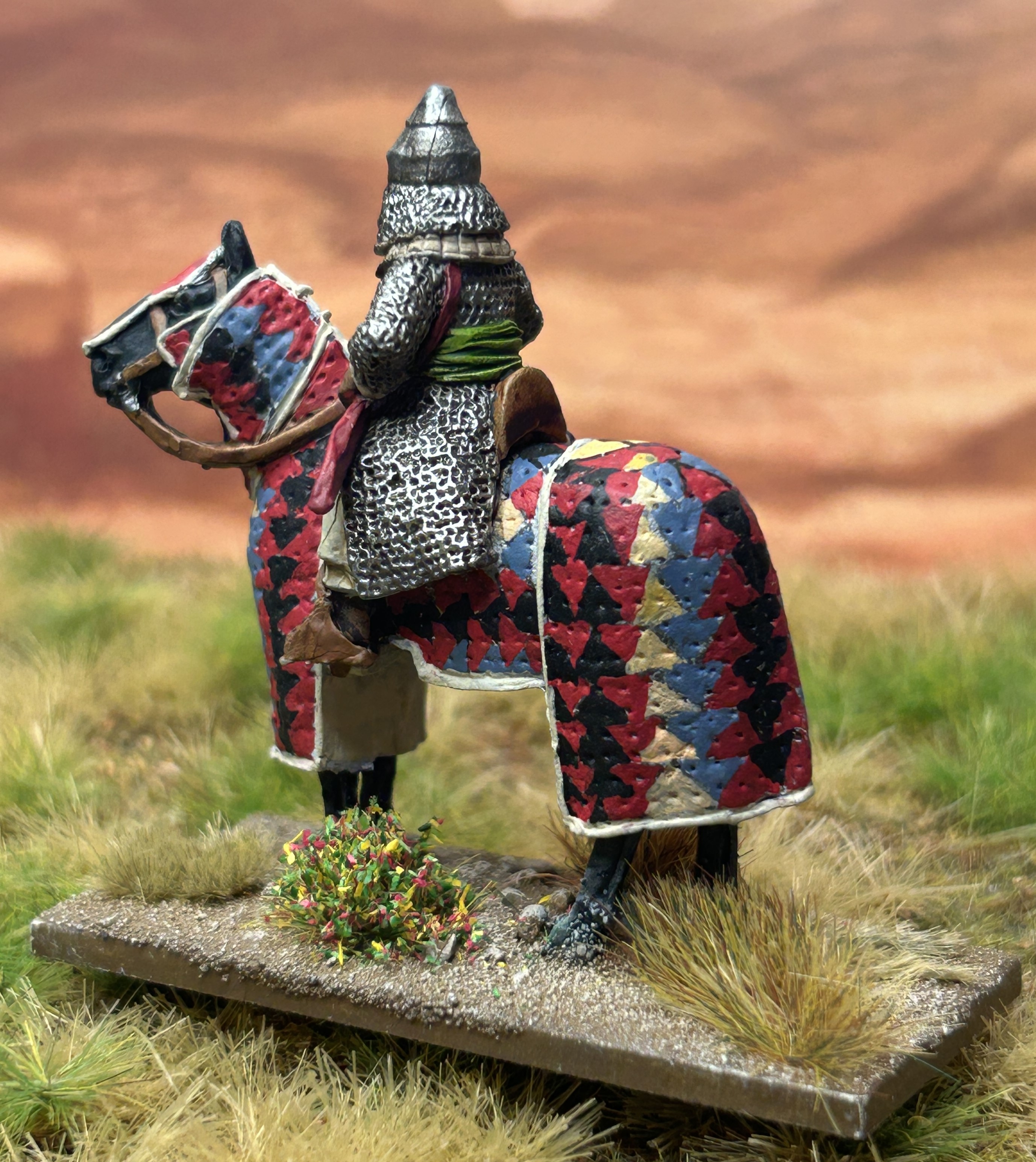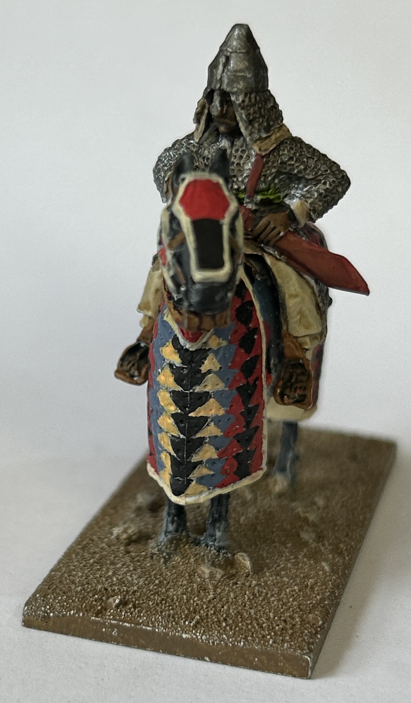 It is hard to get an idea of what it will look like until you get to this stage with all the colours on. I was plesantly surprised that it looked pretty good and the pattern is a good impression of the original with colours in the same order and place on the barding. The colours aren’t clear enough and some of the undercoat is showing through. Whlist this is accurate to the original this is probably due to the ravages of time so I’d like the colours clearer. While I did that I took the chance to make the triangle shapes clearer and tidied up the shapes at the top of the rump where the various sections converge.