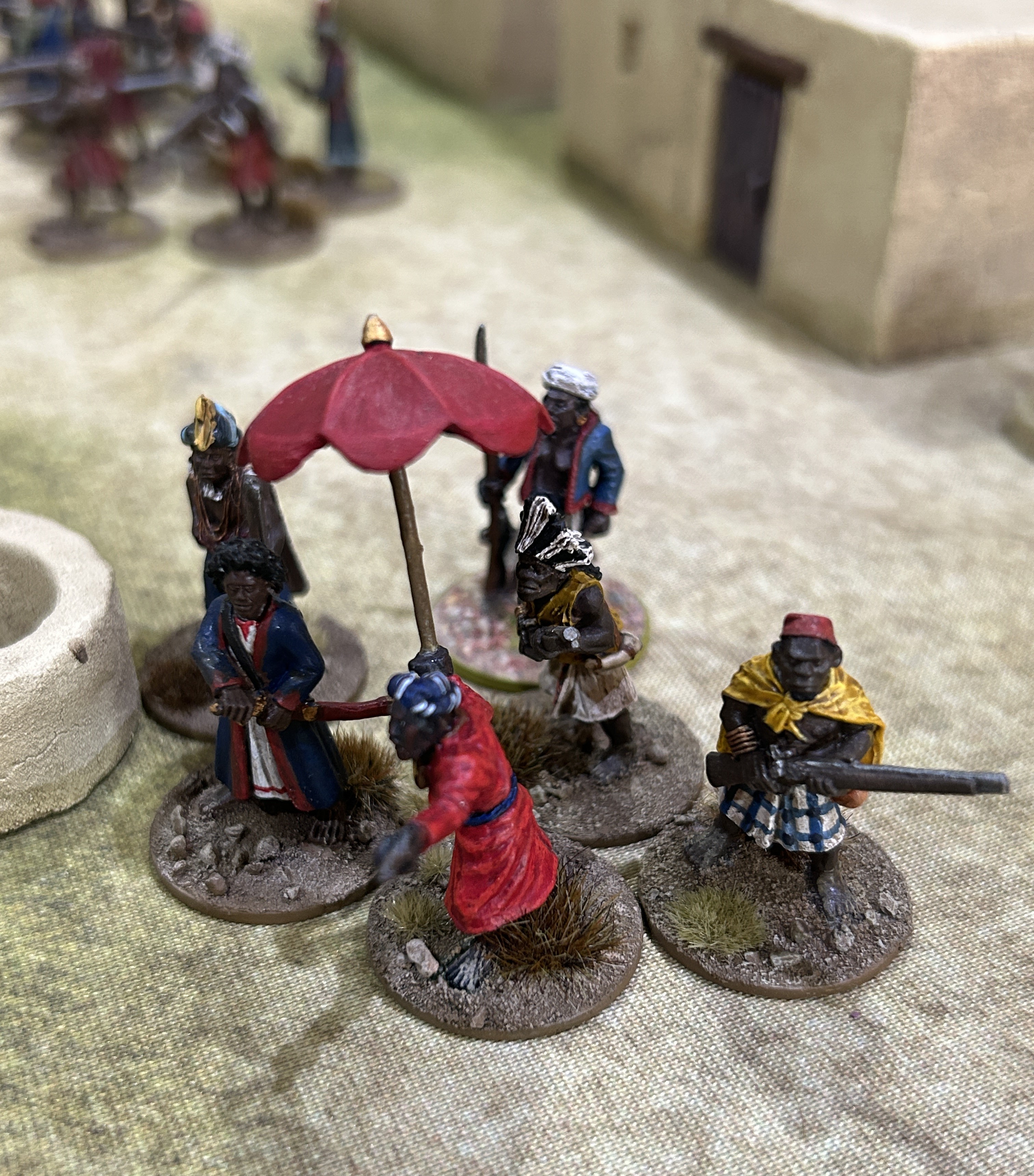 The leader is from Perry’s Mahdist range and wears the characteristic patched jibbah. Further west this garments still featured a range of colours/fabrics and often had additional patches attached, usually embellished with amulets and written scrolls acting as magical charms and wards. Therefore I’ve painted the jibbah with coloured patches to show the magical protection.