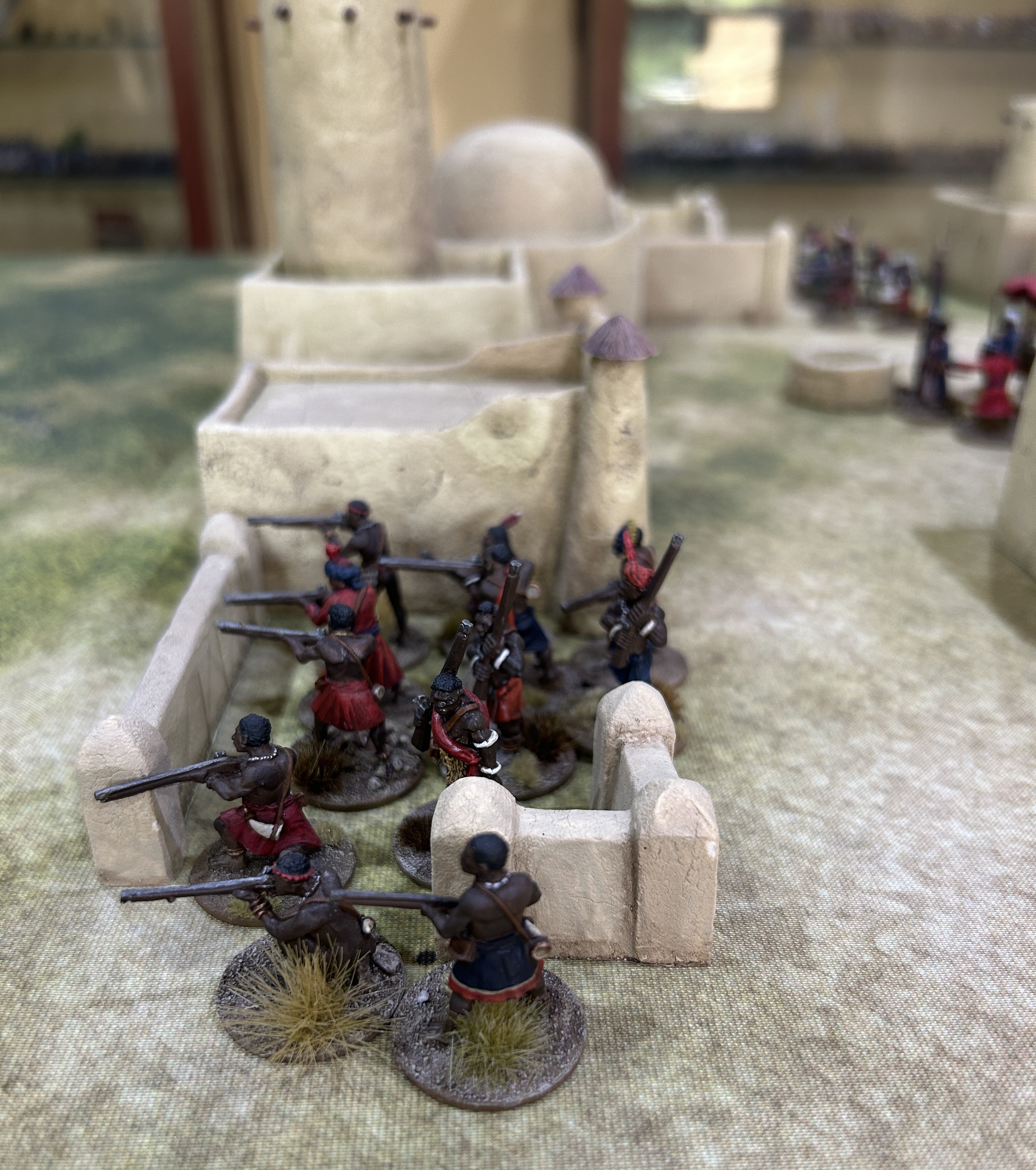 I’ve got the forces onto the table. Here the army of Bornu-Kanembu has been summoned to repulse an incursion of Ruga Ruga. The Ruga are led by the reknowned warlord Mirambo. They have taken a village (Fogou models, well spotted) and must now try to hold out against a superior attacking force. 300 points of Bornu-Kanembu against 200 points of Ruga Ruga under the Death in the Dark Continent rules.