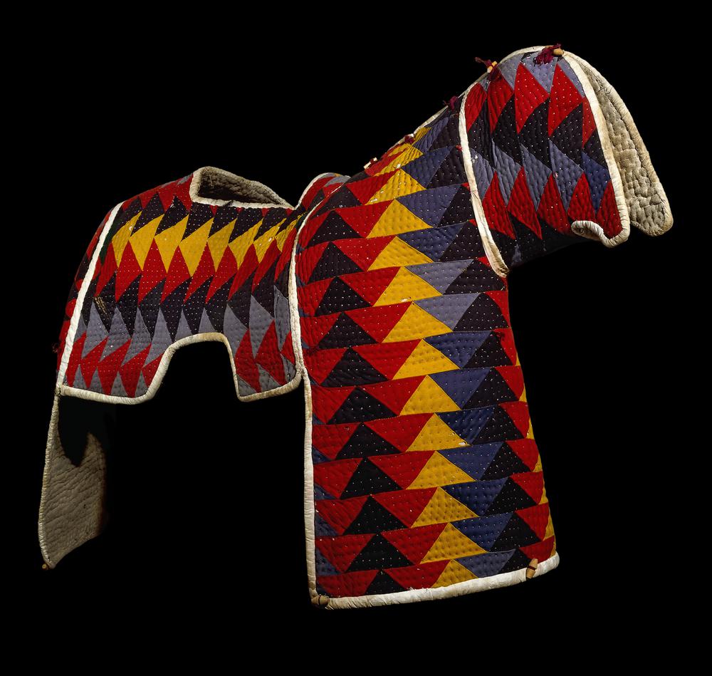 I’m a member of the British Museum and visit frequently when in London. They have a fantastic example of textile horse armour, reputedly taken after the battle of Omdurman in 1898. It is a very complex pattern of interlaced triangles but I thought I’d give it a go. The museum entry for the exhibit is here. It looks like this: