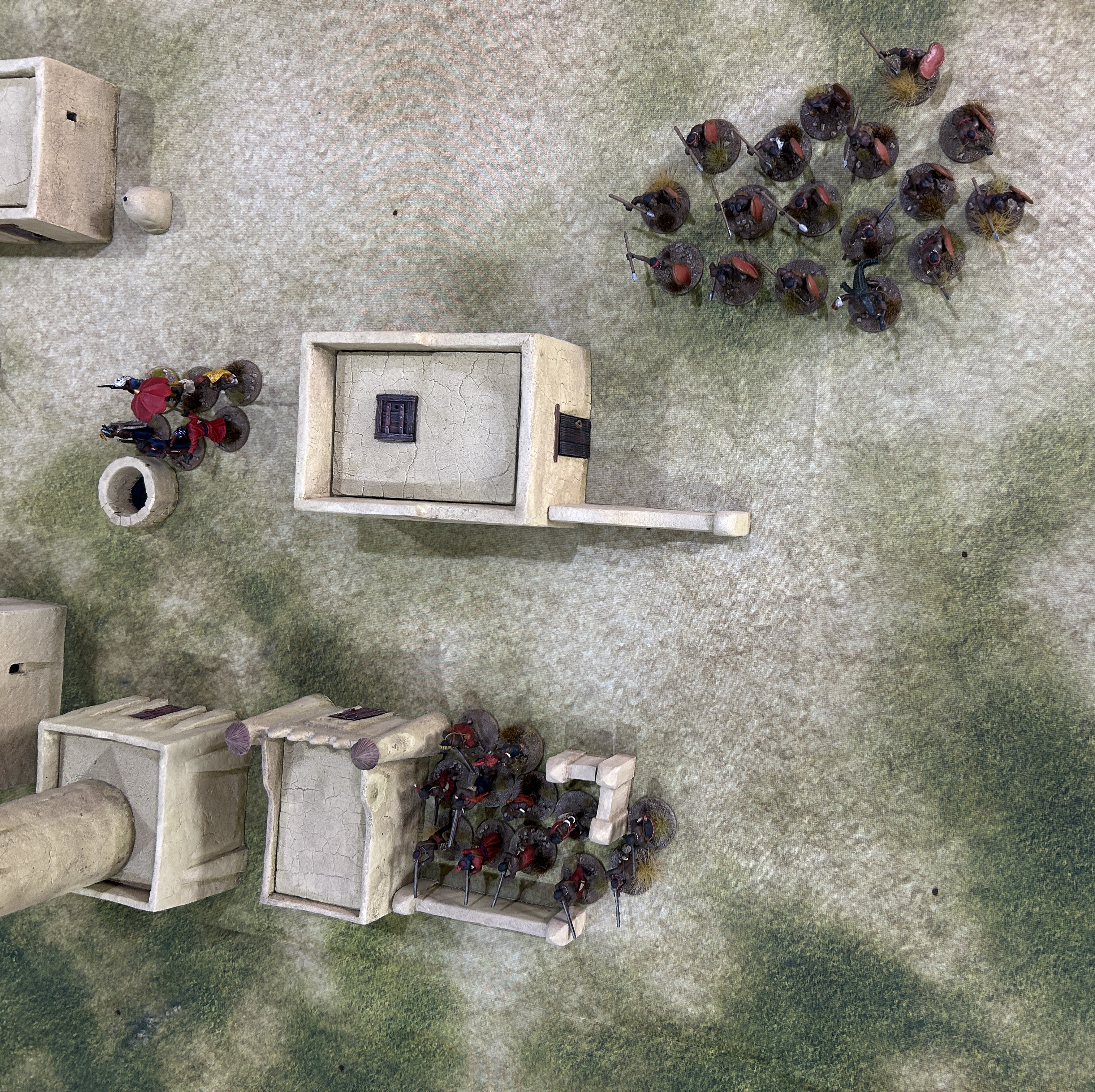 For their part the Ruga put their main warrior units in defensive array in the village with their (clearly expendable) Nyamwezi tribal allies on the open left flank. Mirambo and his bodyguards take up a position in reserve ready to respond if the line weakens.