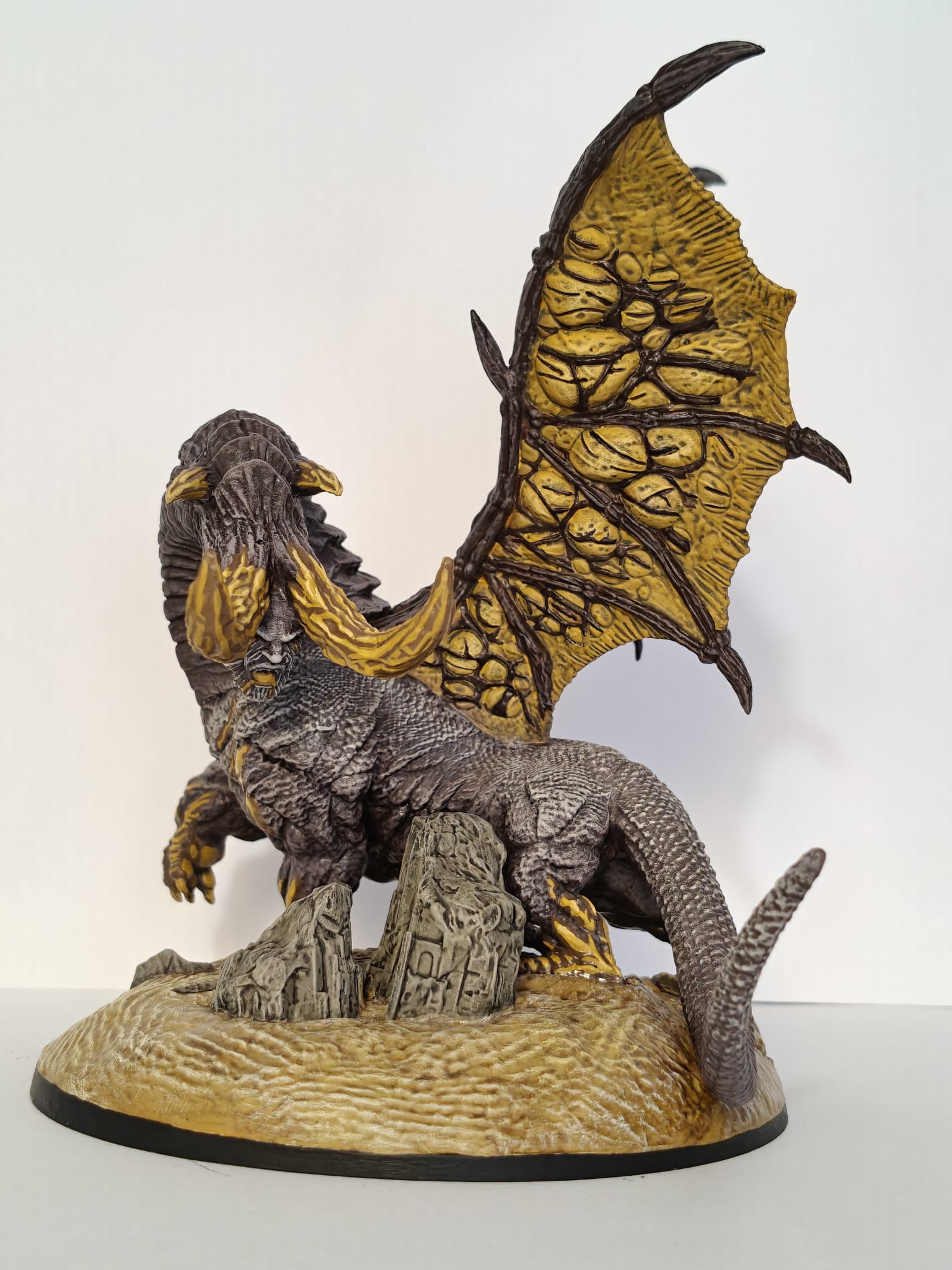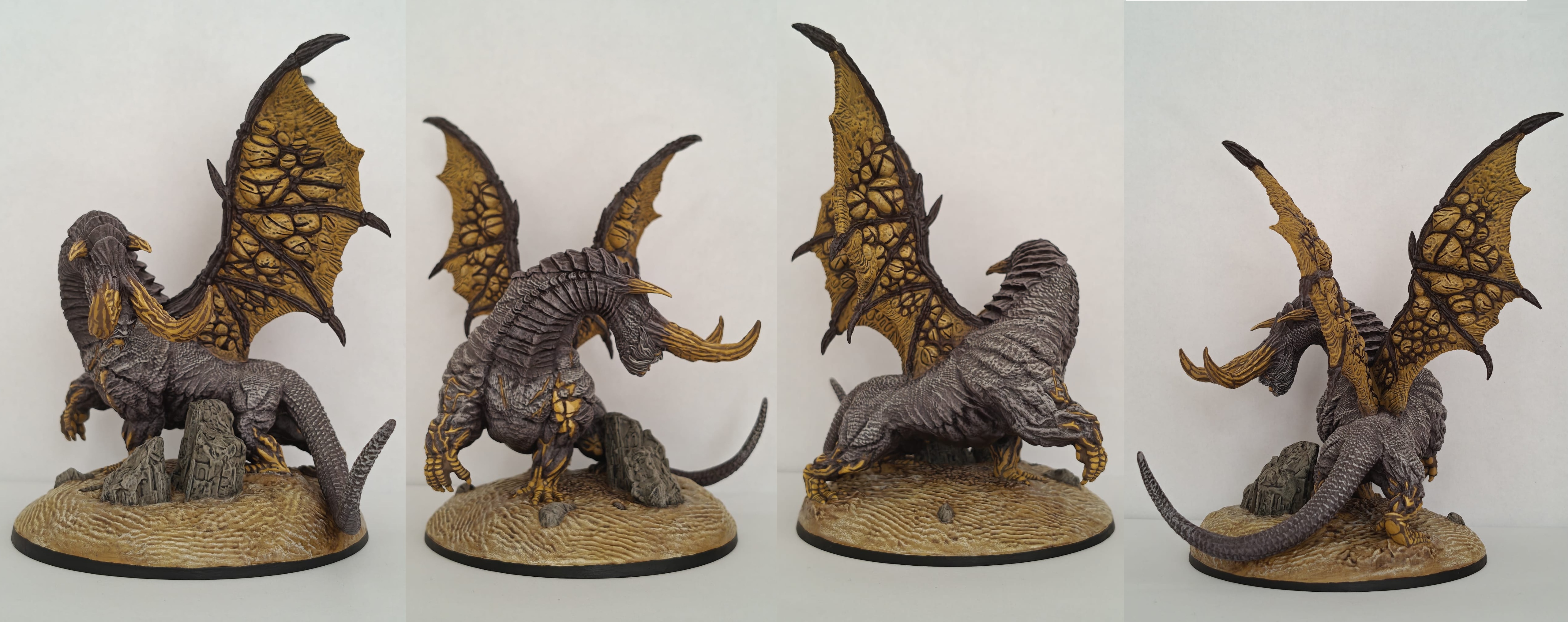 This miniature also took a while to paint. Was kinda struggling with how I wanted the wings and how to paint the gold parts without actually using metallic paints. Using a metallic gold to paint the golden claws for example felt off to me. So I opted to using golden brown colors and work my way from there. Painting the body was not that difficult, because it had quite some texture that made it possible to drybrush the highlights. That saved some time, but the wings and the golden parts had to be done by hand. That took the most time here.
