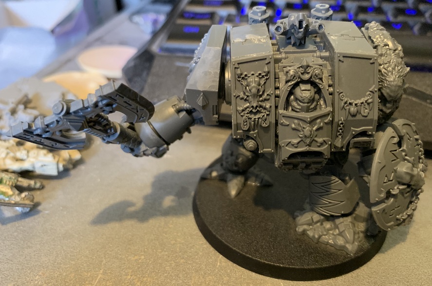 So fun thing: I figured early on in 10th Edition 40k that I’d be proxying my previously painted Contemptor as a baseline SW Ven Dreadnought, given GW chose to send Contemptors in 40k to Legends this edition (pour one out for all those lovely HH kits). But the Sons of Fenris have oh-so-many options for their Dreadnoughts. Given the ill-omen withwhich they hold the Contemptor chassis, what would the odds be that the pilot of one might fall to the Curse Of The Wulfen? We know from the Golden Bannana Boys that the Contemptor lends itself well to carrying over-sized weapons, so I figured I’d try and make an especially dynamically posed Wulfen Dread, running and in full swing.