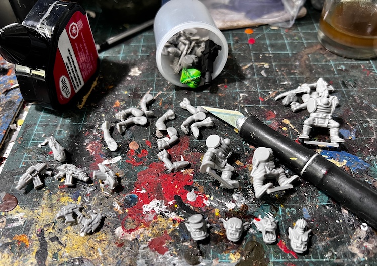 So I found some of the original Gorkamorka bases on eBay so ordered them. They are smaller than the usual Oak bases and not round with the idea being it is easier to pack the Trukks full of Boyz if the bases aren’t in the way. Since I have all kinds of old Ork bits I figured I could make some new ones. Gorkamorka parts are a little smaller than the original plastic works but I’m sure it will look fine as Orks are a goofy lot after all.