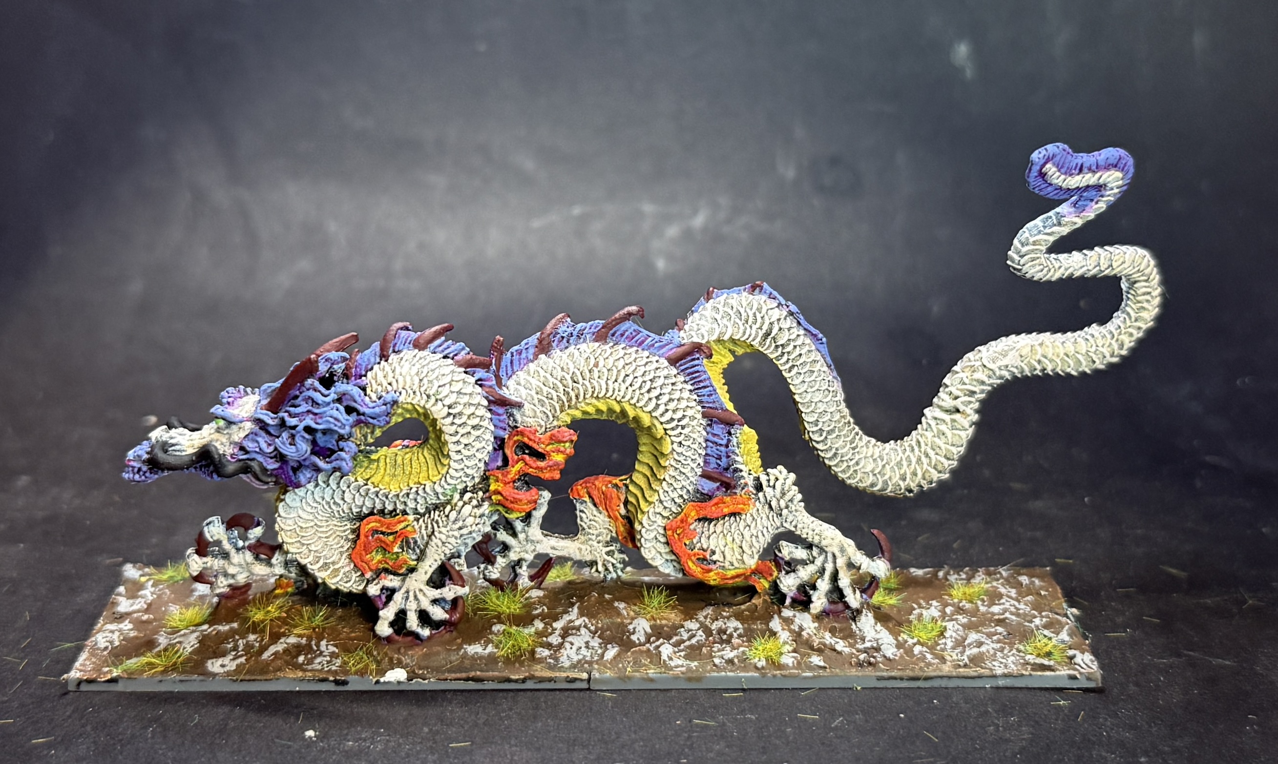 My work week is coming to a close and squeezed in a bit of painting. The dragon is done, very pleased with the serpentine nature of it. Also one of those bits of scatter terrain is finished as well… thank god.